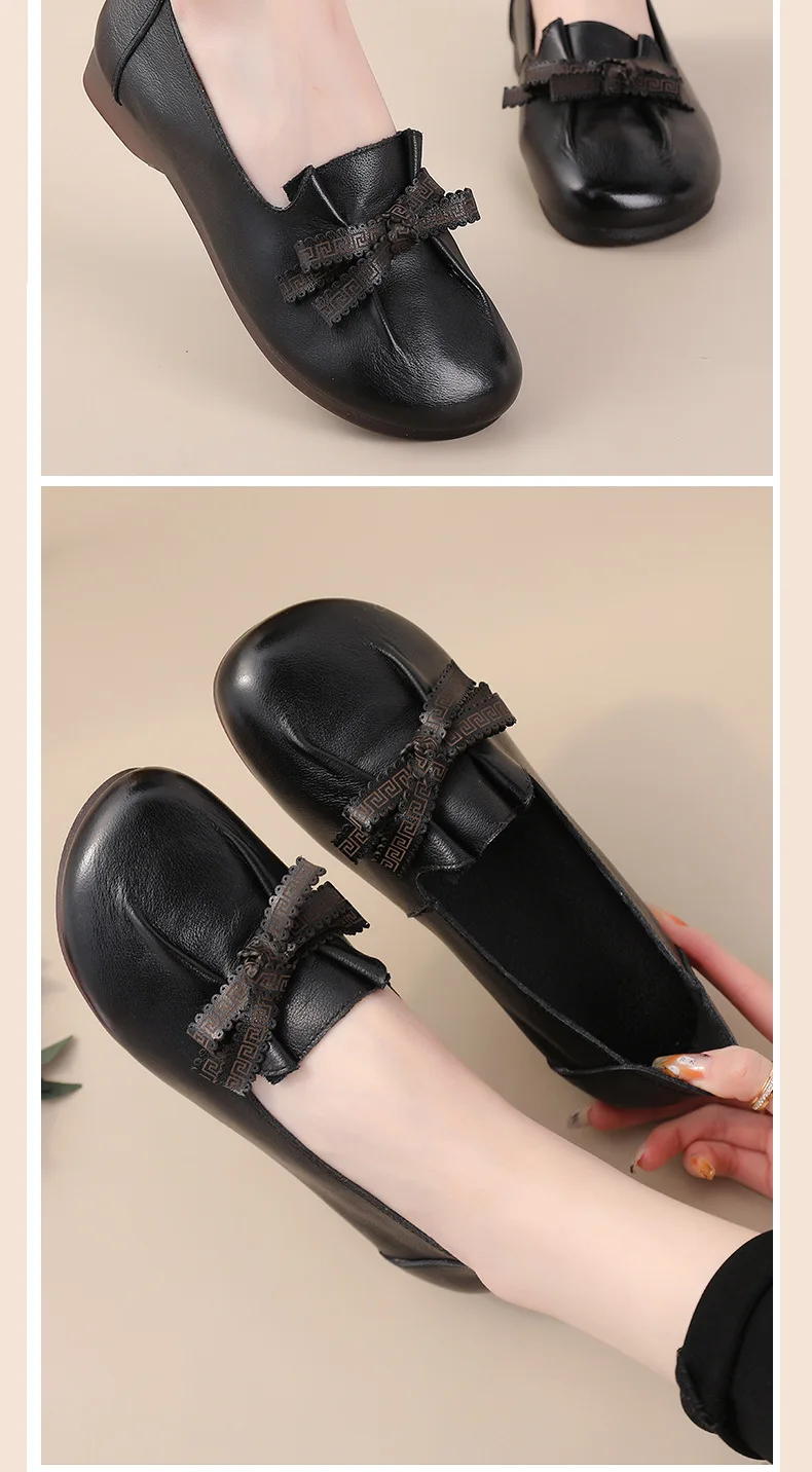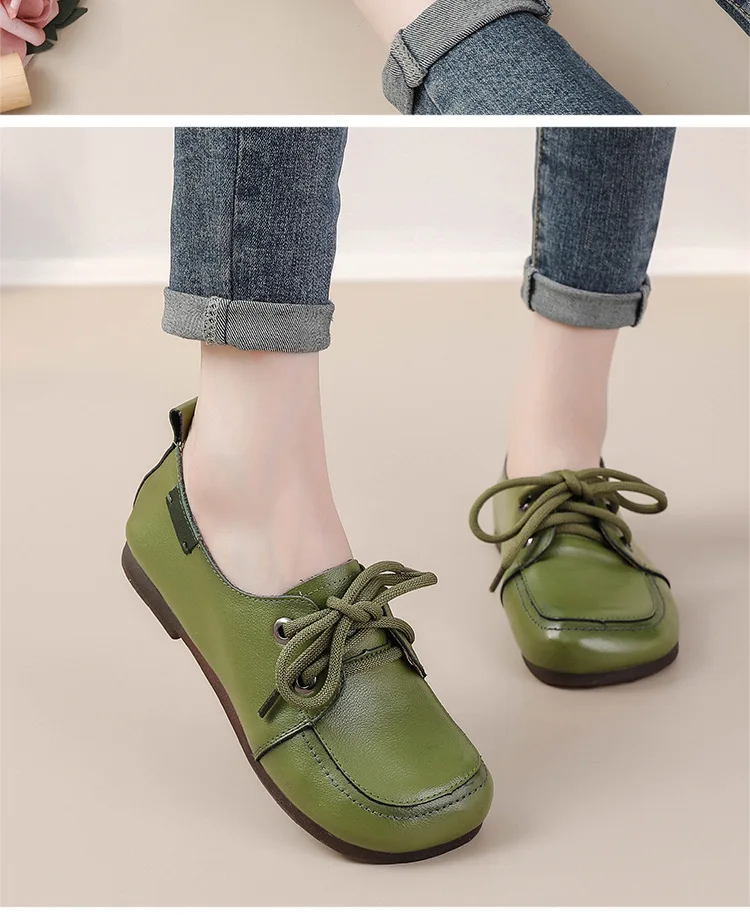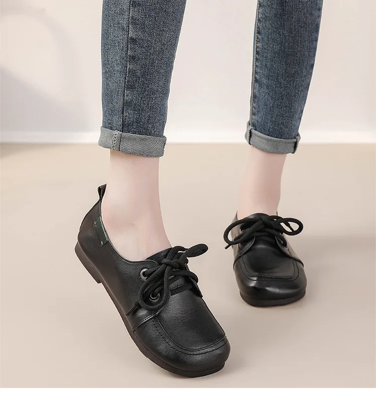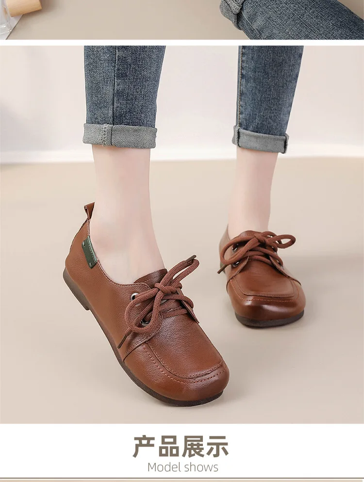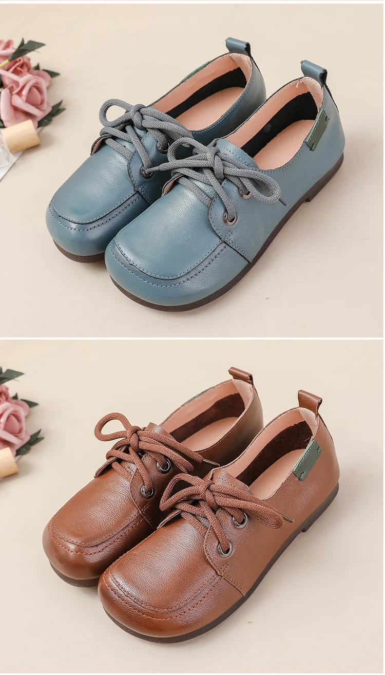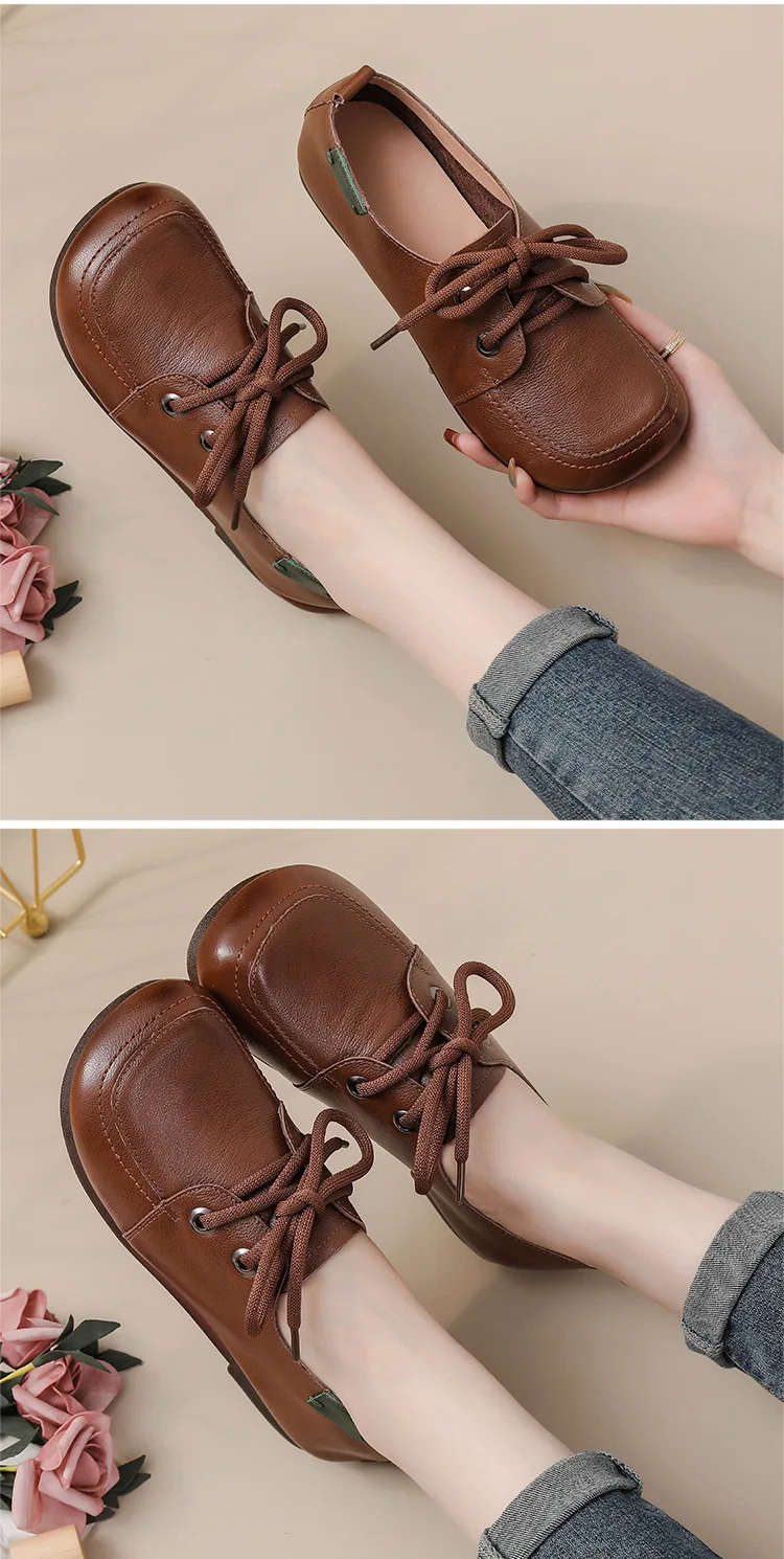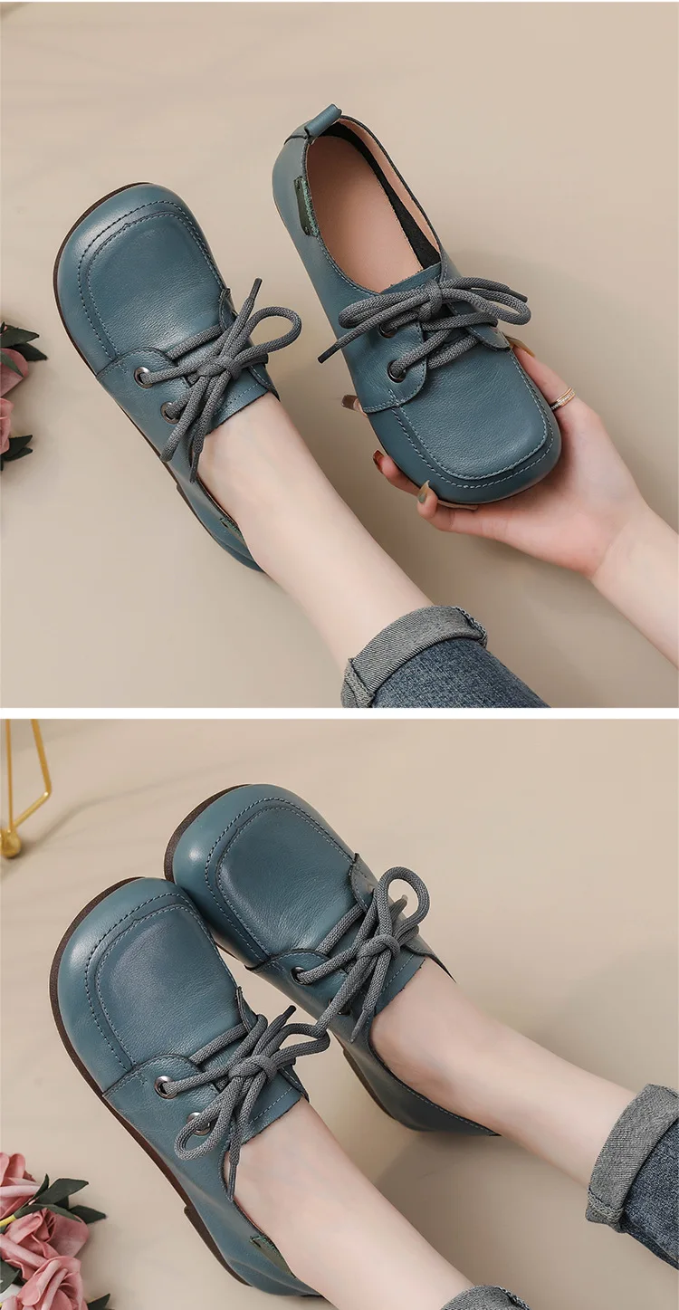 Vintage Plain Oxfords Shoes Women's Genuine Leather Flats Ladies Laced Up Moccasins Elderly Woman Square Toe Driving Loaferss