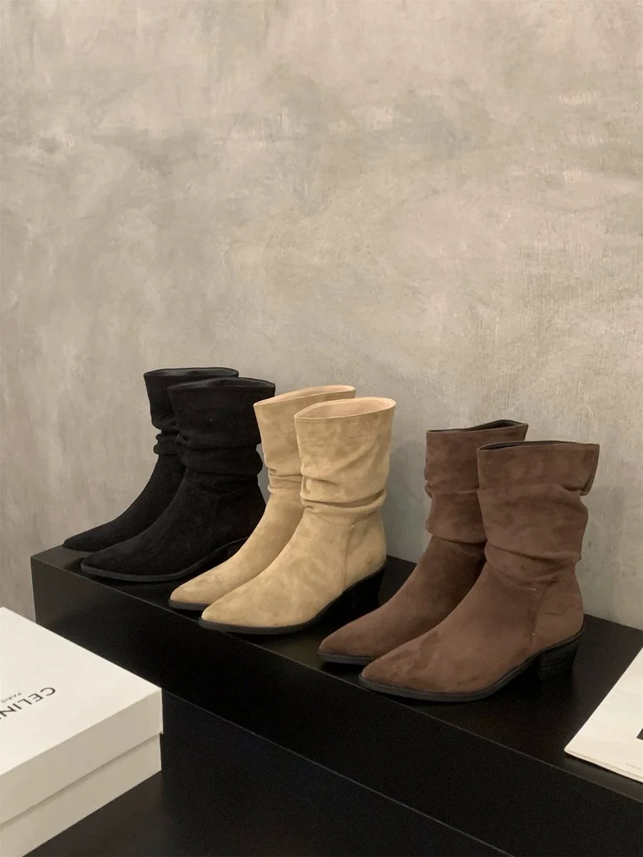 Vintage Pointed Toe Women Ankle Boots Fashion Elegant Soft Suede Shoes Autumn Winter Low Heel Women's Short Booties D423
