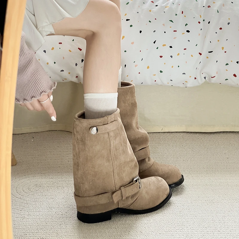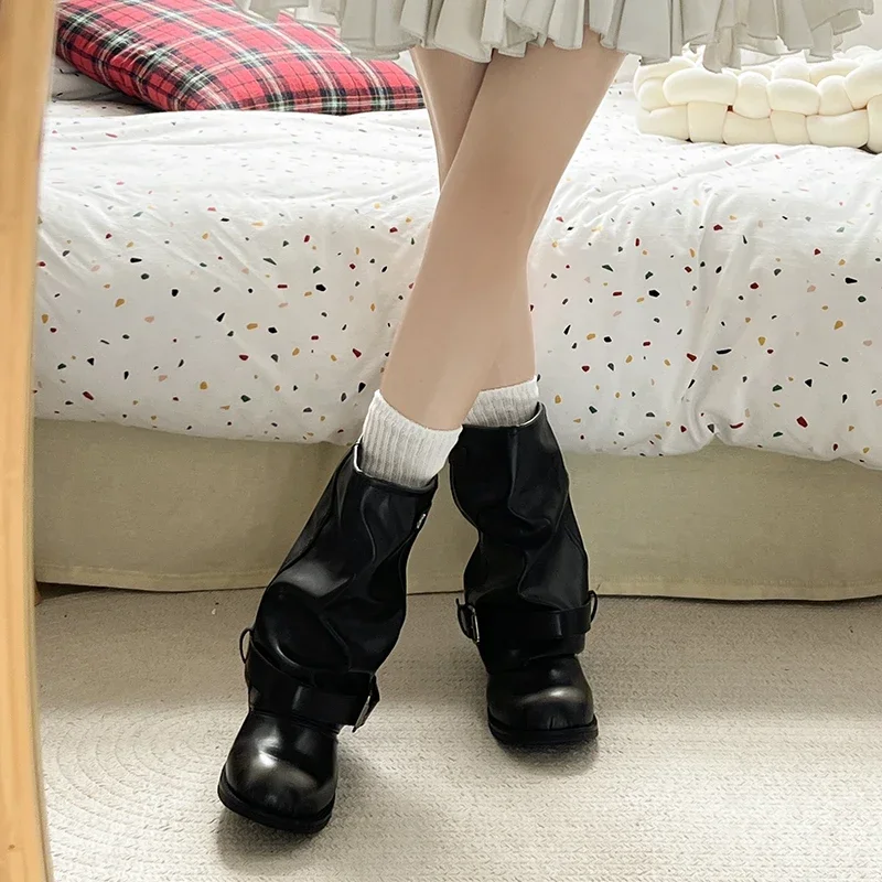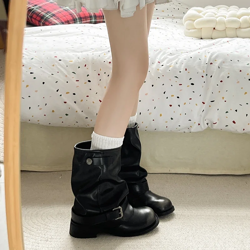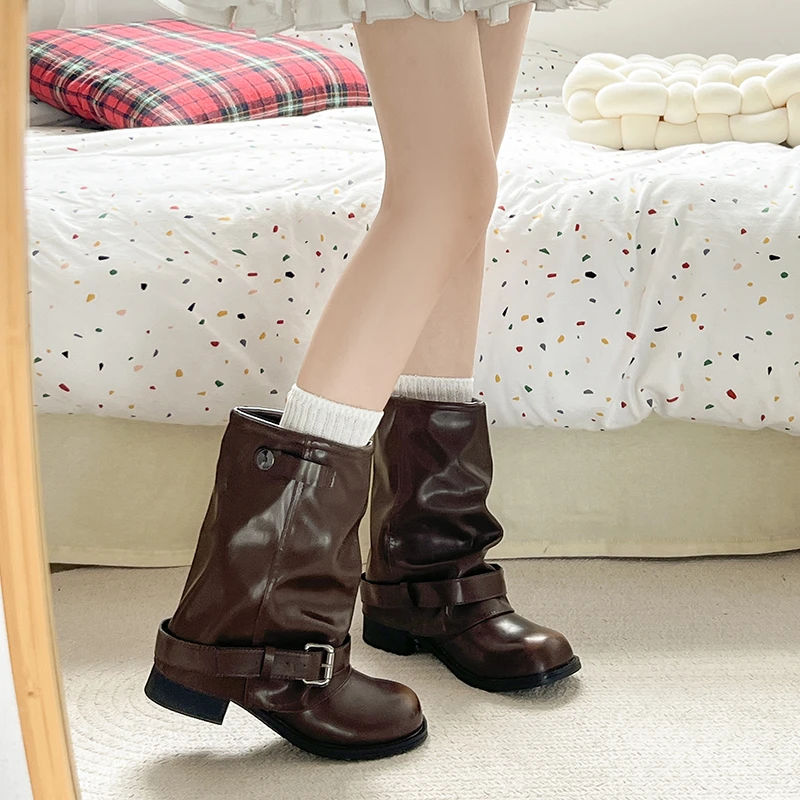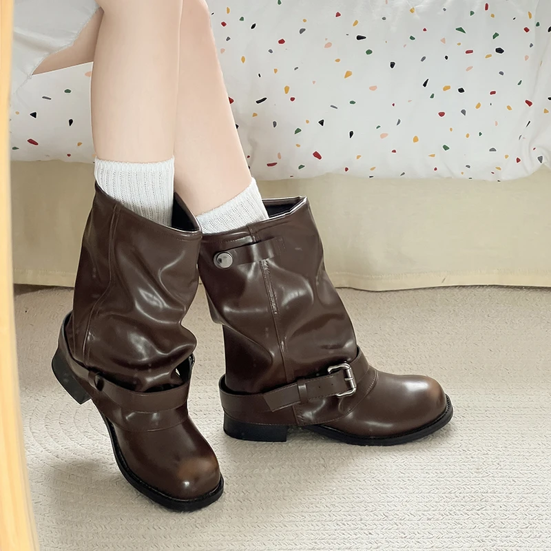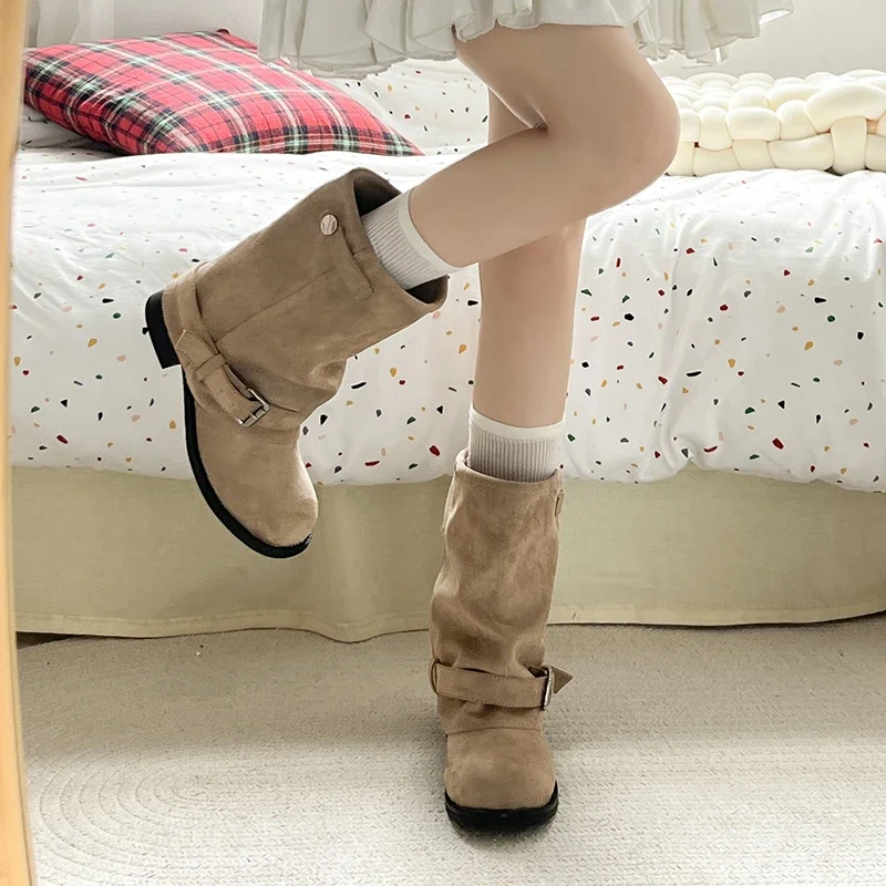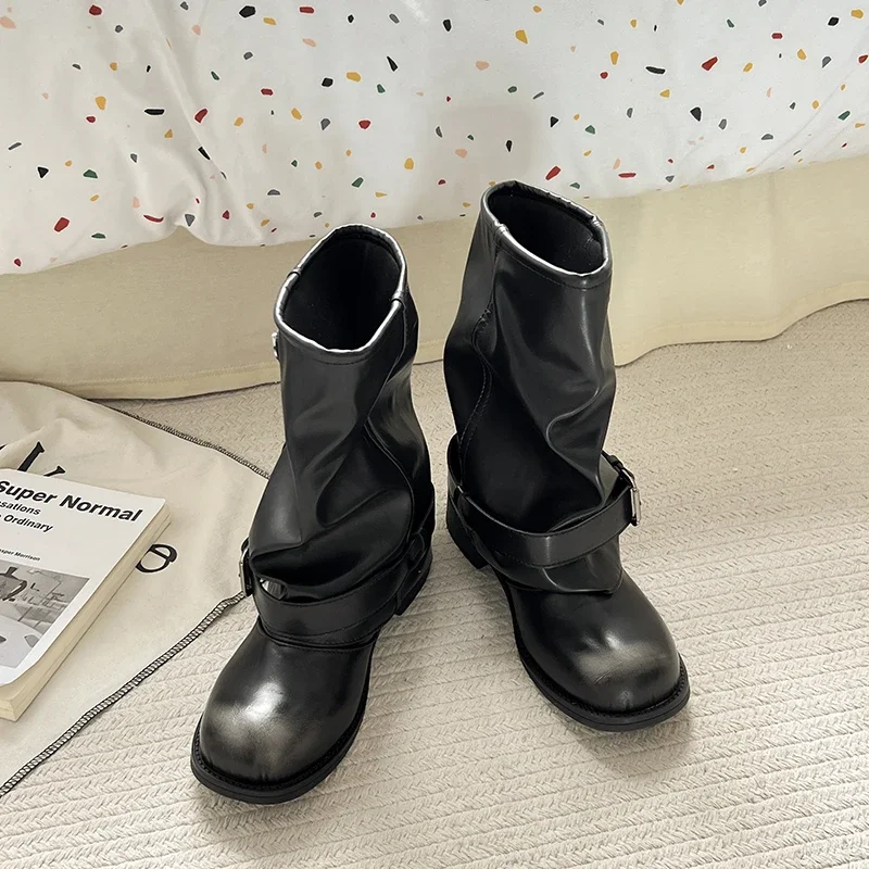 Vintage Thick Heel Women Western Cowboy Boots Fashion Belt Buckle Slip On Shoes Ladies Pleated Short Booties Autumn Winter