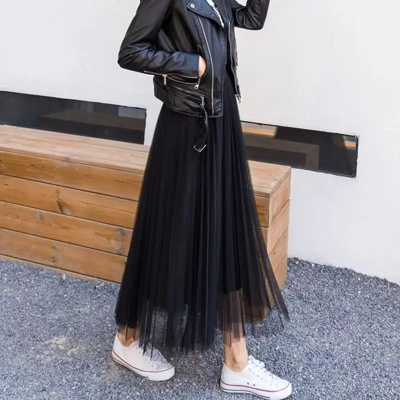 Vintage Tulle Skirt Women Streetwear Elastic High Waist Mesh Pleated Skirts Summer Elegant Korean A Line Office Ladies Skirt New