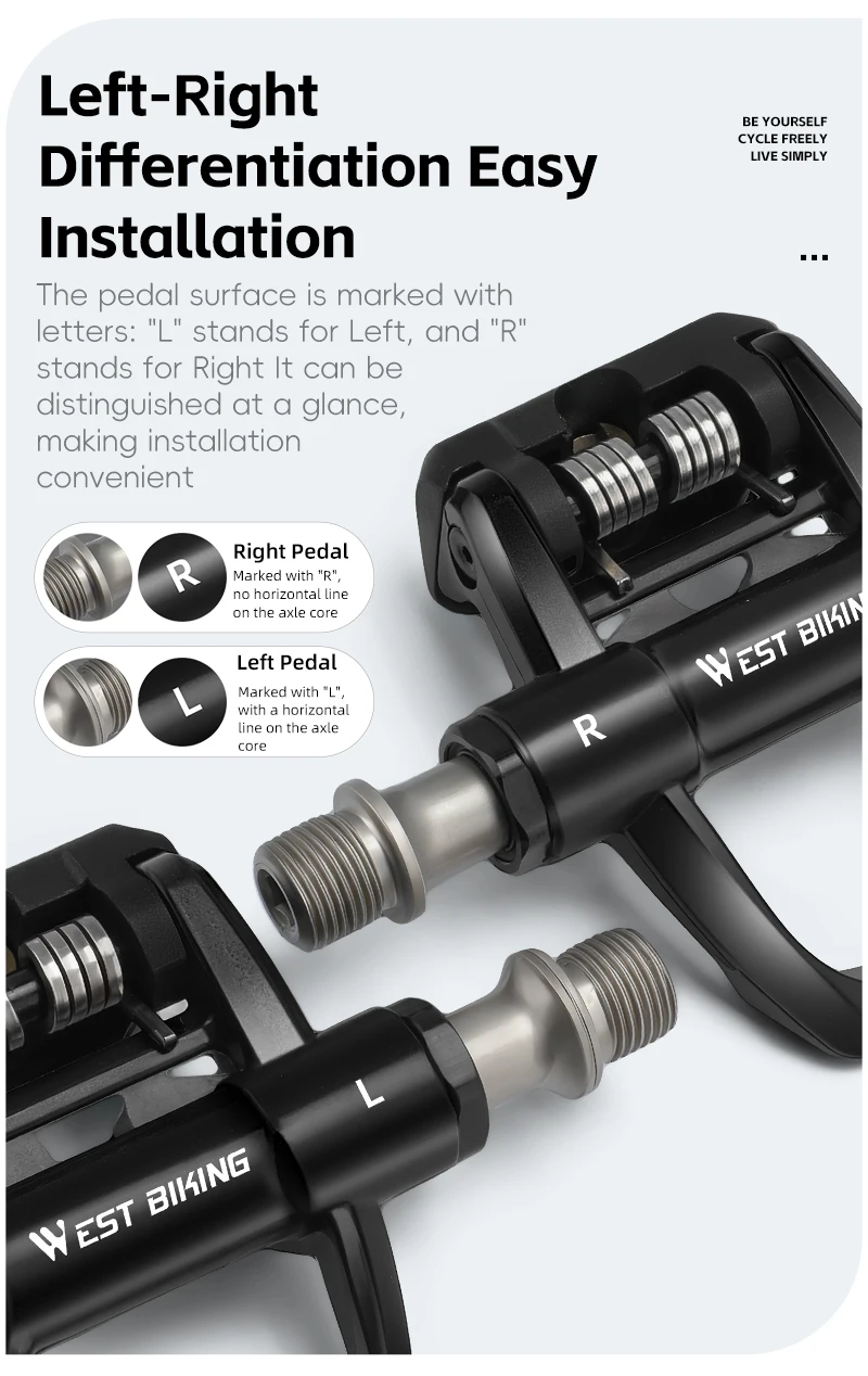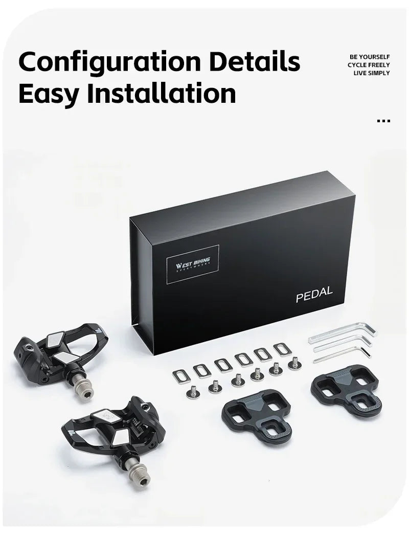 The WEST BIKING Road Bike Pedals feature a self-locking pedal design, ensuring secure footing during cycling.