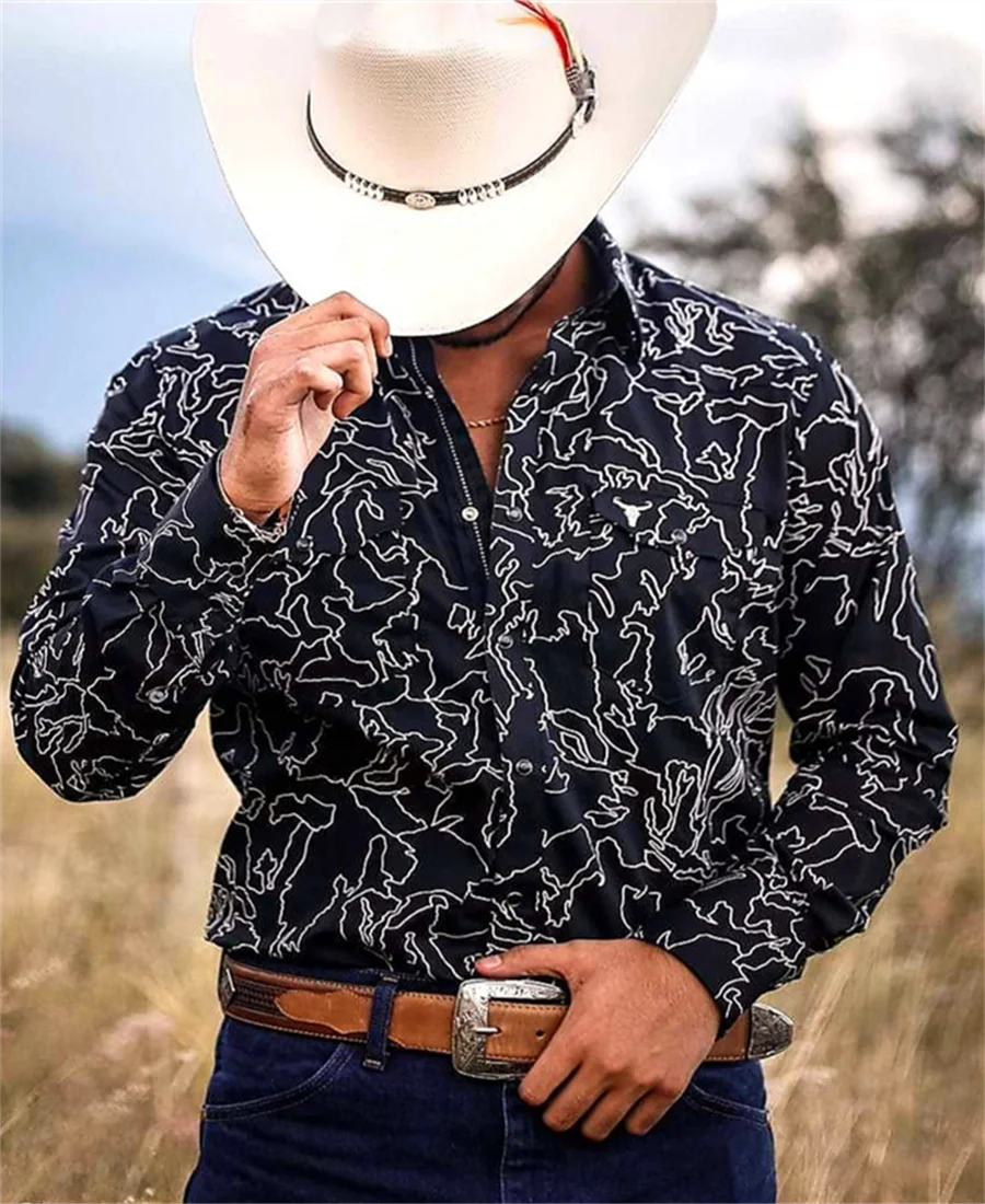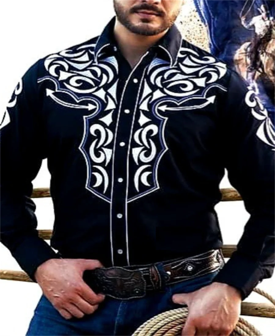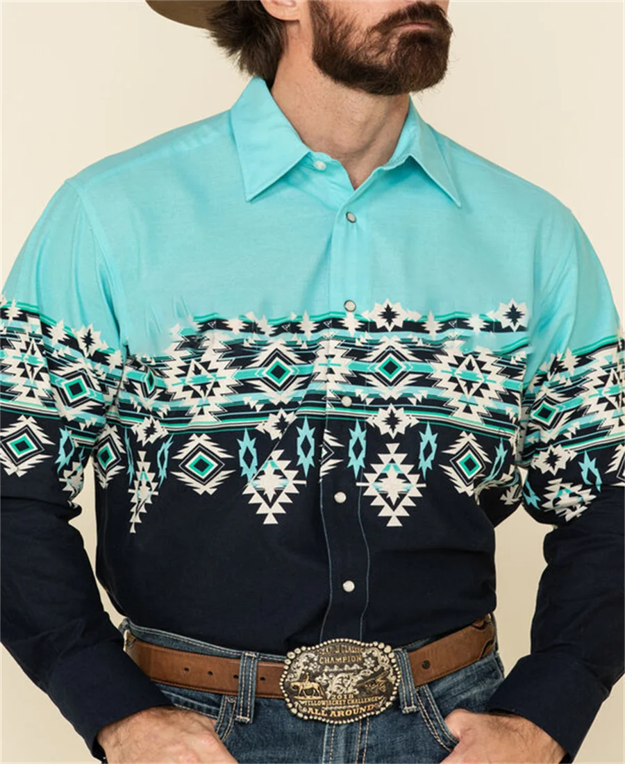 Western Tribal Shirt Denim Men's Casual Outdoor Party HD Pattern Button Soft Comfortable Lapel Shirt Long Sleeve T-Shirt