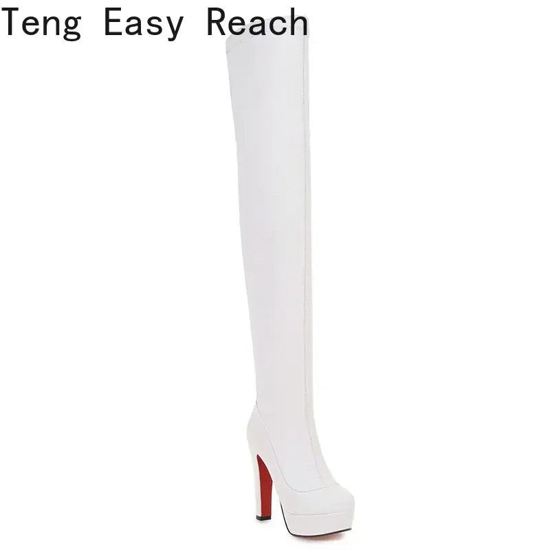 White Platform Women Boots Stertch Pu Leather Over The Knee Boots Fashion Square High Heel Long Boots Autumn Winter Zip Shoes