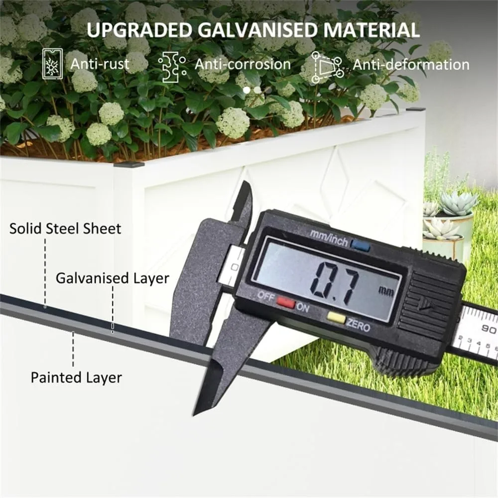 Specification: - Color: White - Materials: Galvanized Steel - Overall Dimension: 35.4" W x 15.7" D x 47.2" H - Planting Area: 33.5" W x 13.8" D x 10.8" H - Trellis Size: 35.4" W x 27.6" H - Leg Height: 3.1" - Weight Capacity: 110 lbs. - Steel Plate Thickness: 0.7 mm