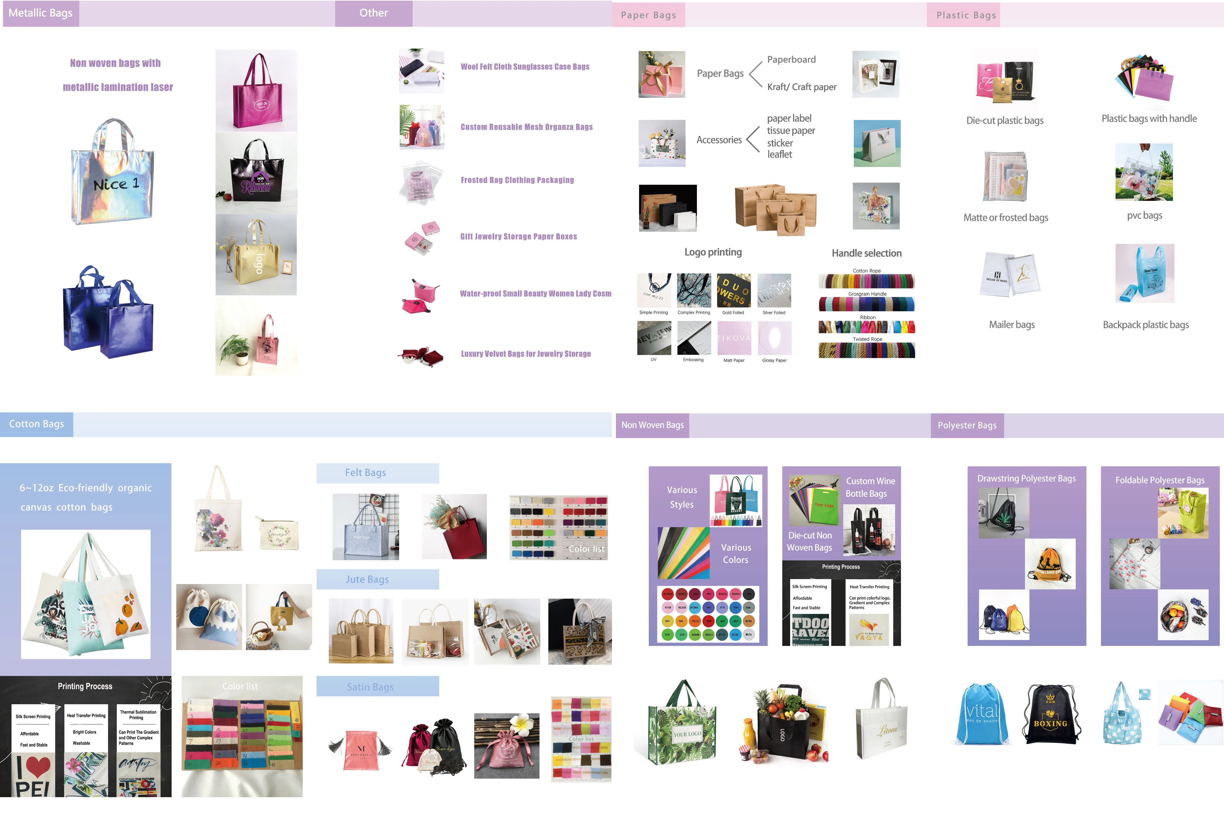 A: Gift paper bags,paper boxes,mailer bags,non woven bags,cotton bags,plastic bags,felt bag,hang tags etc.