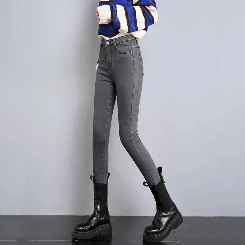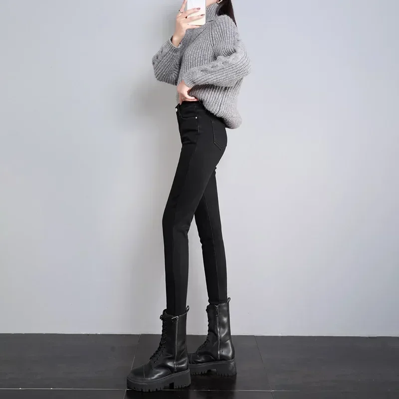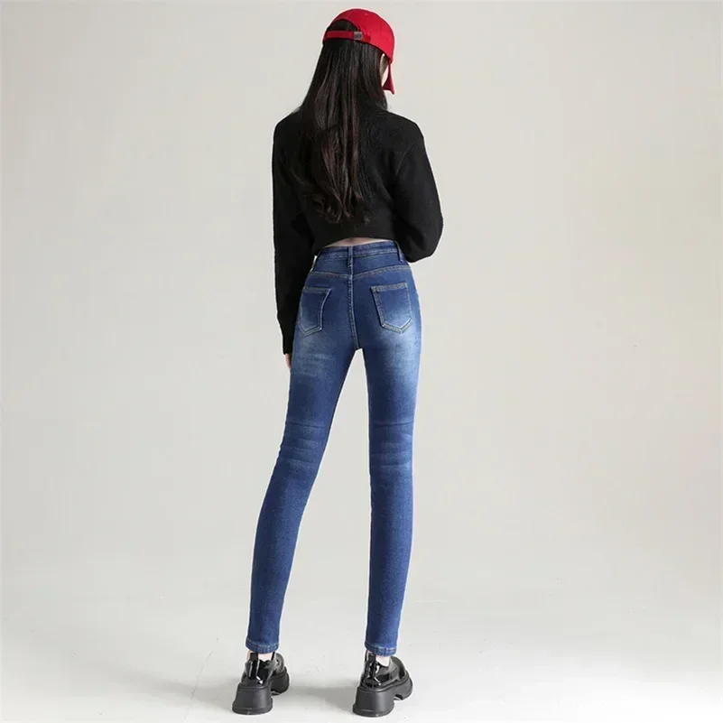 Winter Lady Thermal Plush Jeans Snow Warm Stretch Jeans Hot Sale High Waist Fleece Pants Female Straight Leg Denim Trousers