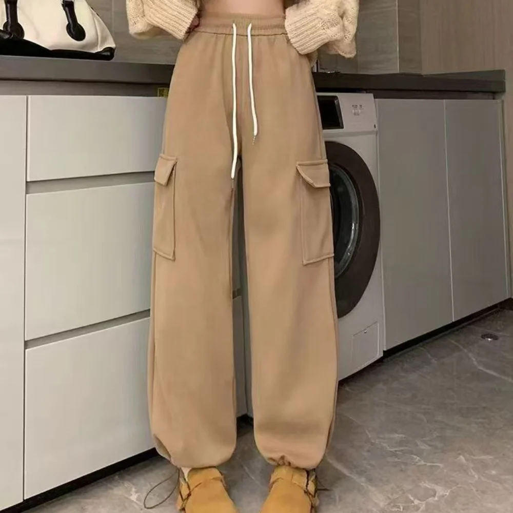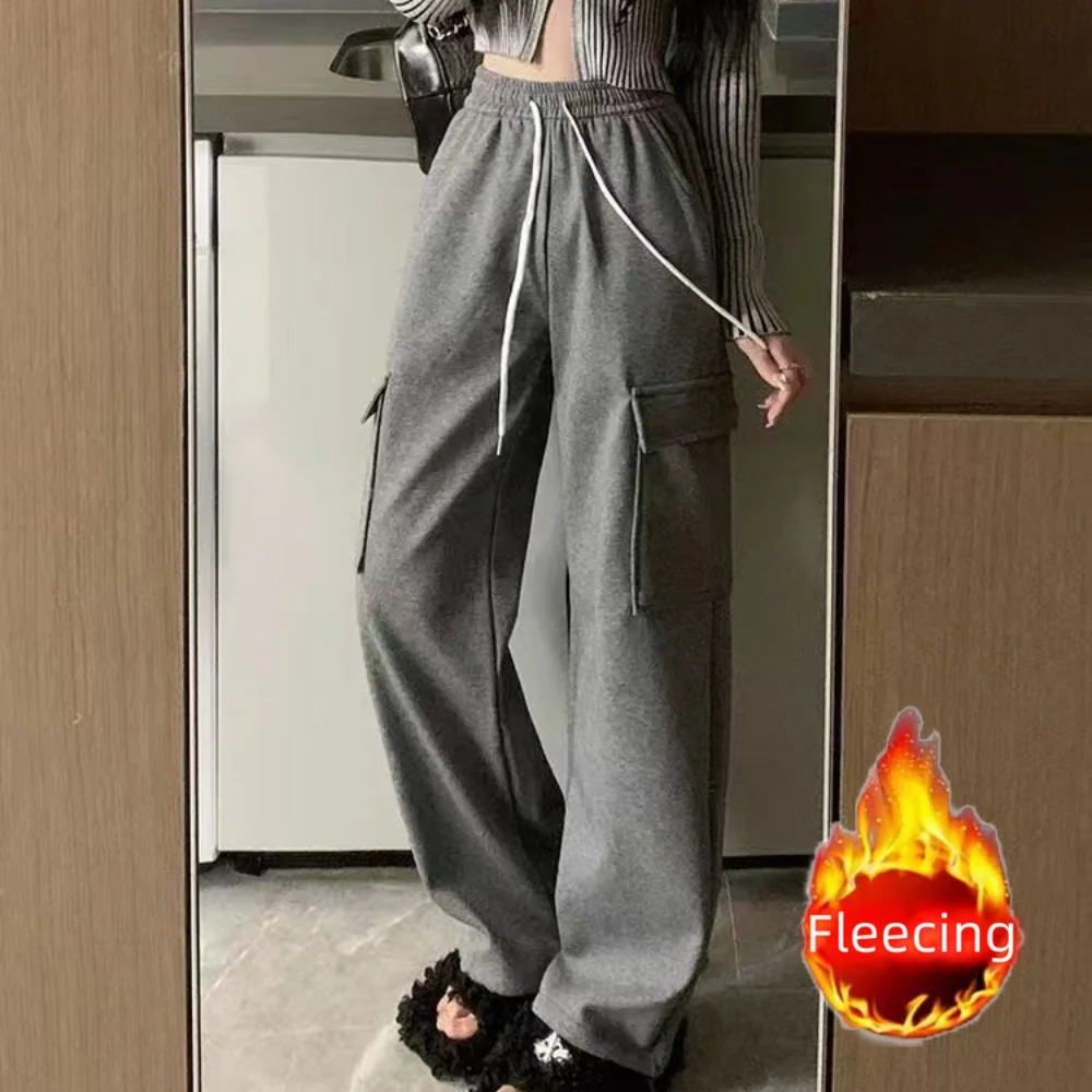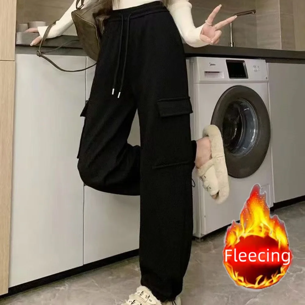Winter Thick Fleece Women's Pants Casual Matching Cargo Pants Chic Sportswear Drawstring Straight Pants Lady's Trousers Pocket