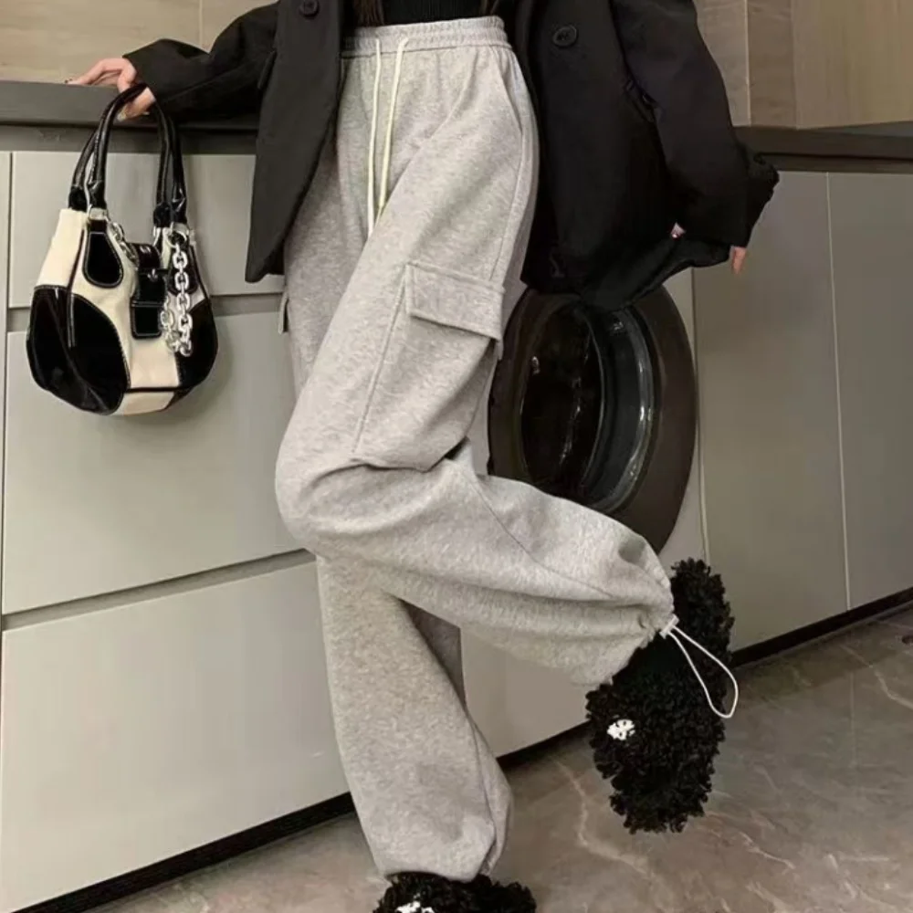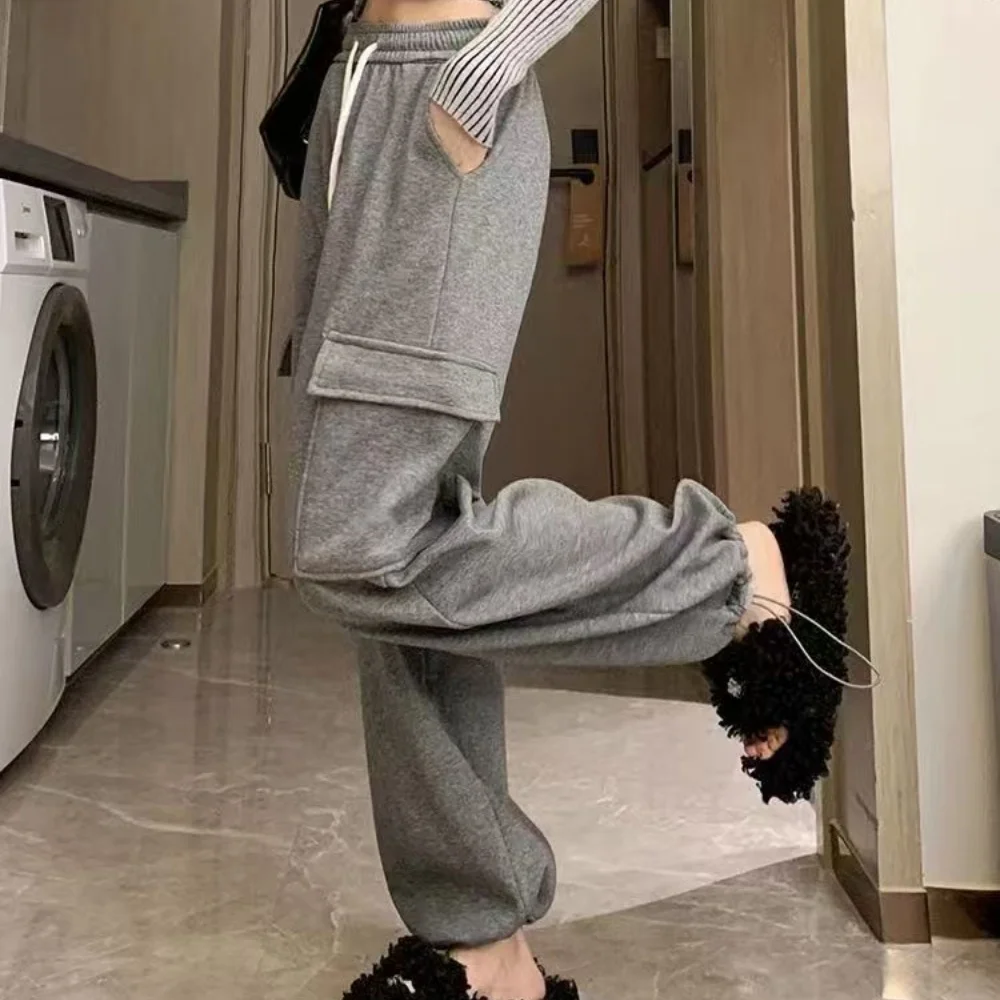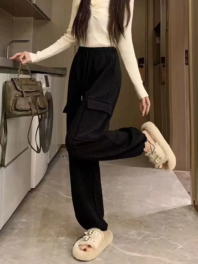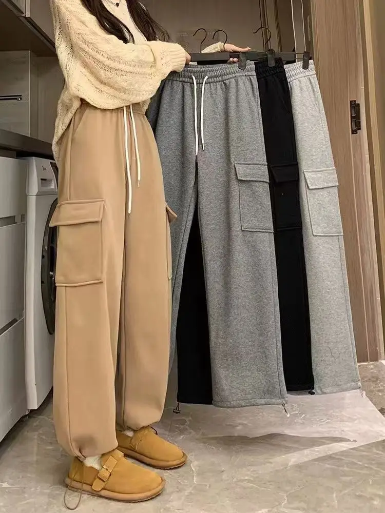 Winter Thick Fleece Women's Pants Casual Matching Cargo Pants Chic Sportswear Drawstring Straight Pants Lady's Trousers Pocket