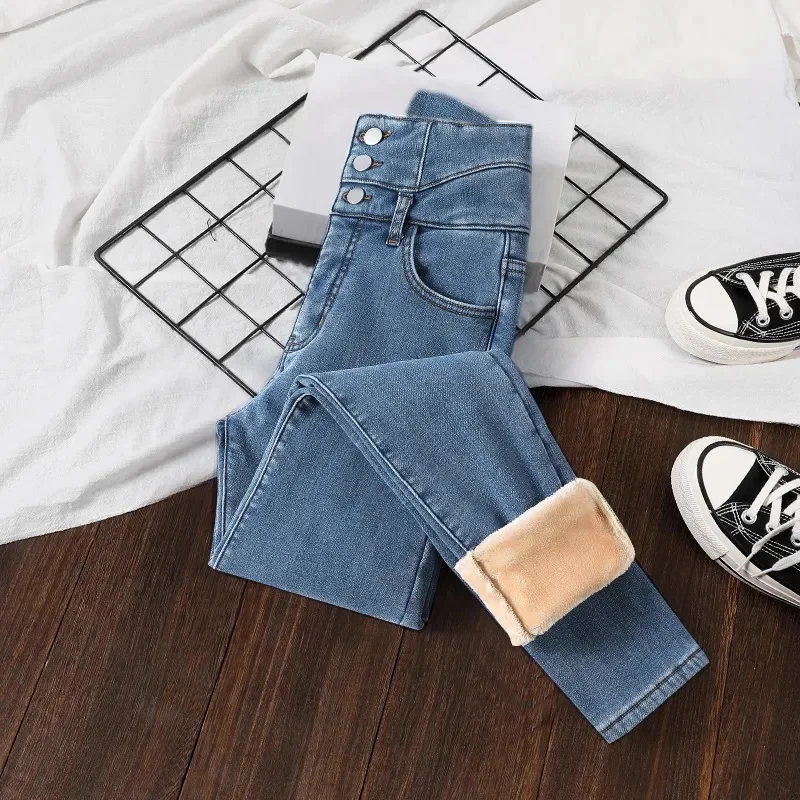 Winter Thick Velvet Women High Waist Skinny Jeans Simple Fleece Warm Slim Fit Stretch Ladies Casual Slim Denim Pencil Pants Y2K