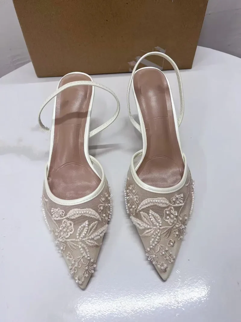 Woman Designer Mesh Open Heel Sandals Shoes Fashion Print Pointed End Women High-heel Pumps Sexy Stiletto Lady Mules