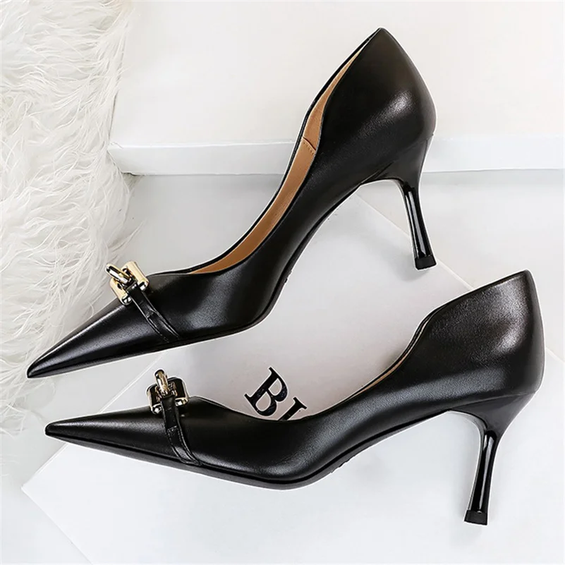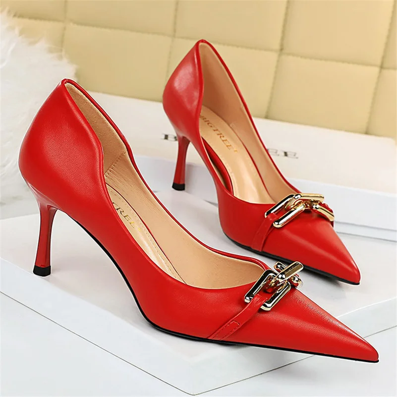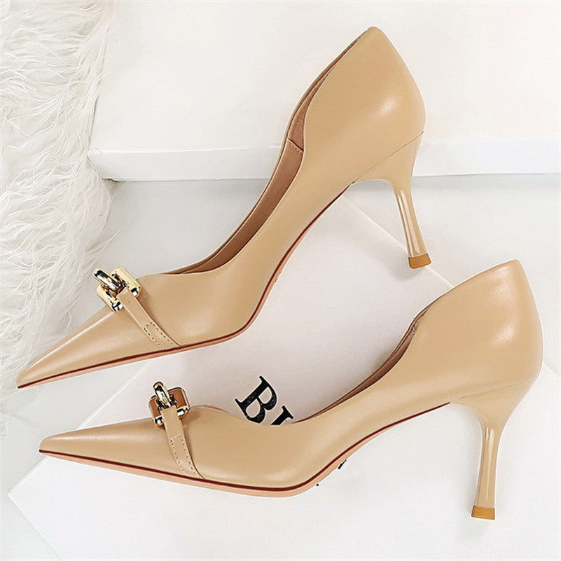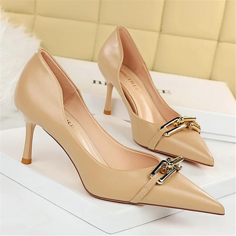 Women 7cm High Heels Pumps Lady Scarpins Fetish Nightclub Blue Nude Low Heels Wedding Party Metal Chain Buckle Fetish Prom Shoes