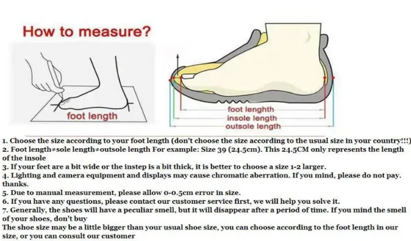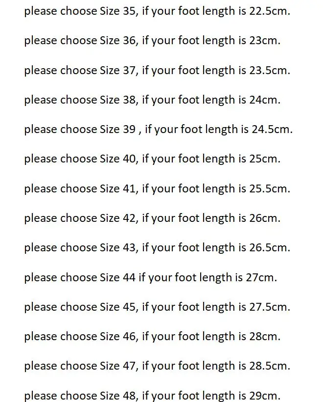 Before purchasing, please check the size chart based on the length of your feet and choose the size you need Choose the size according to your foot length (don't choose the size according to the usual size in your country!!!)