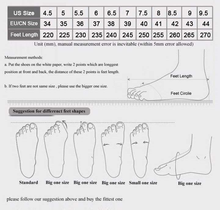 Note 1 We are using Chinese size Carefully measure your foot length and select the size based on the length of the foot. If there is any problem with the size, please indicate your foot length on the order page, thank you Note 2: Colors on your computer monitor may differ slightly from actual product colors, It depends on your monitor settings Note 3: Item Measure by hand, it could be 0.1-0.2cm different, your kind understanding will be much appreciated |