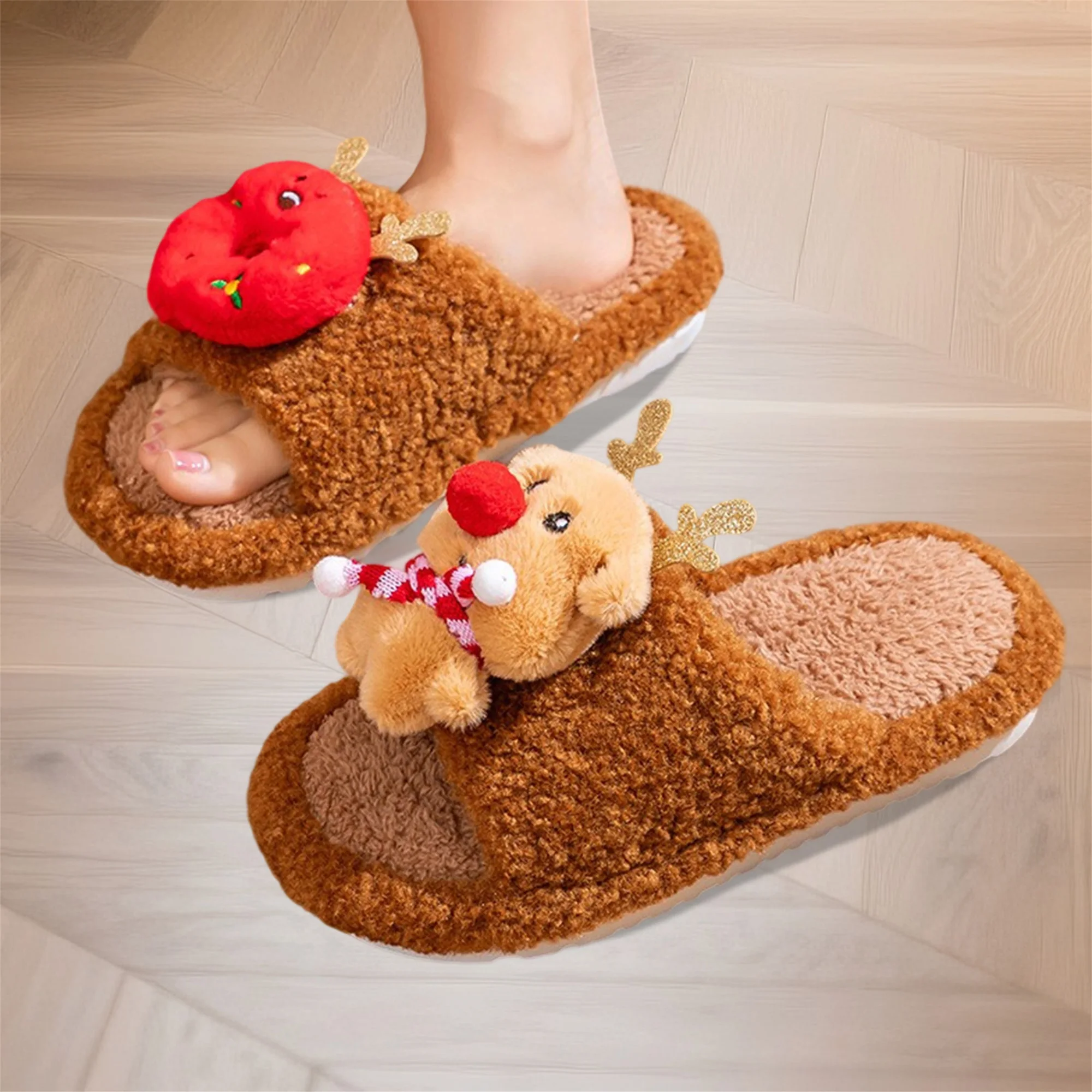 Christmas Slides for Women Fuzzy 3D Cartoon Doll Bedroom Slippers Non-Slip Bottom House ShoesFeatures: