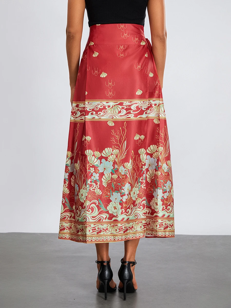 Women's Horse Face Skirt Elegant Phoenix Character Flower Print Pleated Tie Up A-Line Long Swing Skirt National ClothingSize(cm)