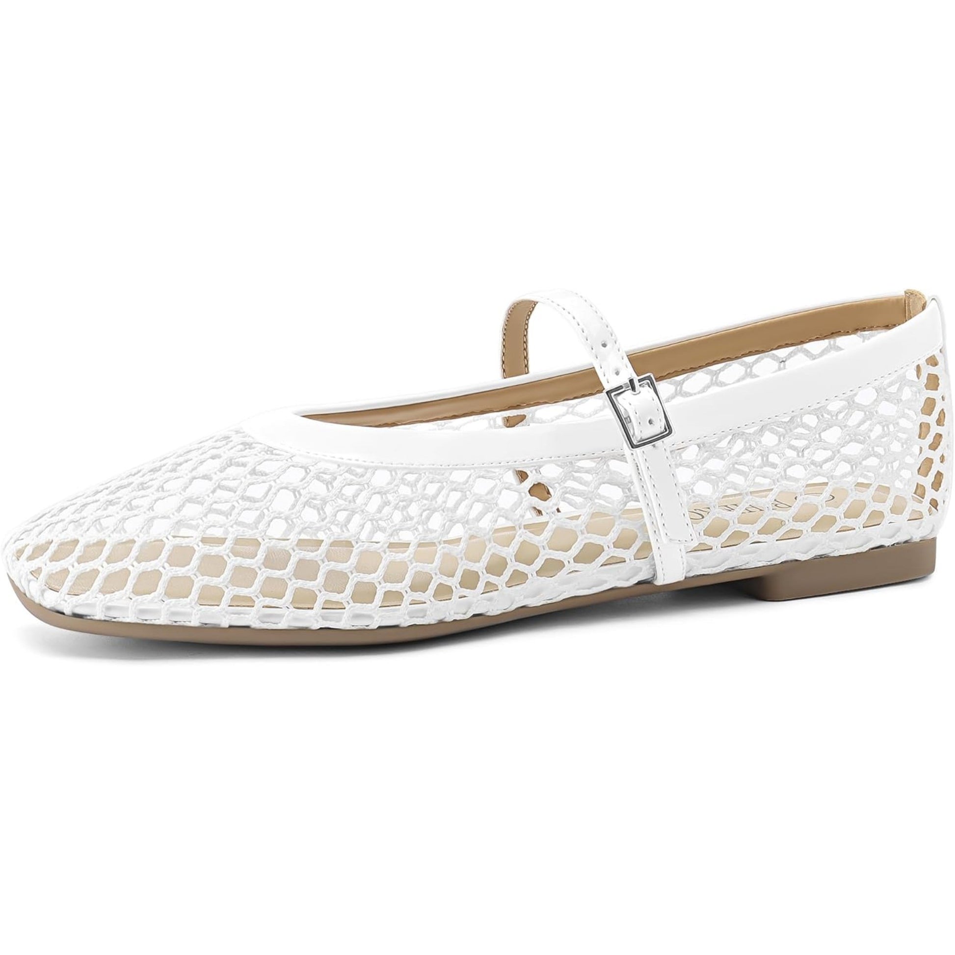 Women‘s Mesh Ballet Flats Comfortable Square Toe Ballerina Flats Buckle Strap Casual Fishnet Flat Shoes