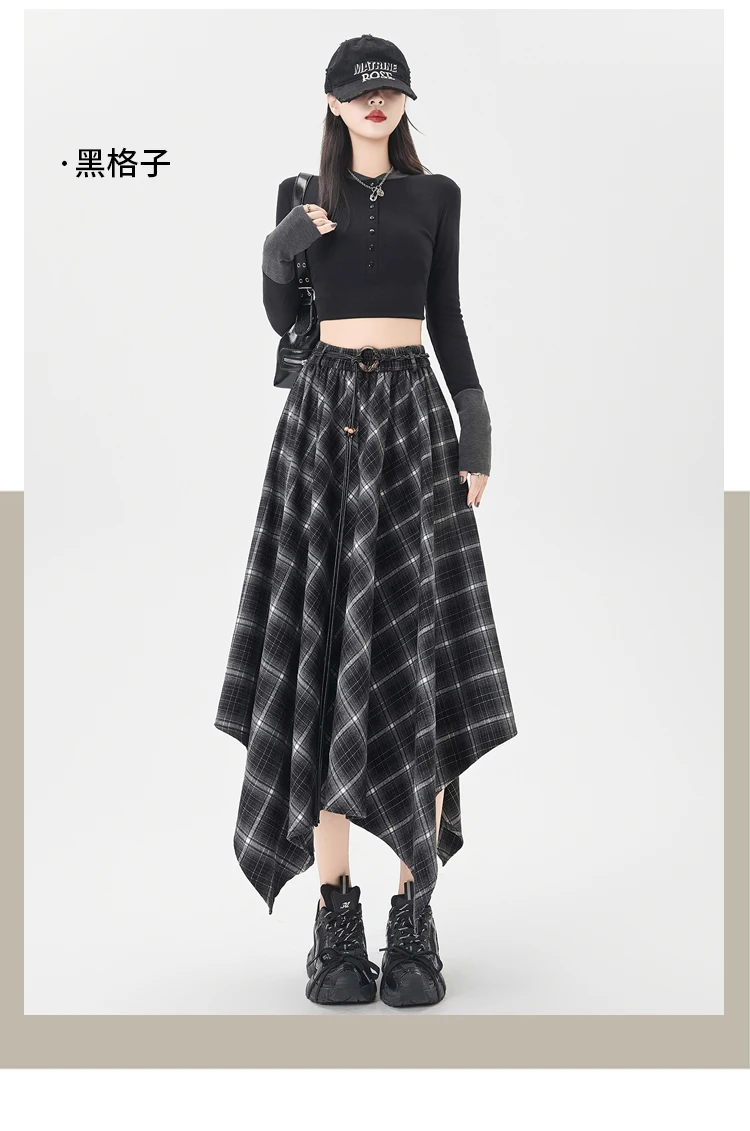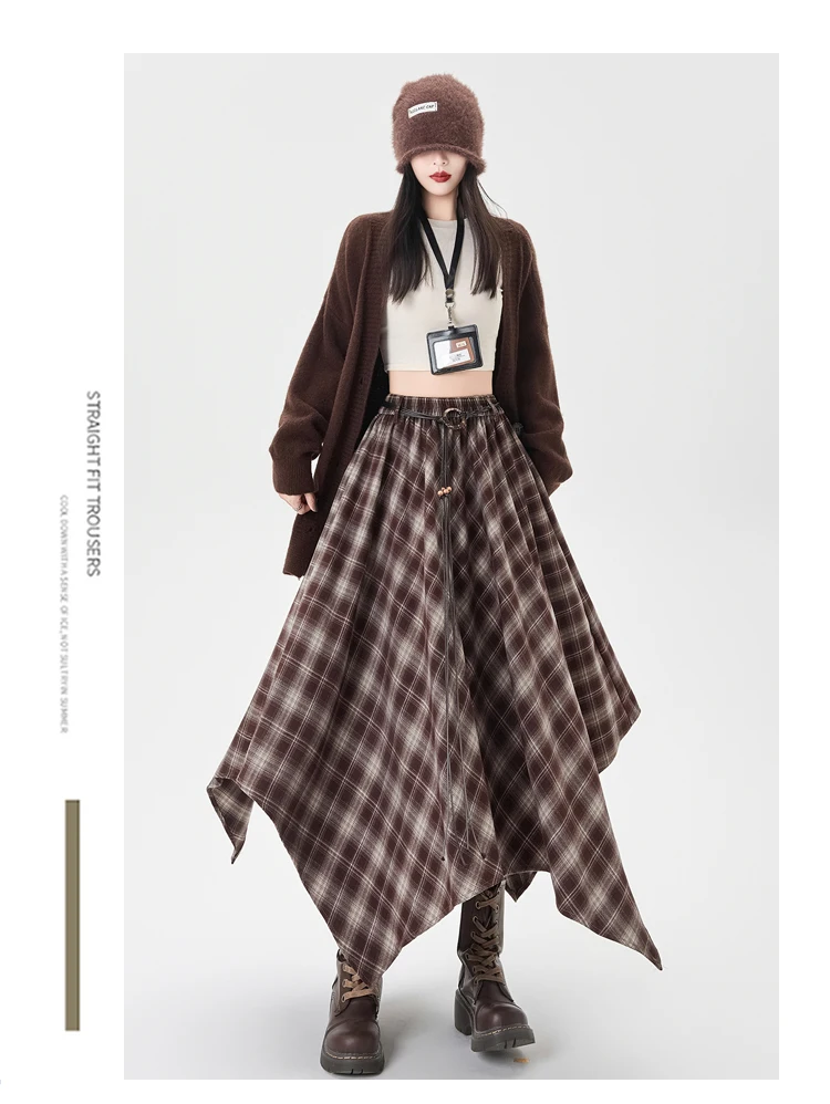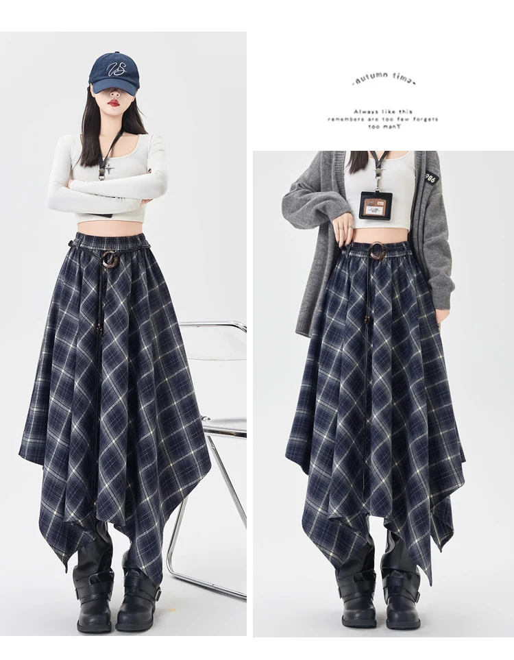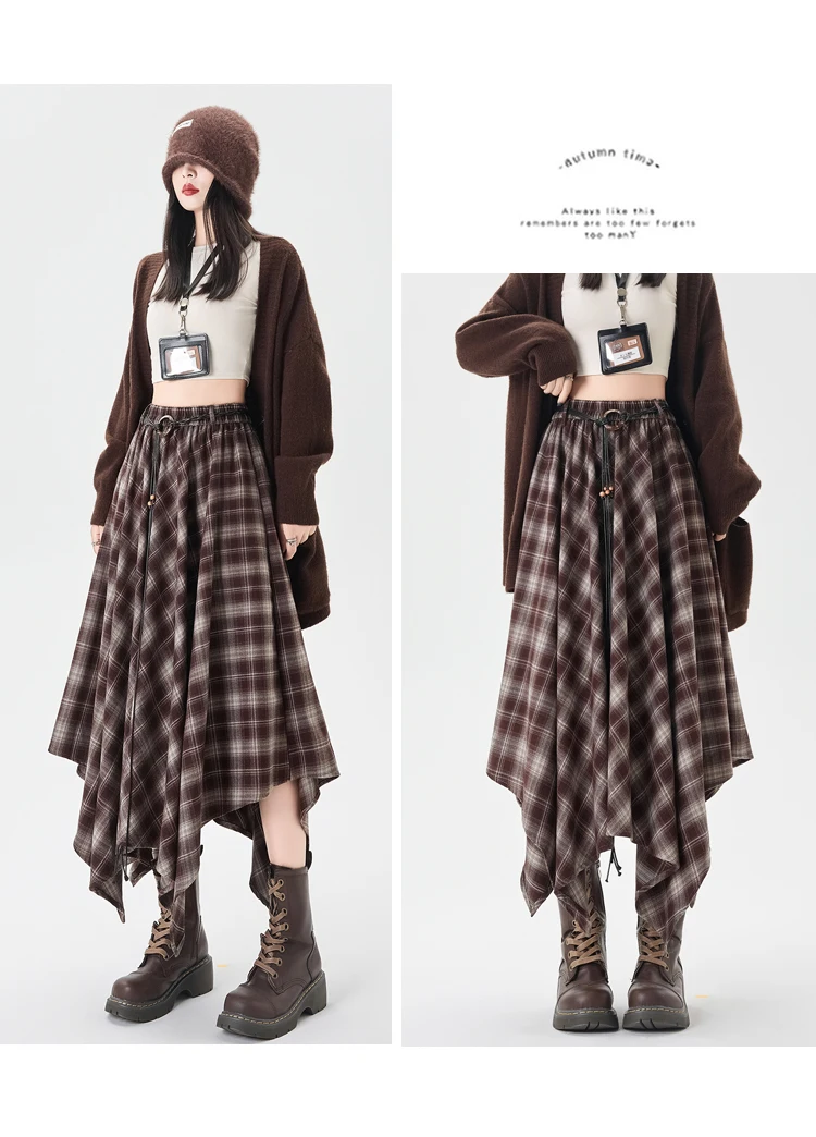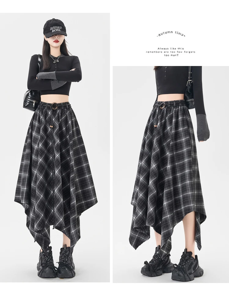 Women Skirt Plaid High Waisted Elastic A Line Mid Length Korean Style Fashion Retro Versatile Irregular Autumn Skirt