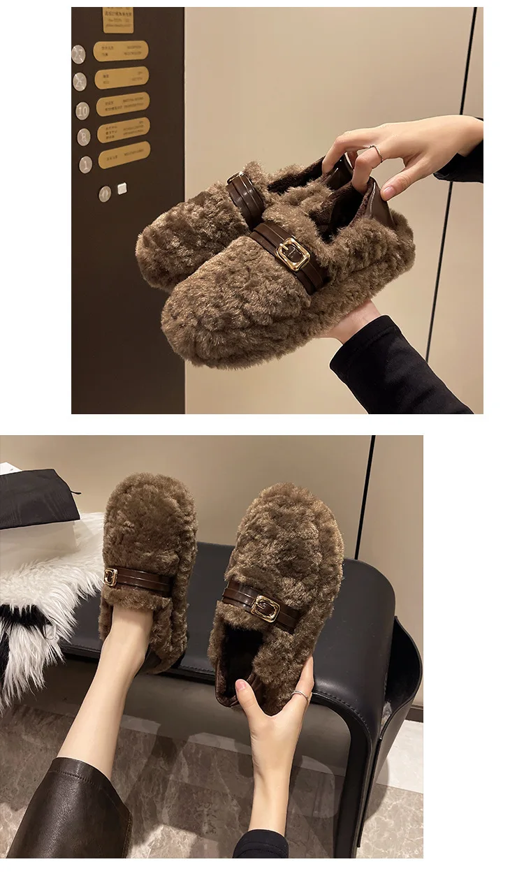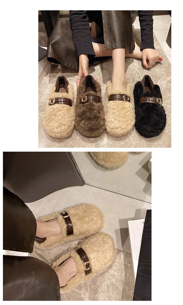 Women Warm Fur Flats Shoes 2025 Autumn Winter Vintage Fashion Shallow Mouth Buckle Ladies Comfort Loafers Shoes Zapatos Mujer