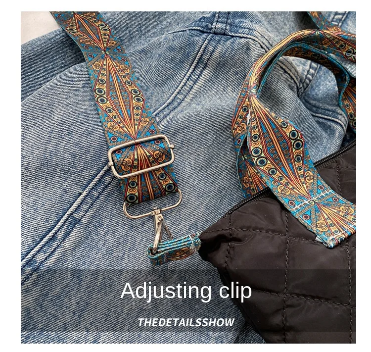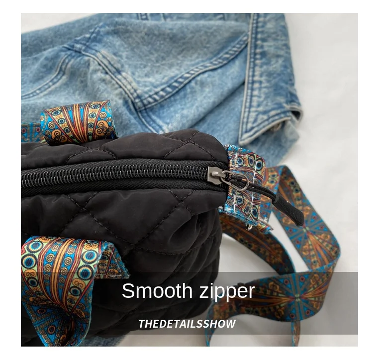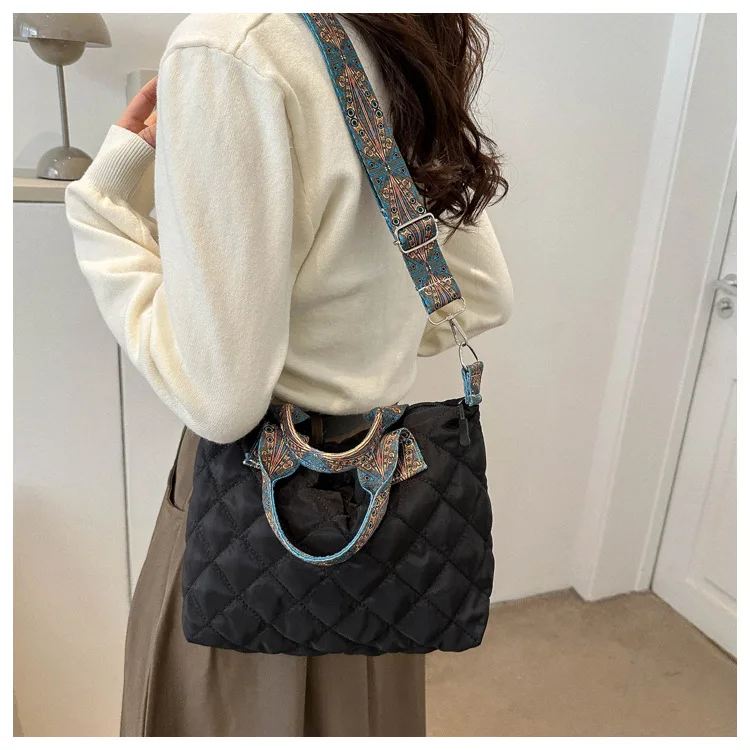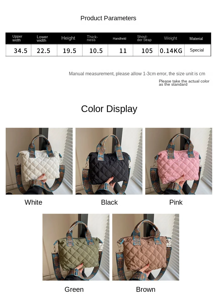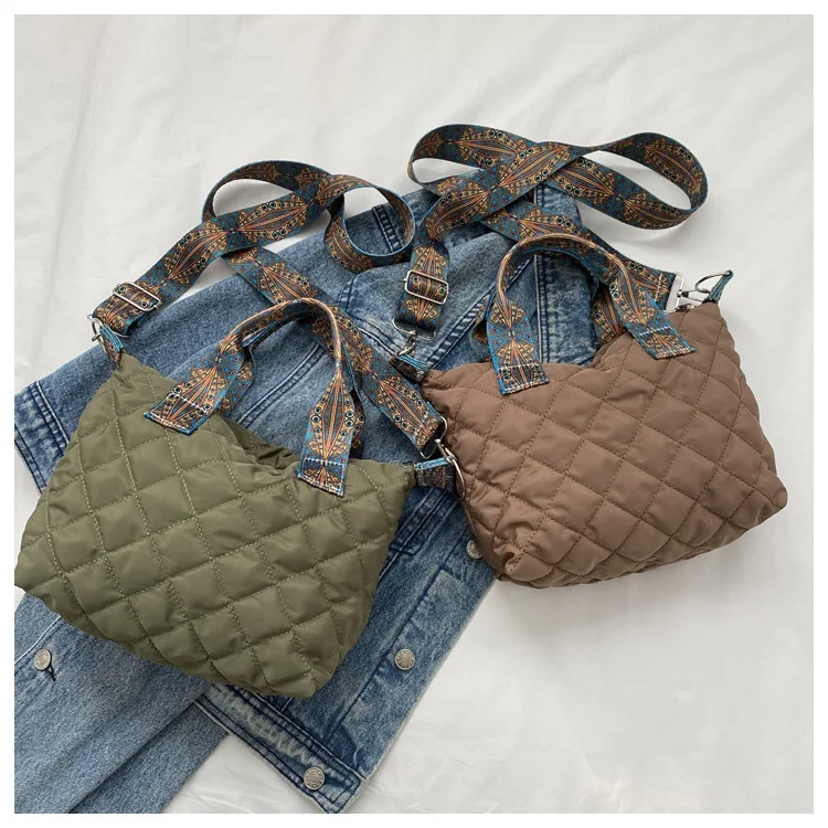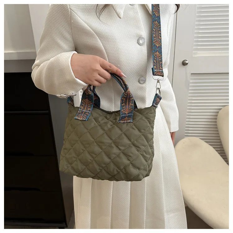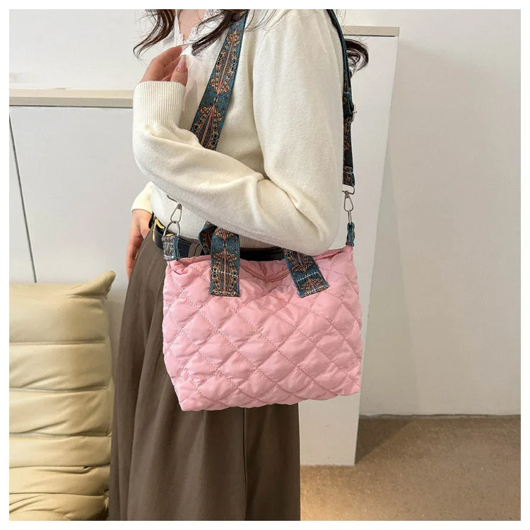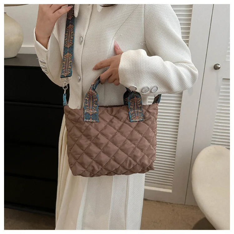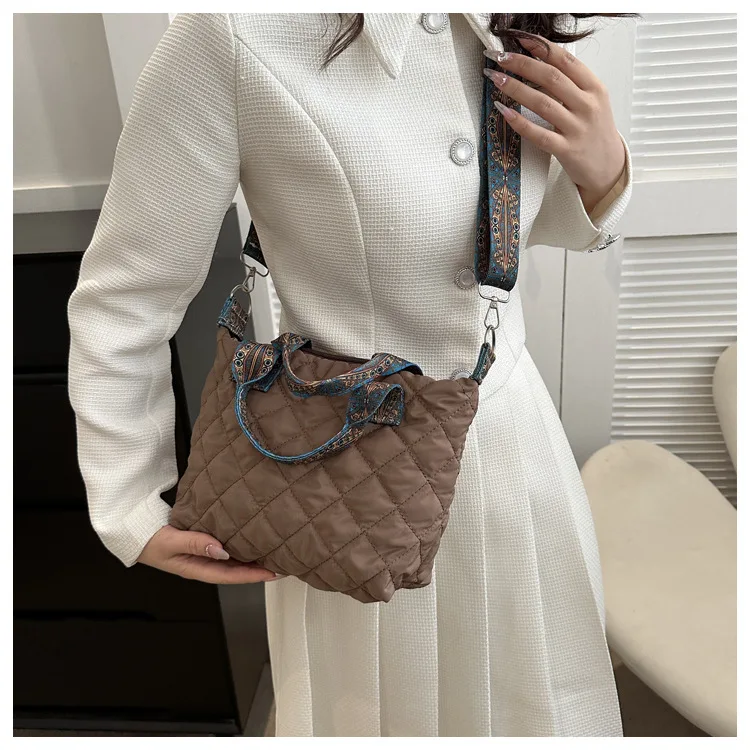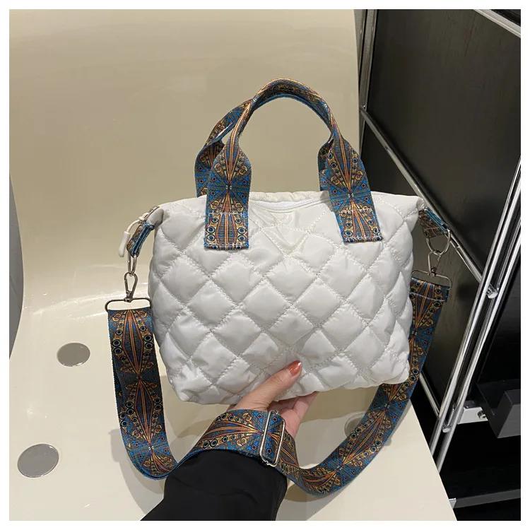 Women Wide Shoulder Belt Handbag Fall/Winter Rhombus Space Cotton Shoulder Bag Large Capacity All-Match Shopping Tote Bag
