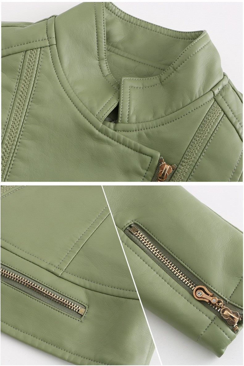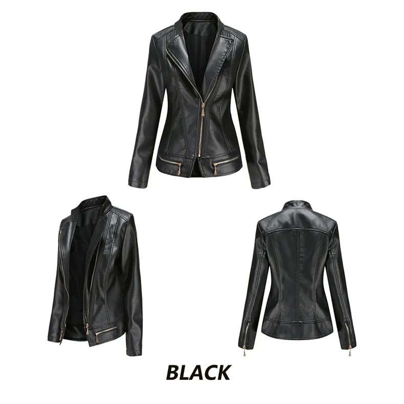Women's Bright Red Lapel PU Jacket, Zippered Embellished Leather Jackets, Women Fashion Casual Coat of Female Outerwear