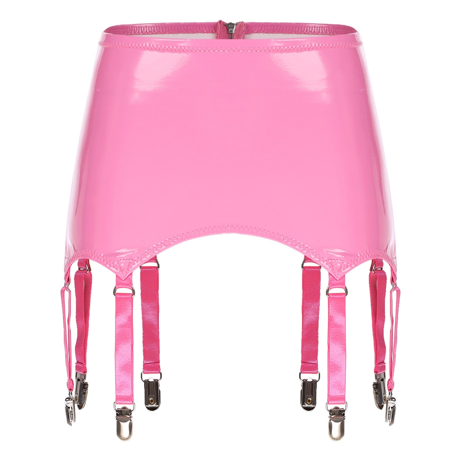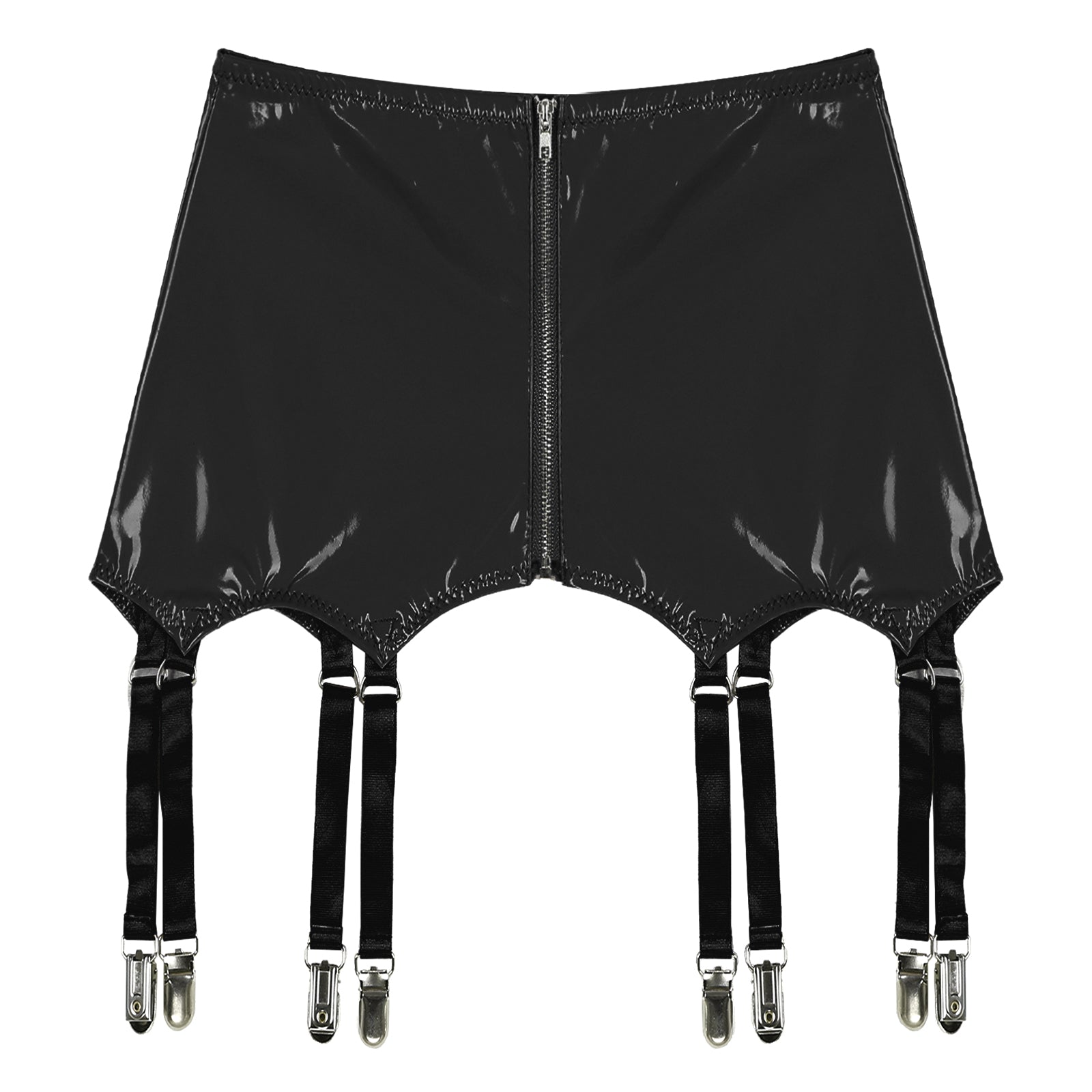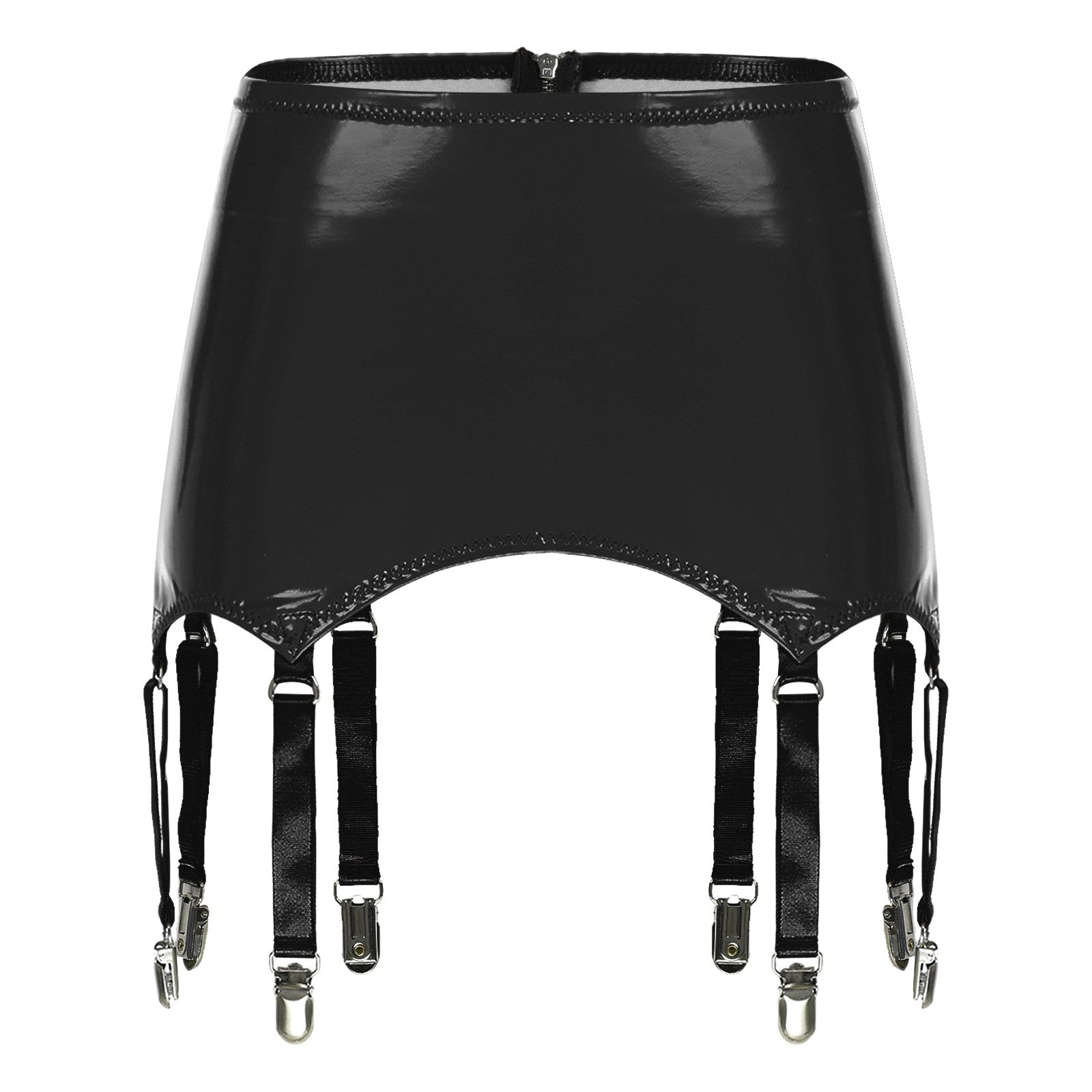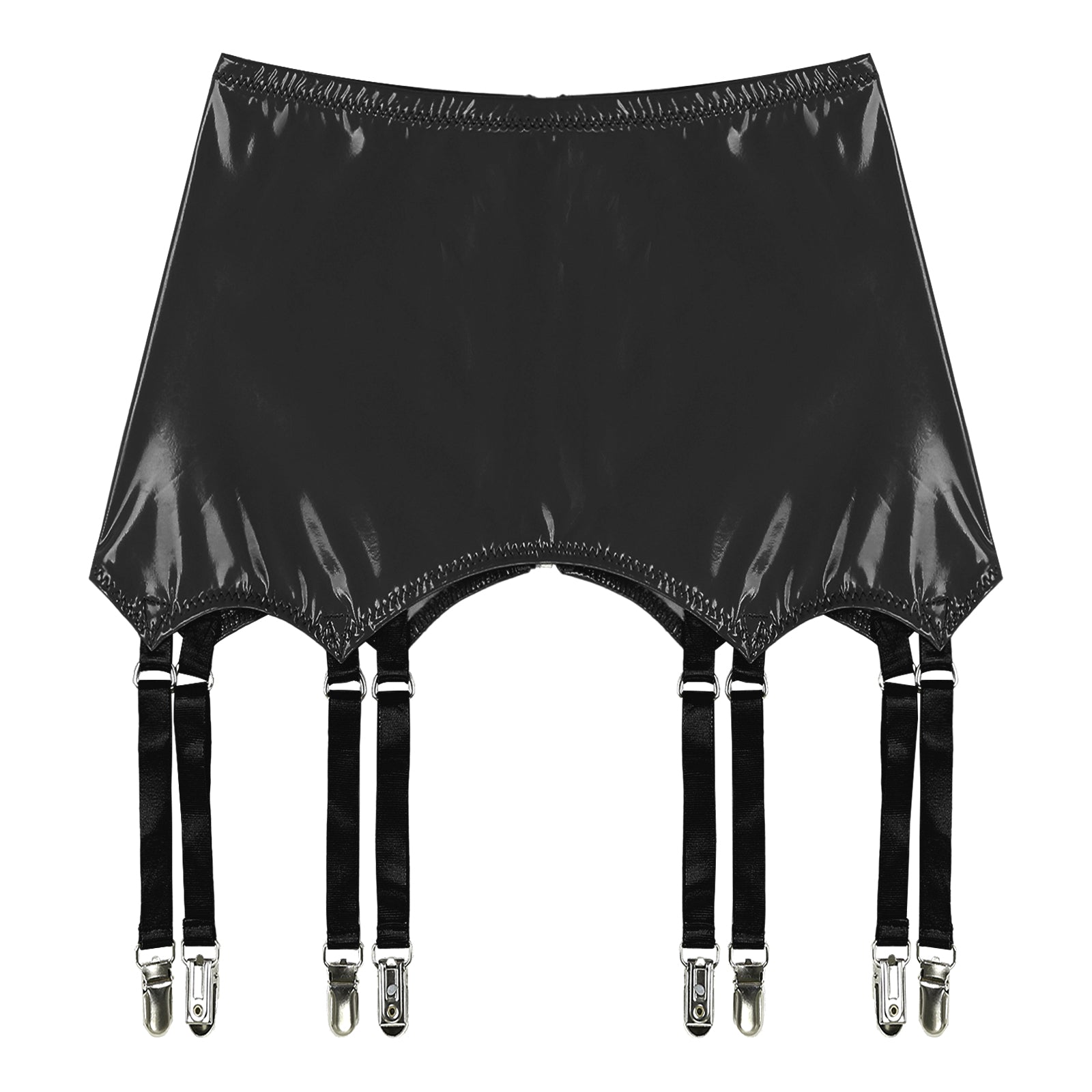 Wet look patent leather garters with metal clips keeps stockings from slipping.