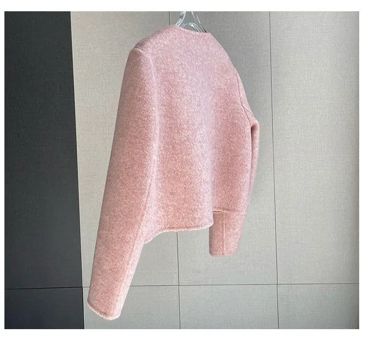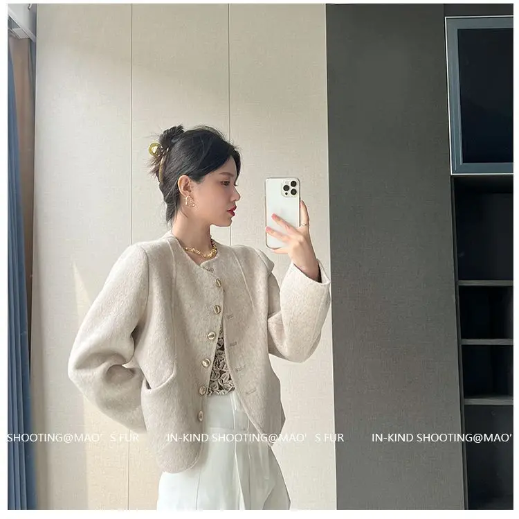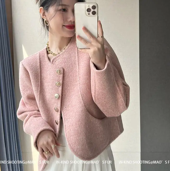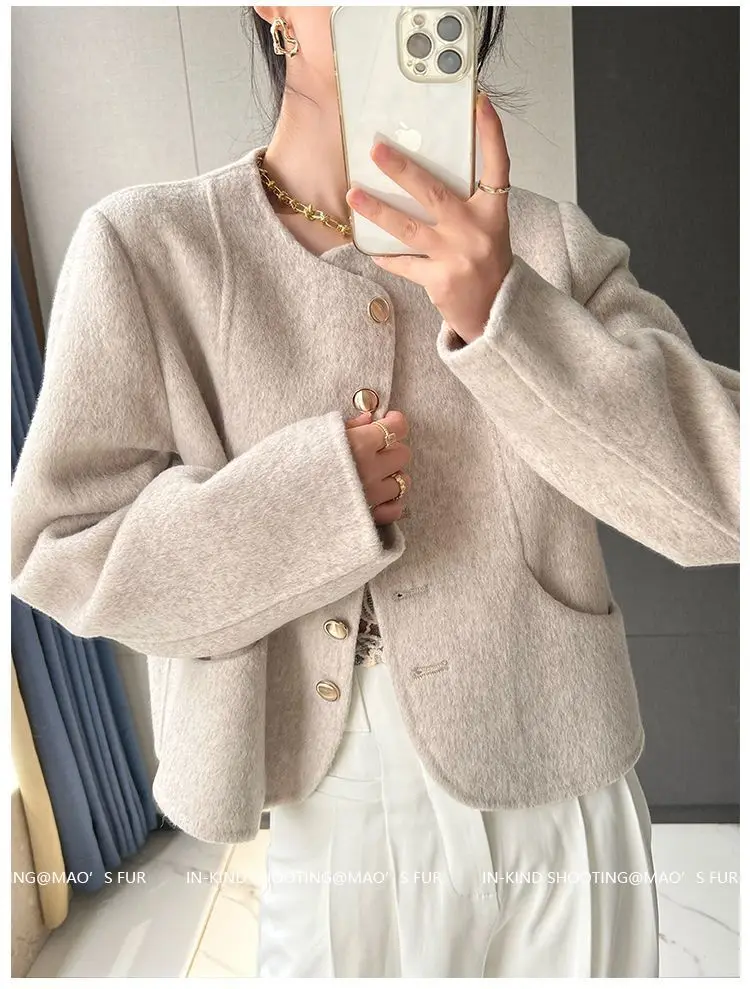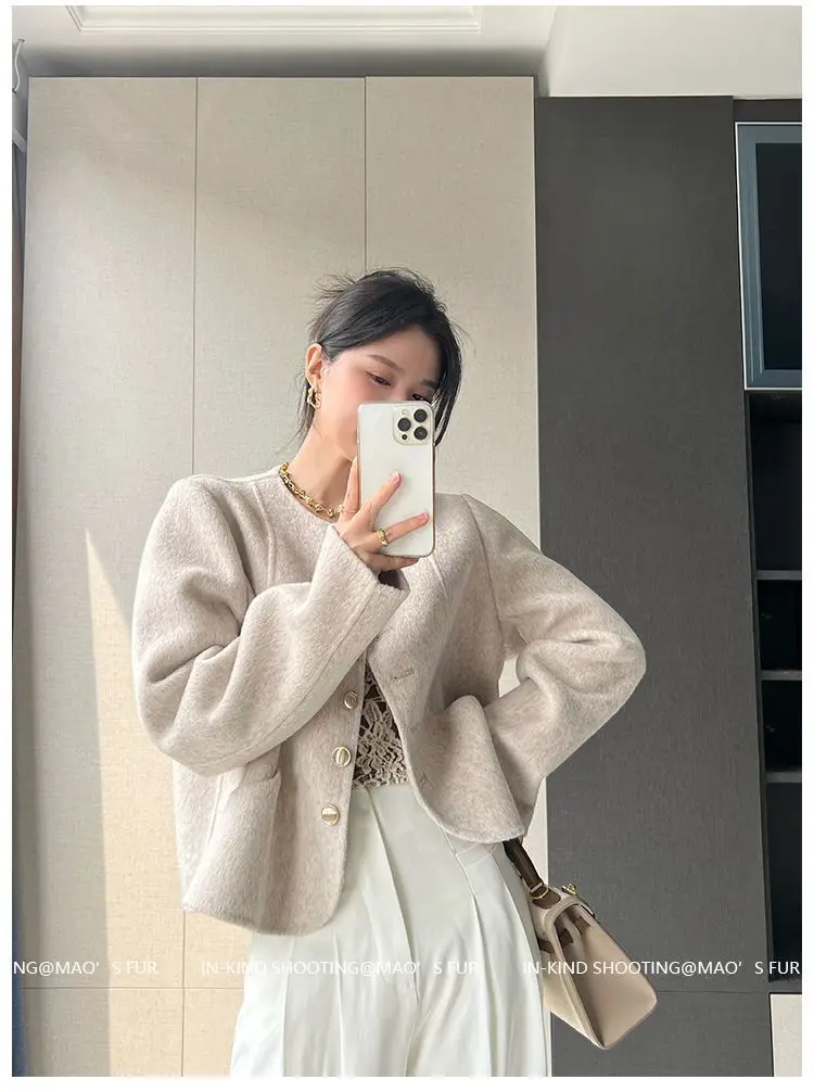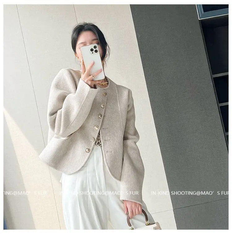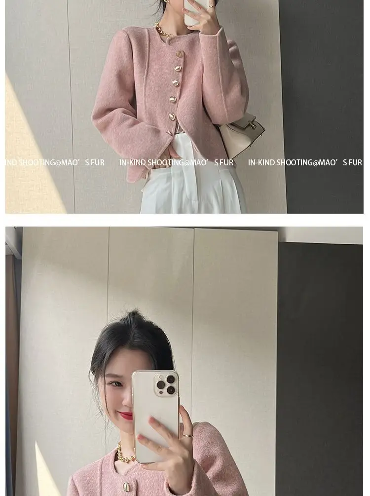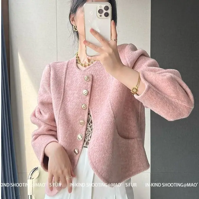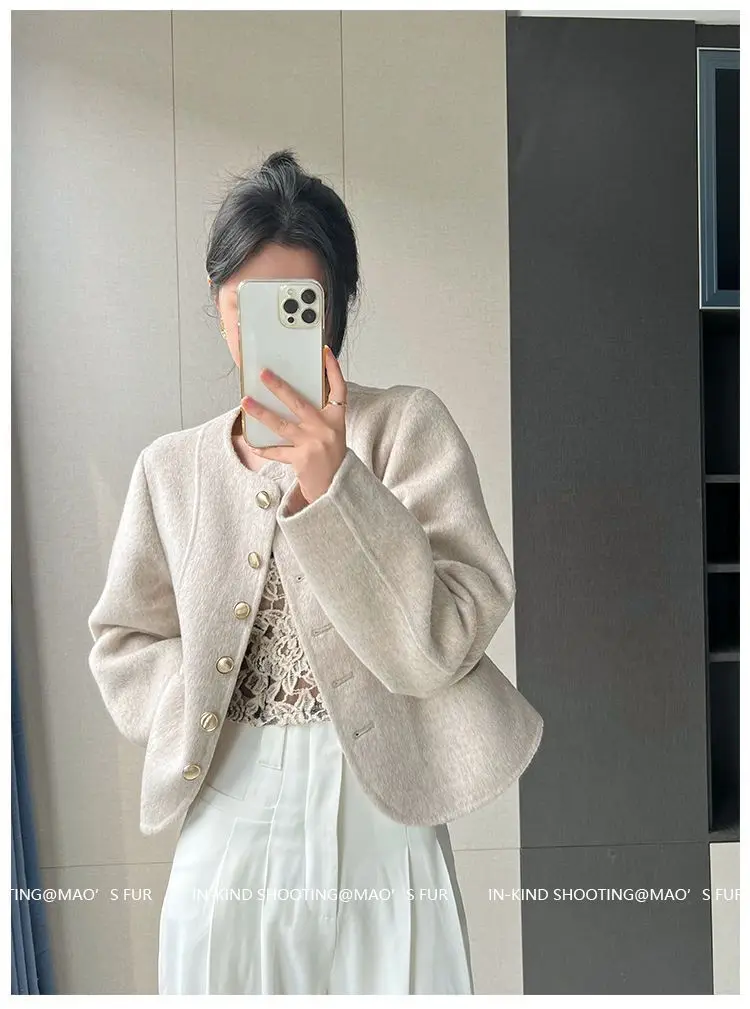 Women's New Round Neck Single-breasted Double-sided Tweed Coat Fashionable Casual and Versatile Elegant Top