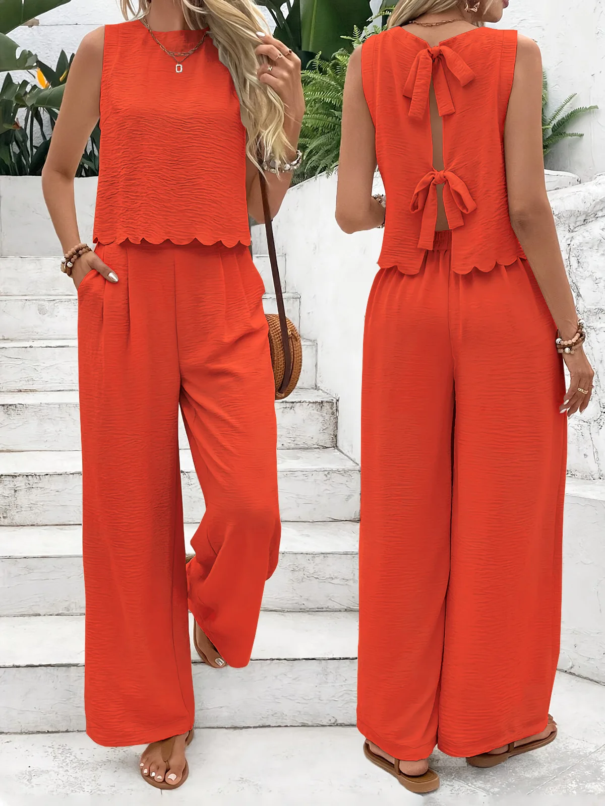 Women's Summer Muscle Simple Everyday Old Money Style Linen Tie Two Piece Set, Shell Trimmed Sleeveless Top And Pants Set