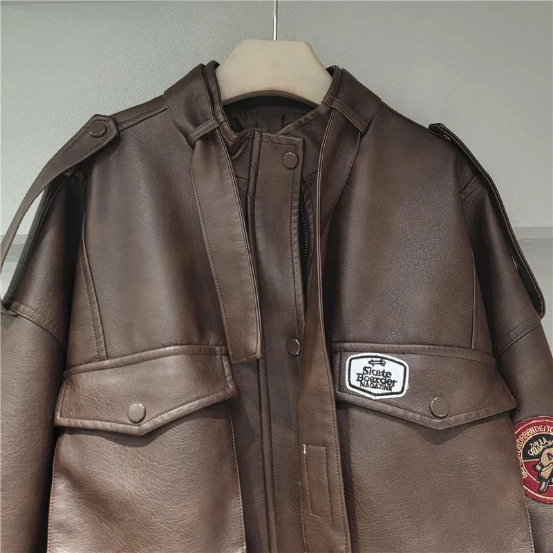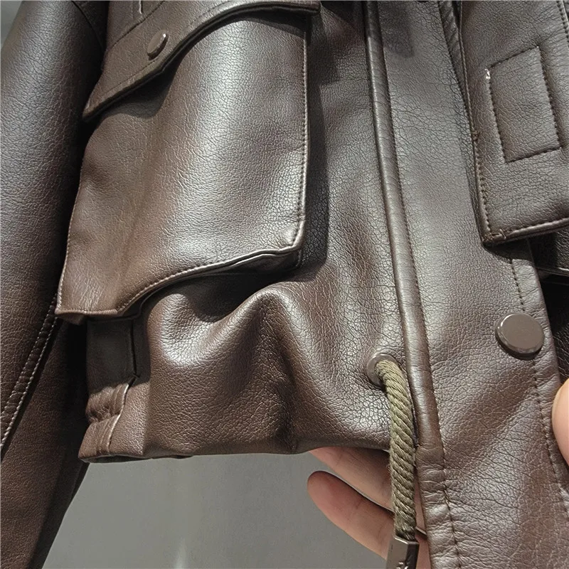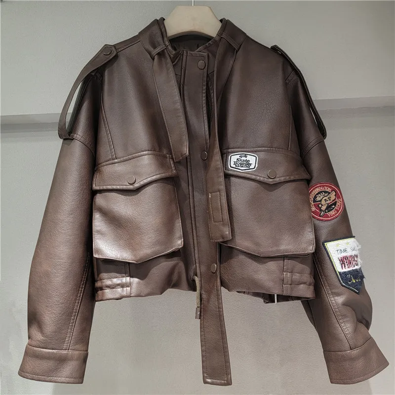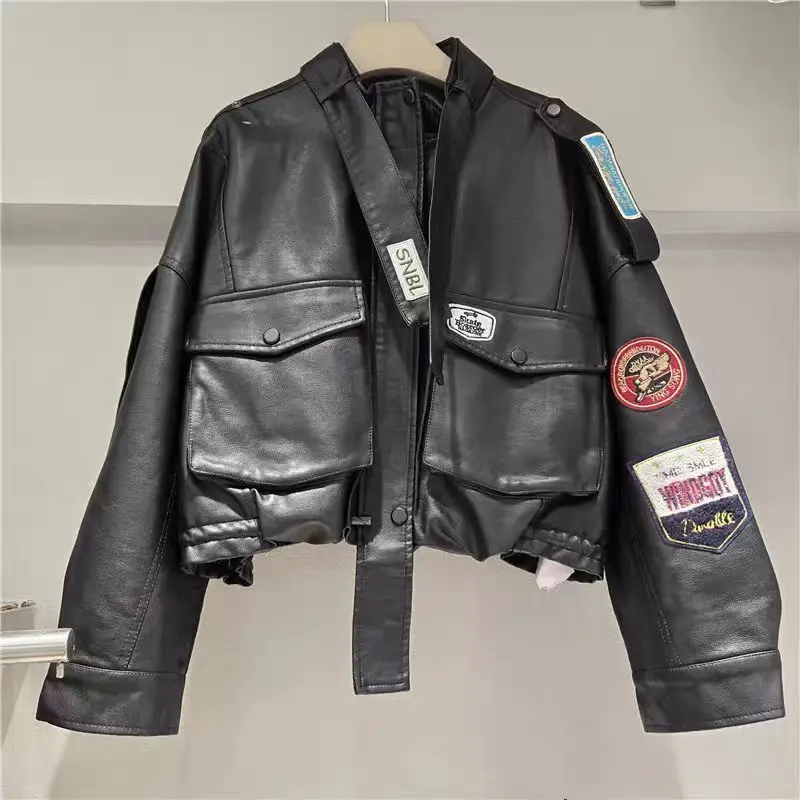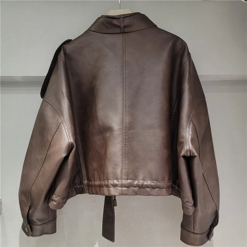 YEAE 2025 spring new vintage motorcycle leather printed high waist lean washed PU leather coat tide