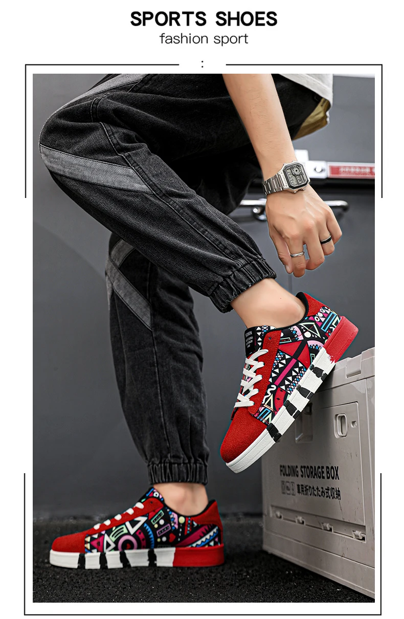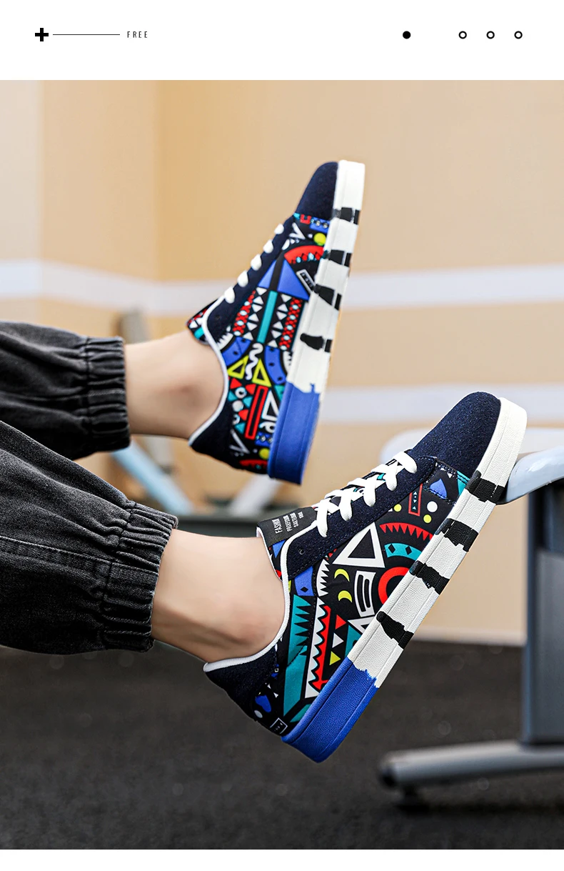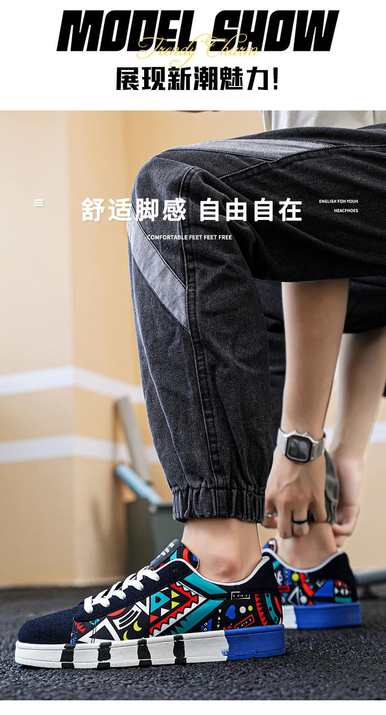 YRZL Men's Sports Running Shoes Canvas Geometric Style Lace-Up Sneakers Couples' Fashionable Graffiti Print Skate Shoes Men
