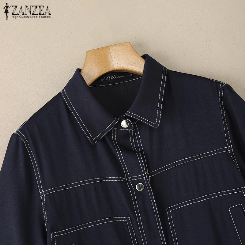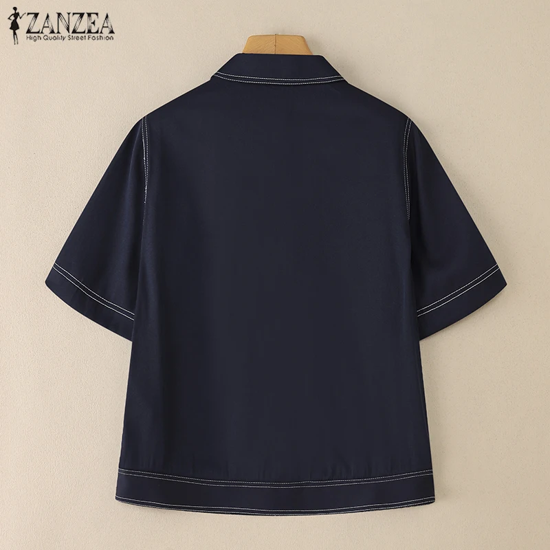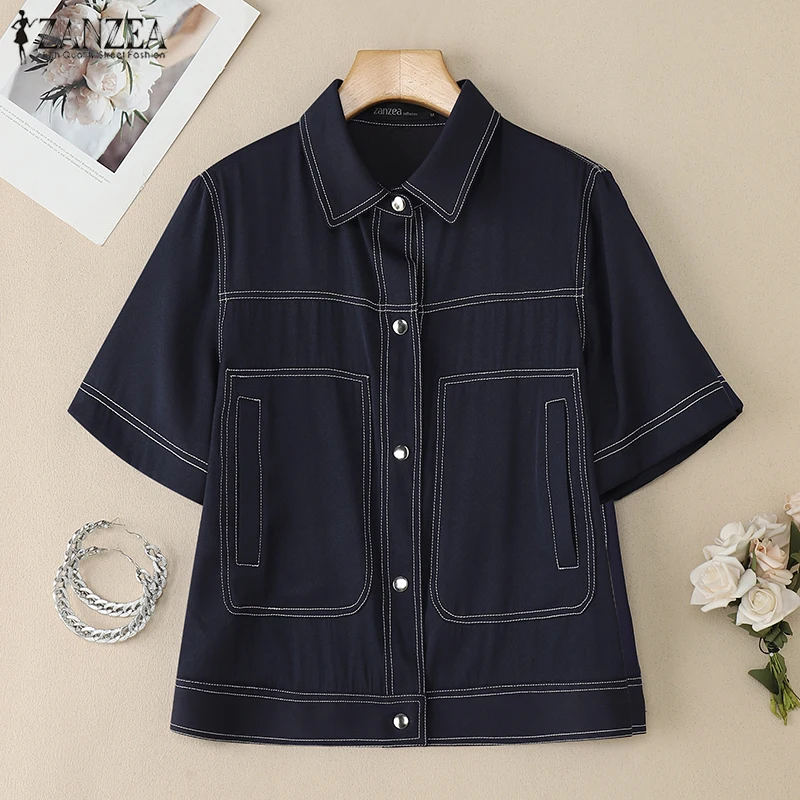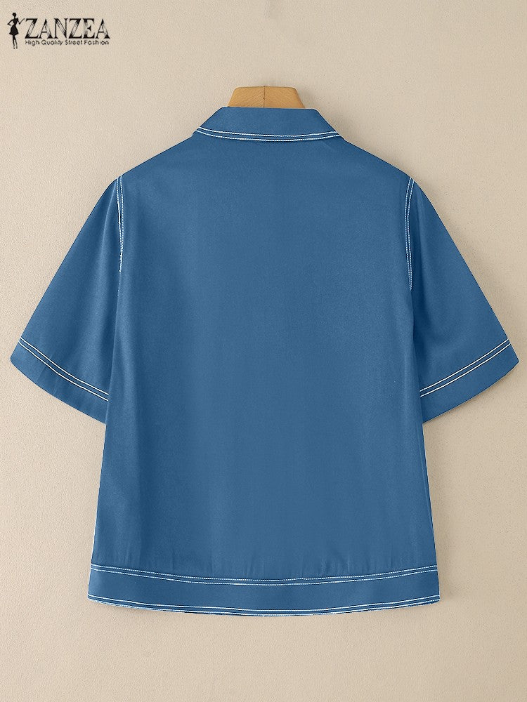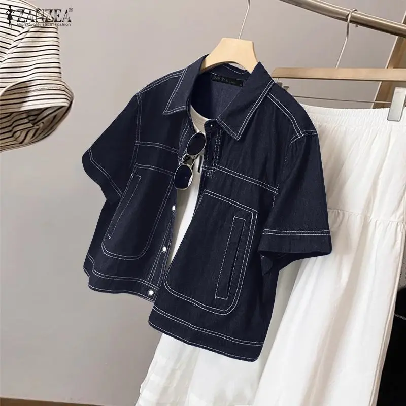 ZANZEA Women's Denim-Like Contrast-Stitch Shirts 2025 Fashion Turn-Down Collar Short Sleeve Button Up Shirt Streetwear Woman Top