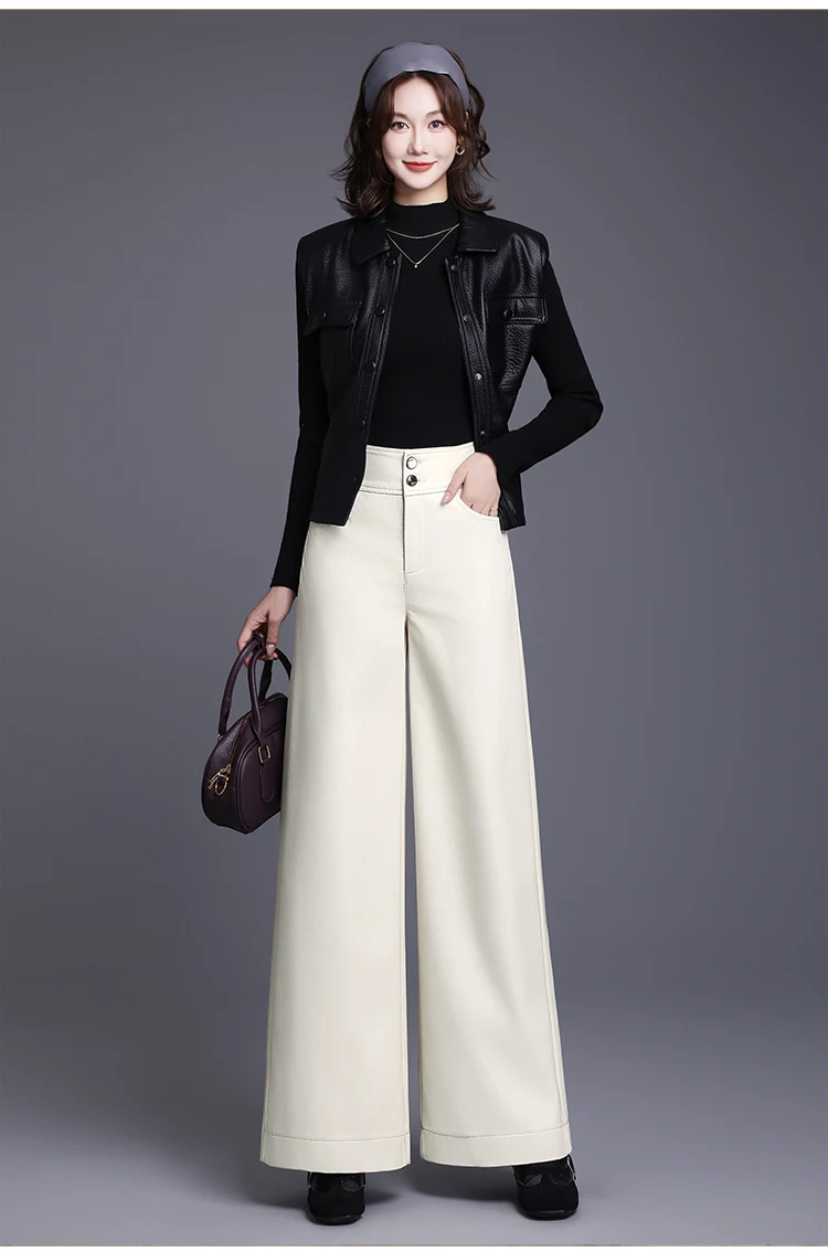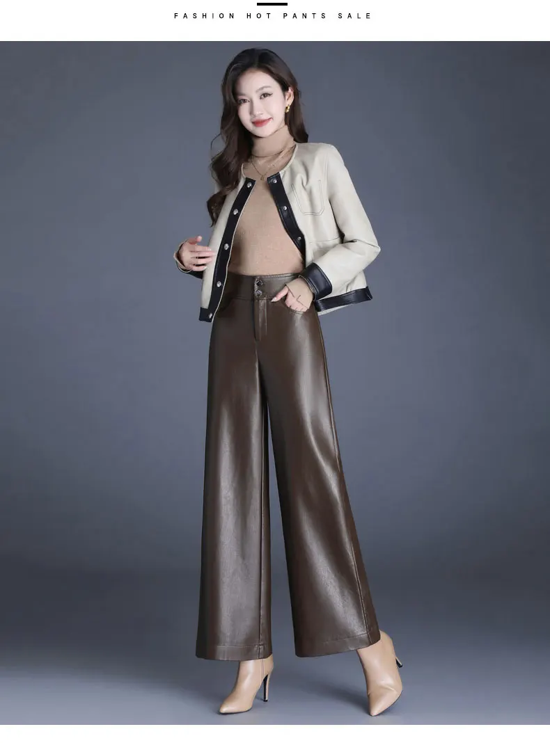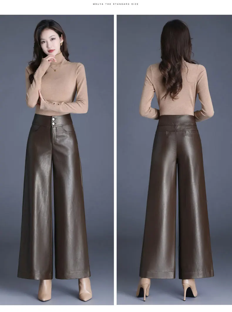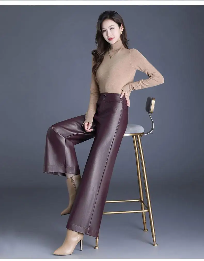 ZUZK High Quality Women PU Leather Wed Leg Pants Autumn Winter Fashion Warm Long Leather Pants Elegant LeatherTrousers
