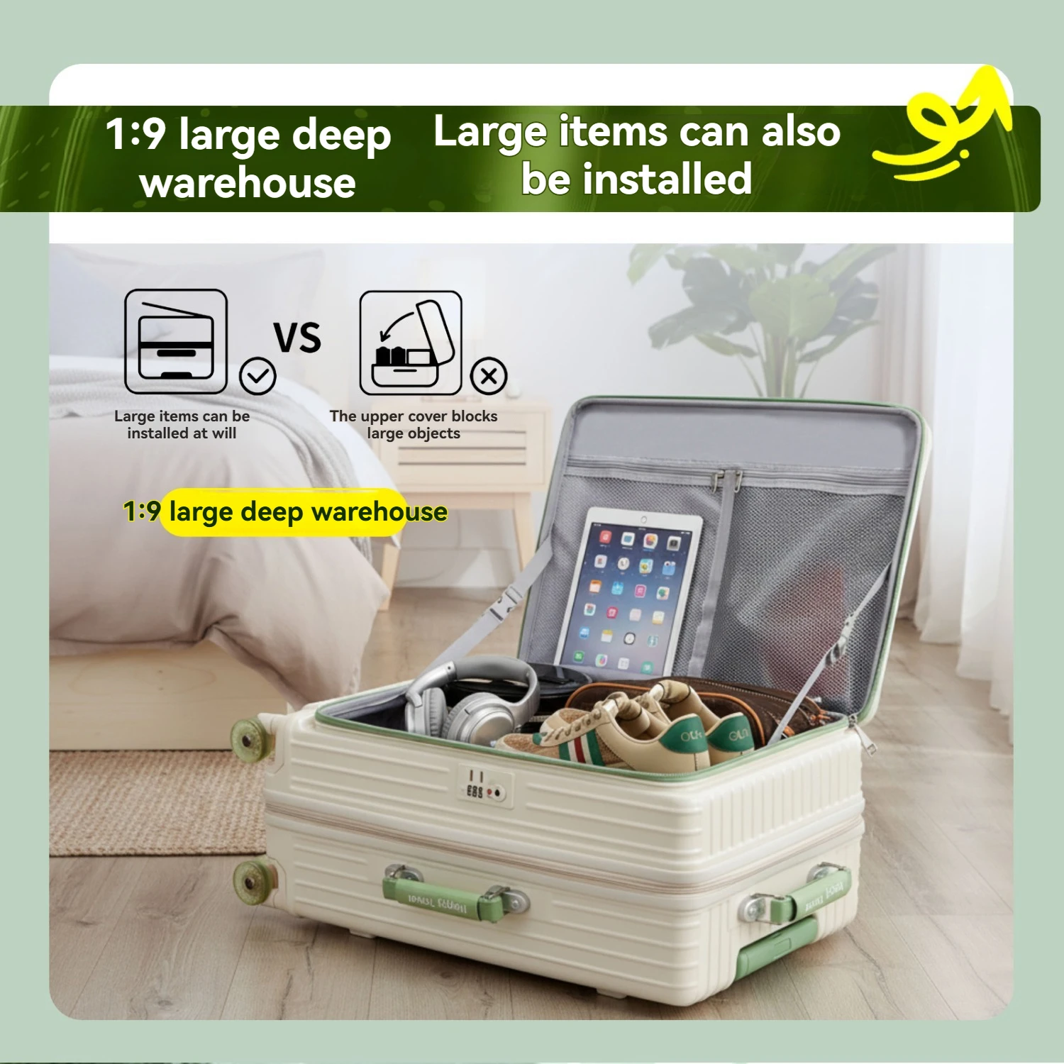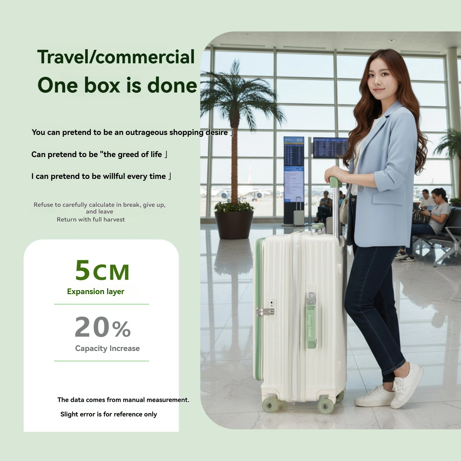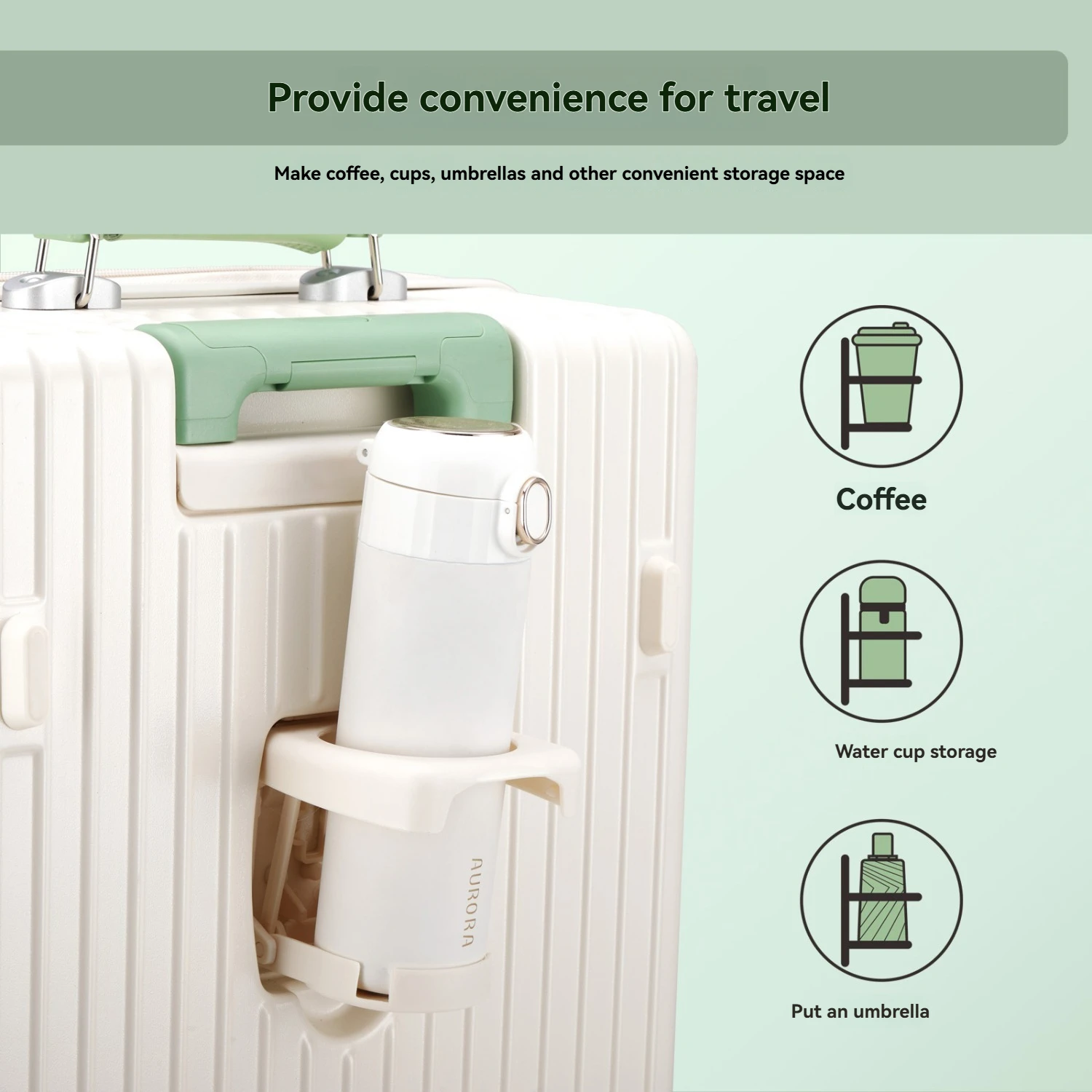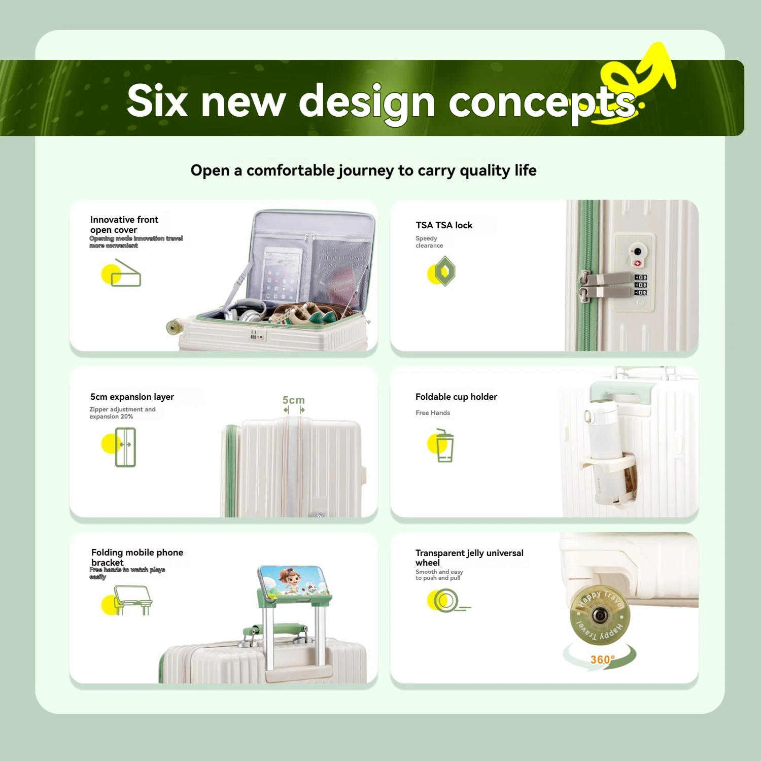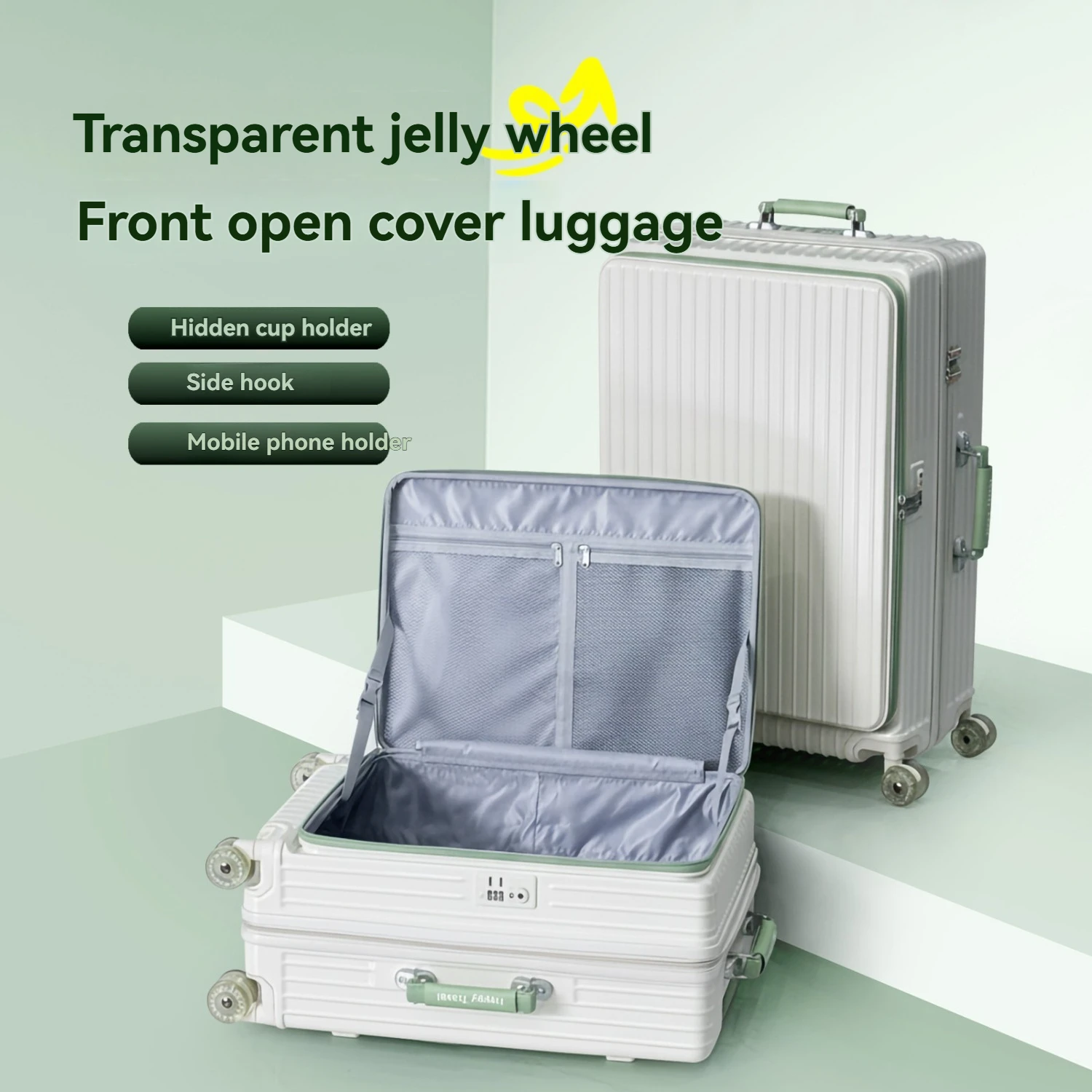 1-Piece Set of Front-Opening Suitcase with Jelly Wheels, Trolley Case with 5cm Expansion Layer, Leather Handle, Luggage with Phone Holder, Foldable Cup Holder, Side Hook Function, Customs Lock, Suitable for Outdoor Beach Vacations and Long-Distance Travel