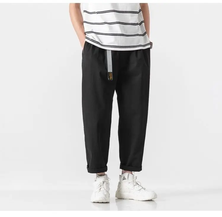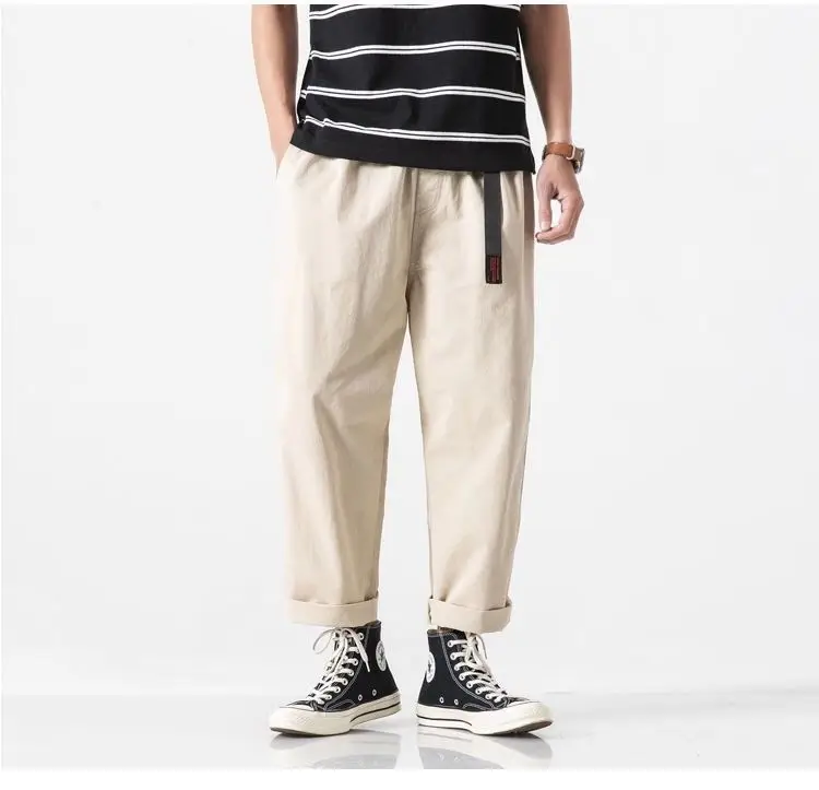 100% Cotton Casual Summer Pants With Belt Men Straight Baggy Ankle-Length Cargo Trousers Wide Leg Sweatpants Male Streetwear