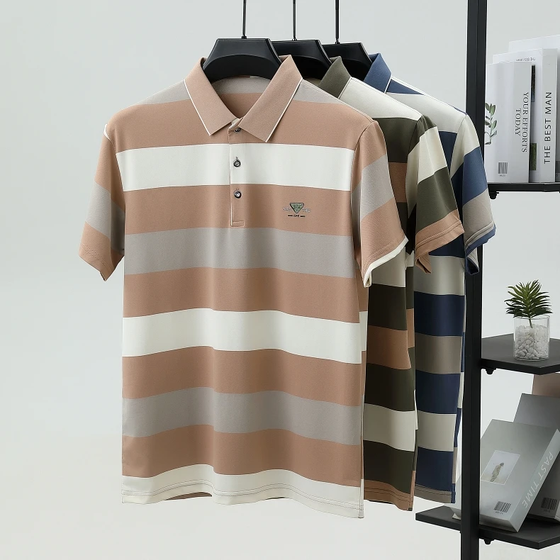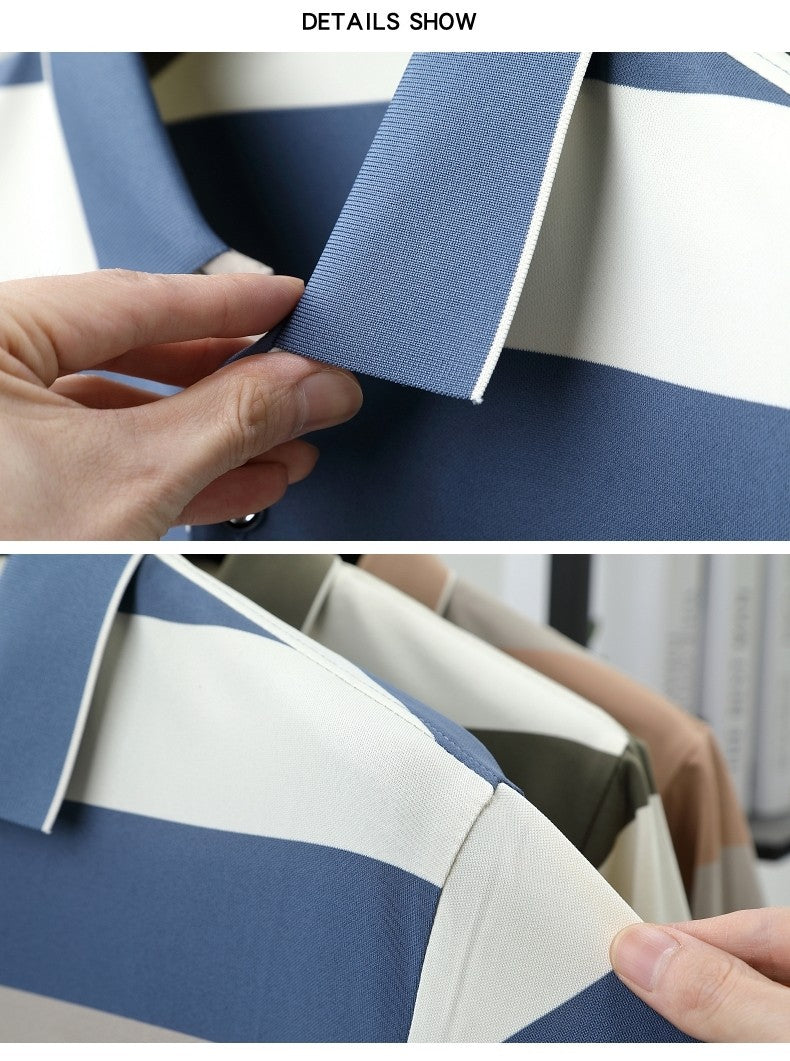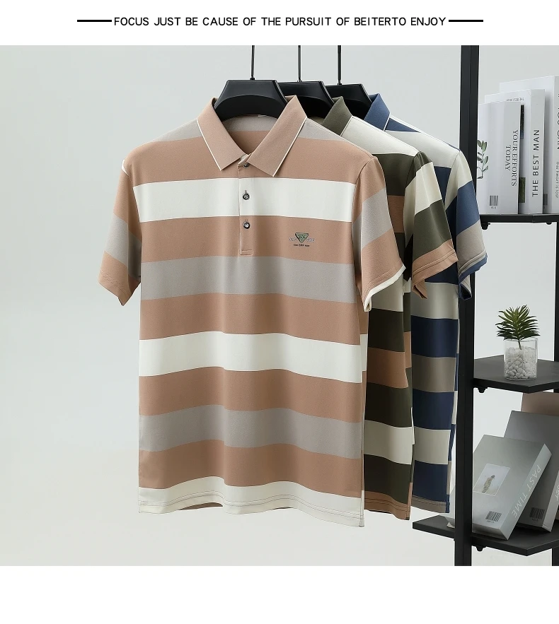100% pure cotton fashion short sleeve polo shirt men's luxury brand embossed wide stripe color blocked summer casual lapel top