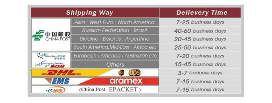 2 The default shipping way is China Post Registered Air Mail,which usually takes about 10-45 workdays.It depends on destination and other factors, if you don't receive your parcel within a month,please contact us immediately.Our price does not include any import taxes, and you are responsible for customs duties.