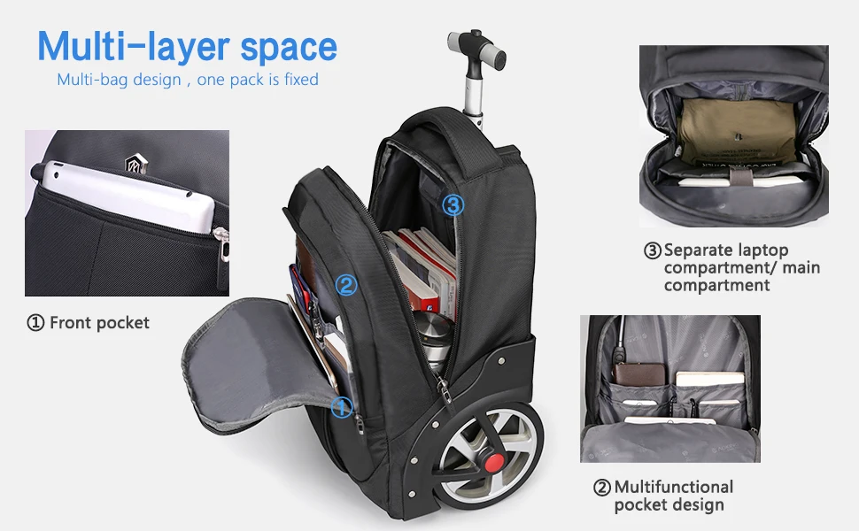 【Large Capacity Rolling Backpack】 Wheeled backpack size:37*26.5*53CM 20 inches,this rolling backpack built in laptop padded compartment,can hold 17.3 inch laptop and satisfy your daily outdoor needs
