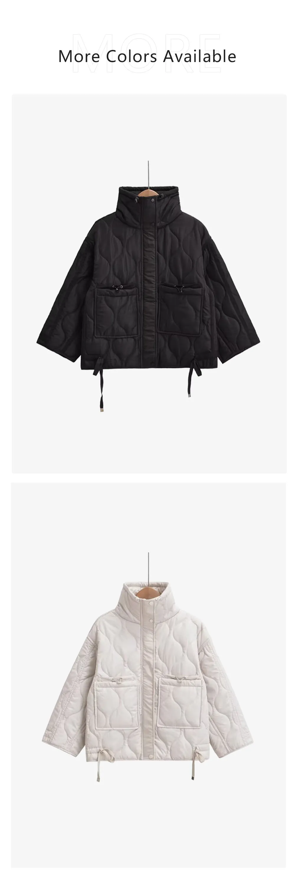 2024 autumn new women's fashion pocket decoration loose long sleeved stand collar diamond grid cotton jacket short jacket