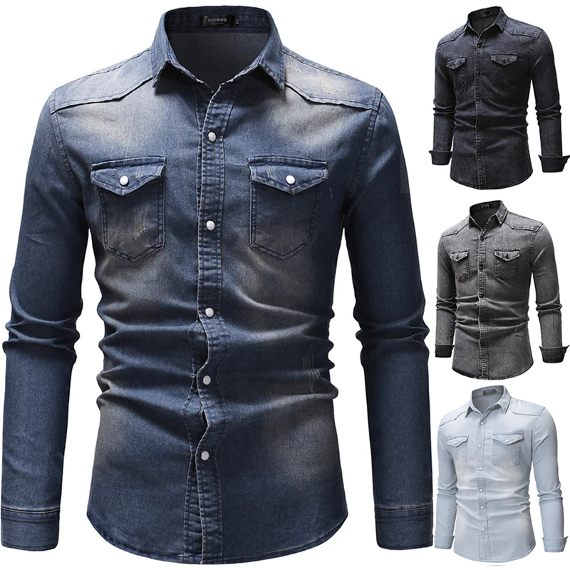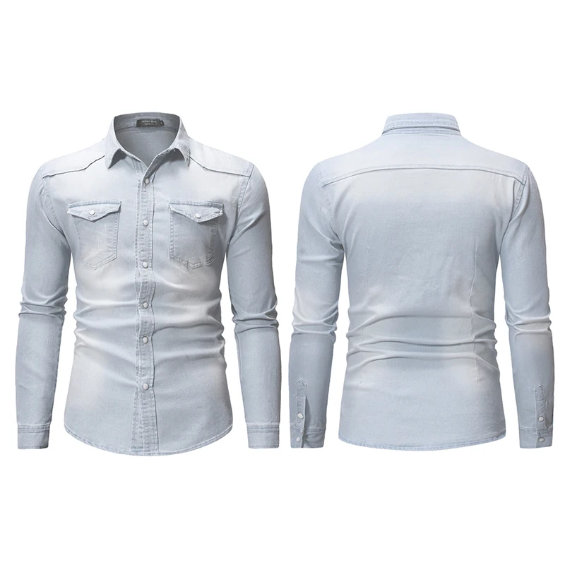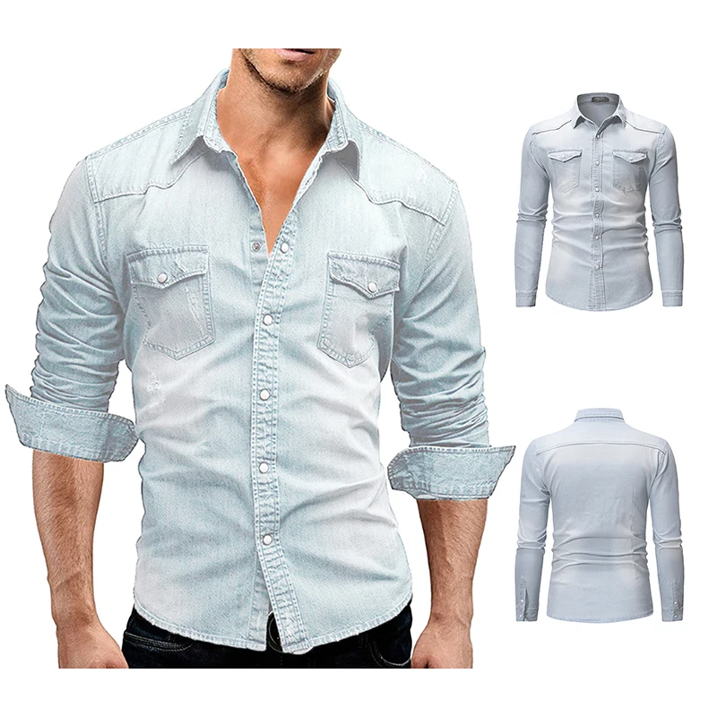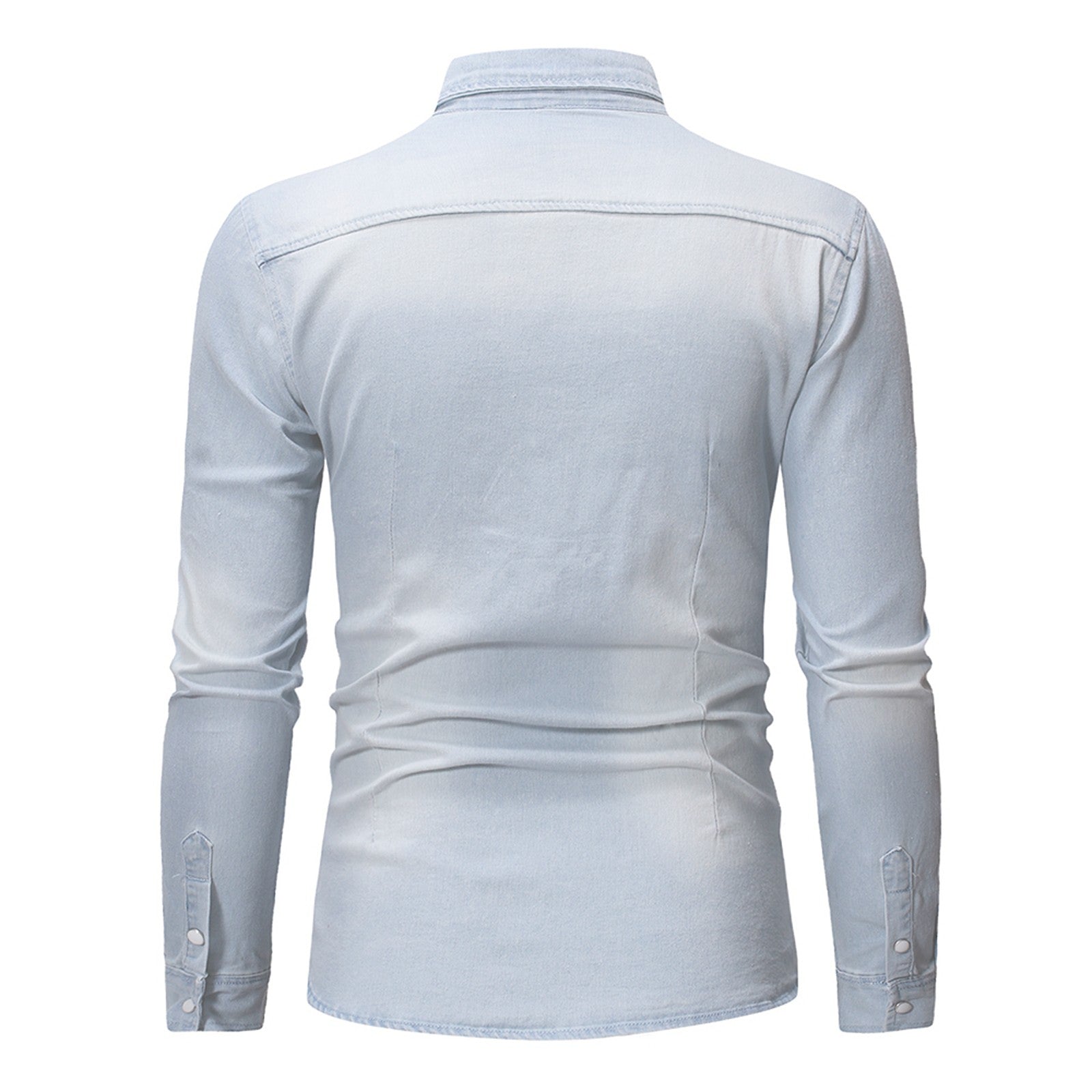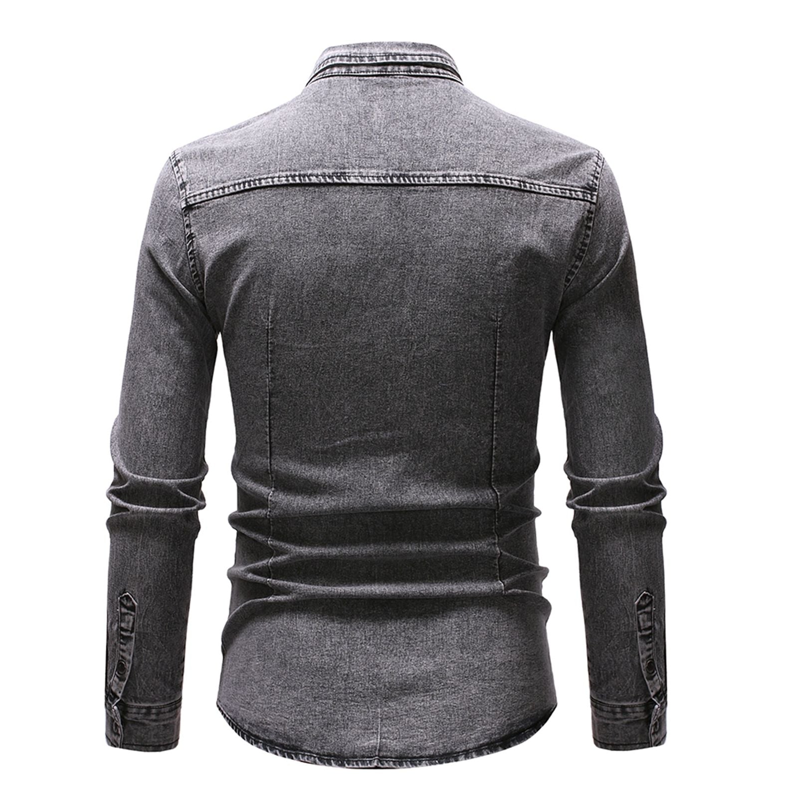 Men's Spring Autumn Casual Shirts Solid Color Long Sleeve Lapel Denim Tops Button Shirts for PartySize(cm)