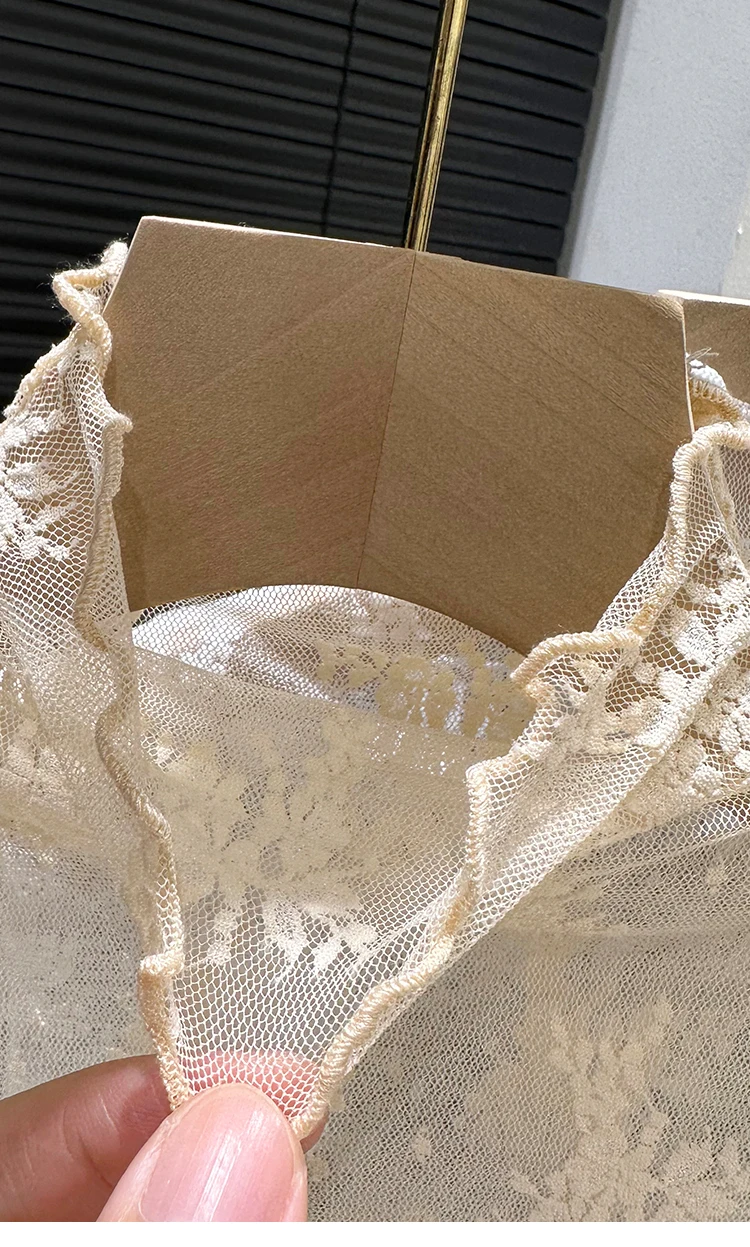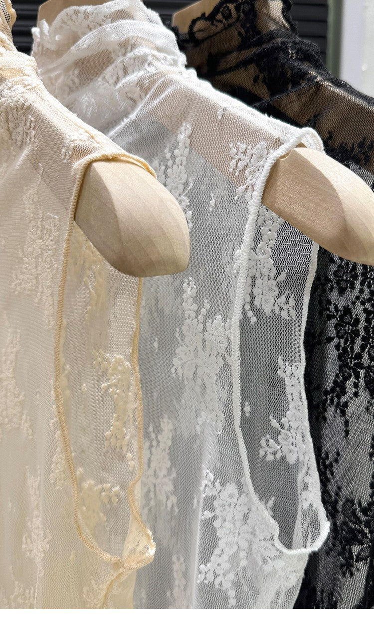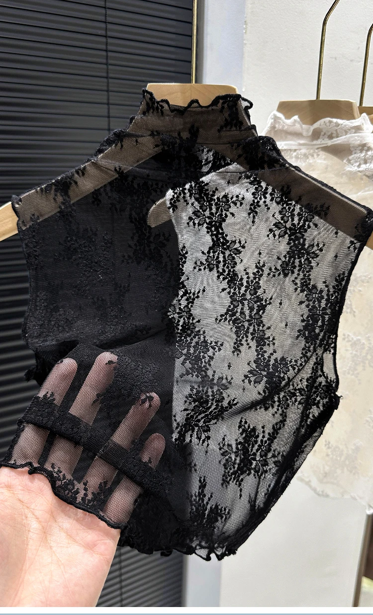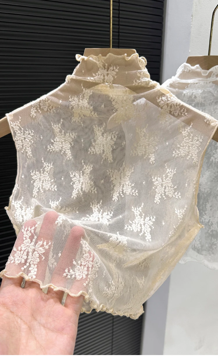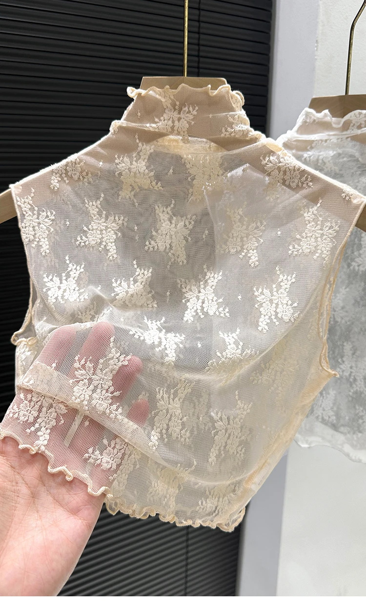 This 2024 new style top features a trendy sleeveless mesh collar design, perfect for the spring and autumn seasons. It's a half-high neck blouse with a lace base, adding a touch of elegance to any outfit.