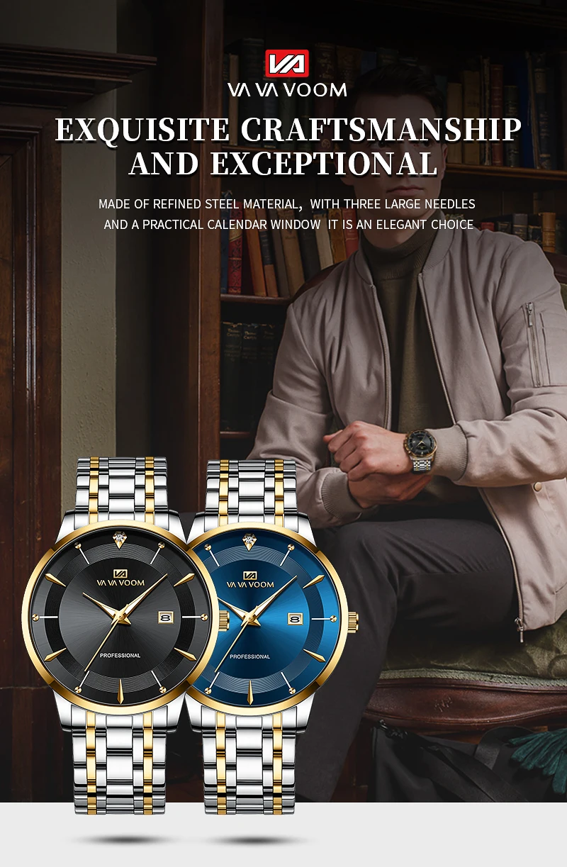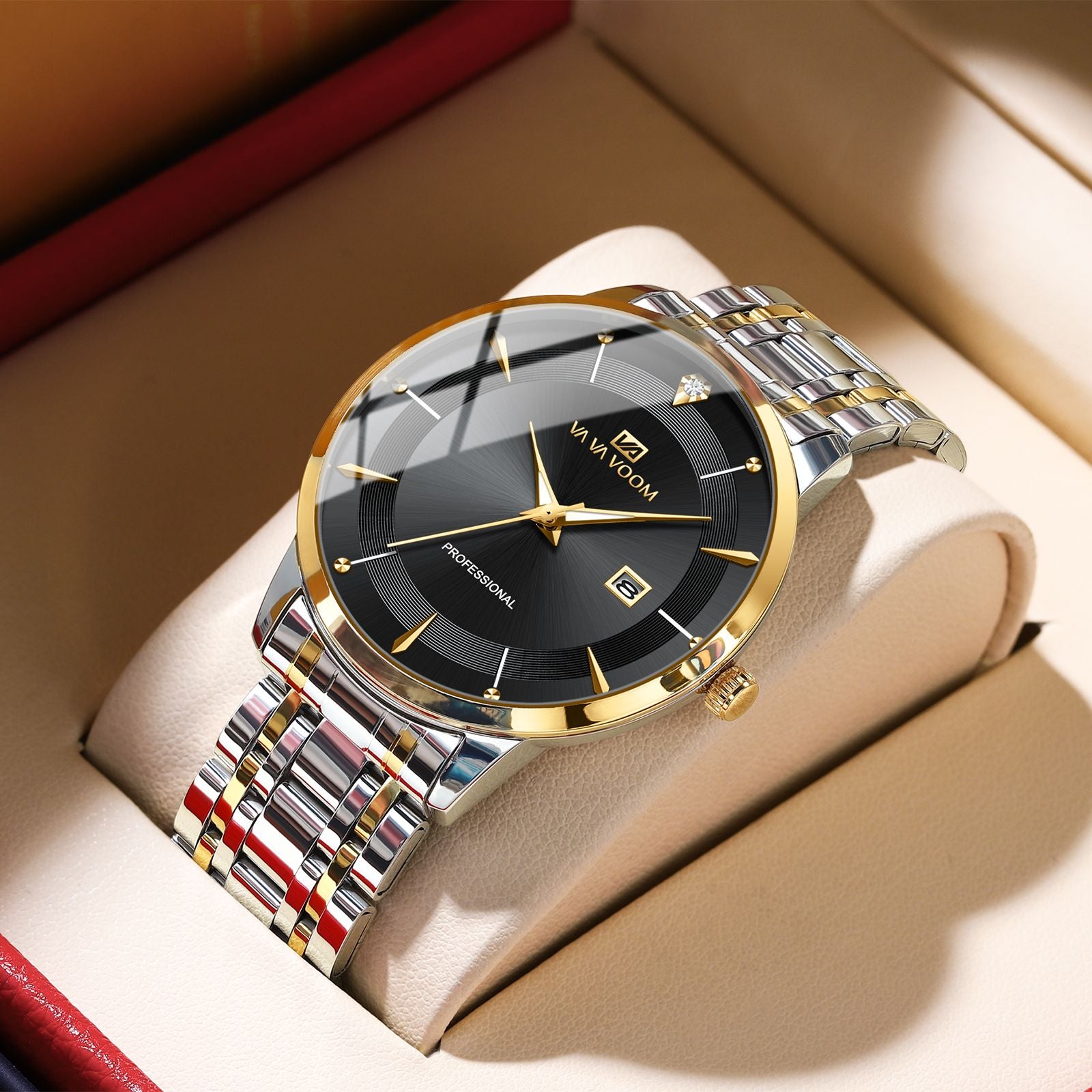 2024 New Men Watch Stainless Steel Business Style Luxury Rhinestone 43mm Blue Gold Quartz Movement Wristwatch Relogios Masculino