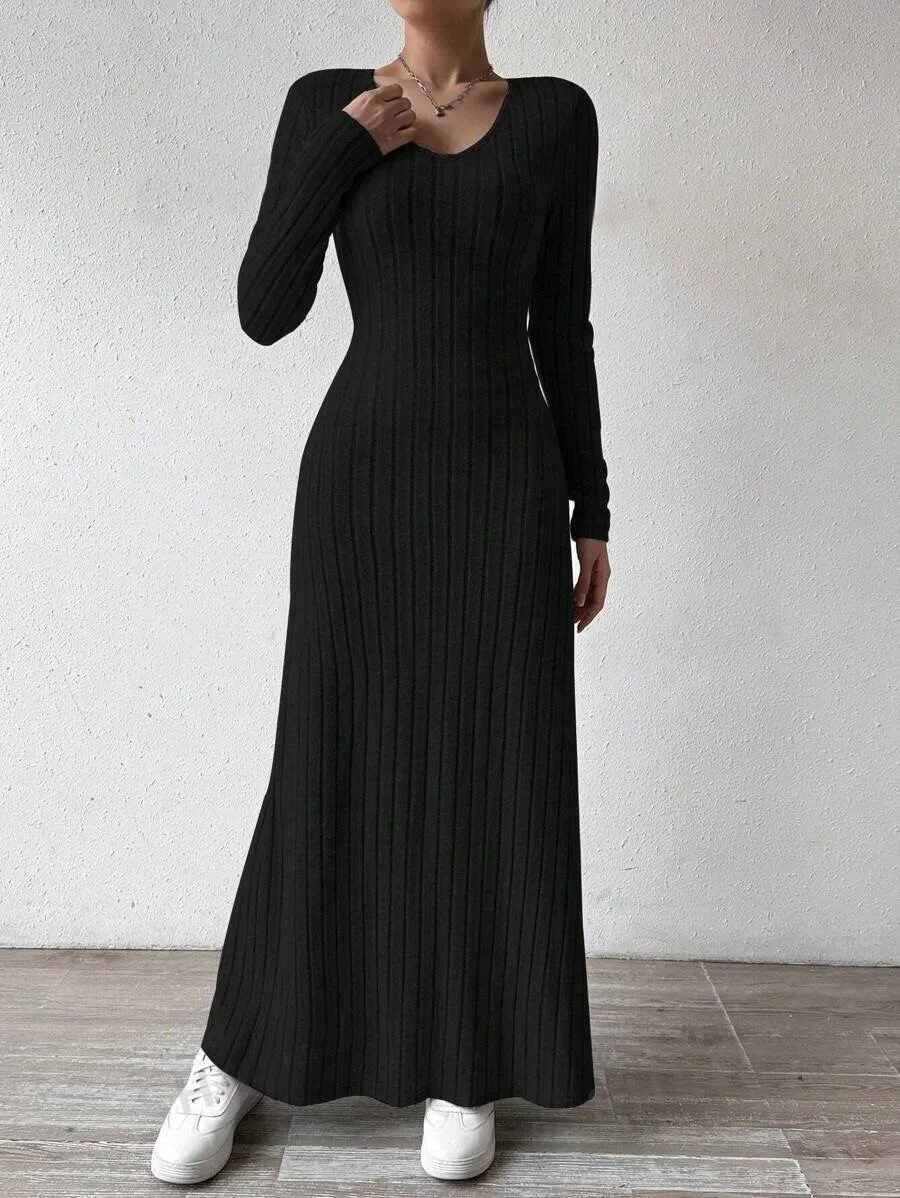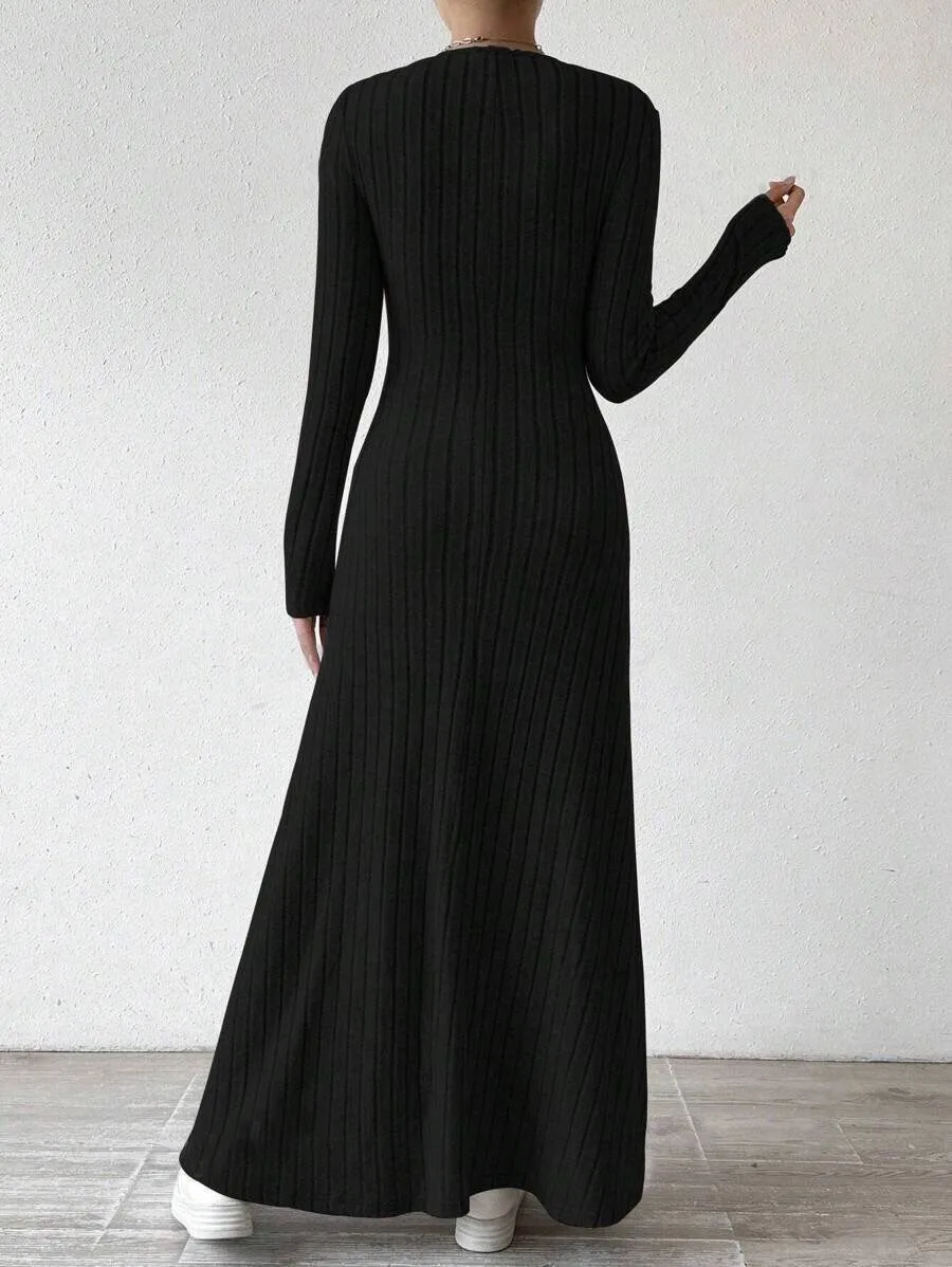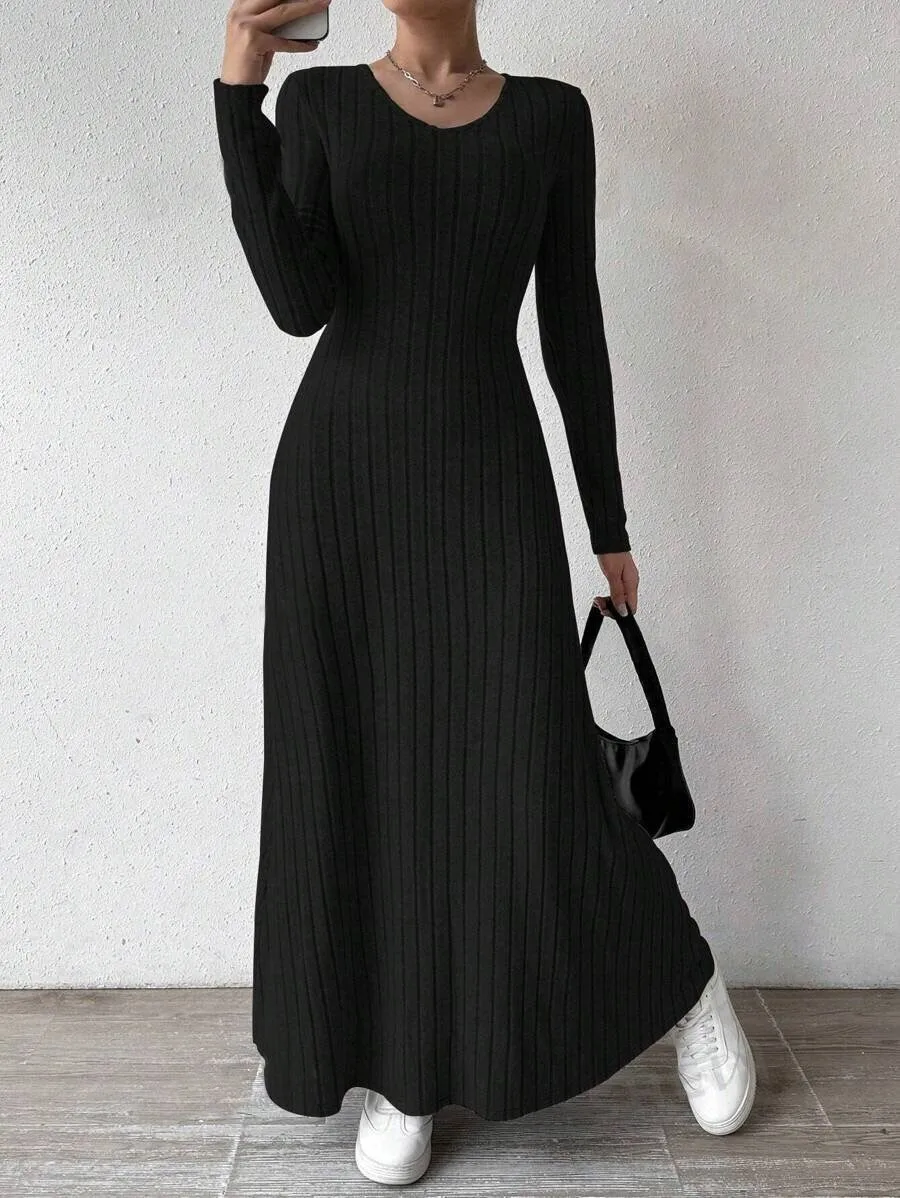 2025 Fashionable Knitted Long Sleeve A- Line Streetwear Dress For Women Smooths And Slims Your Silhouette Solid Color Long Dress