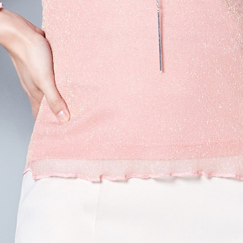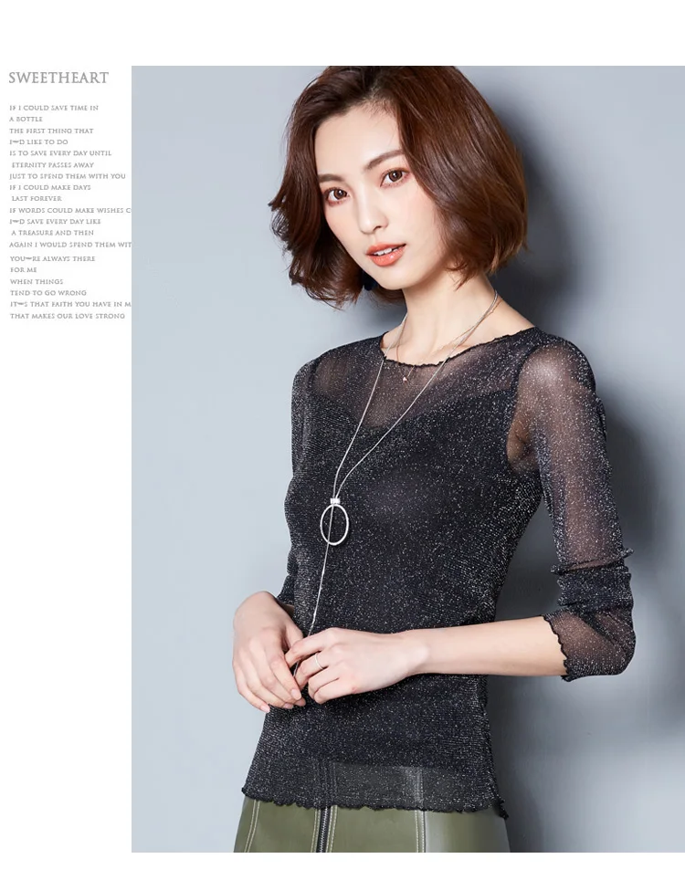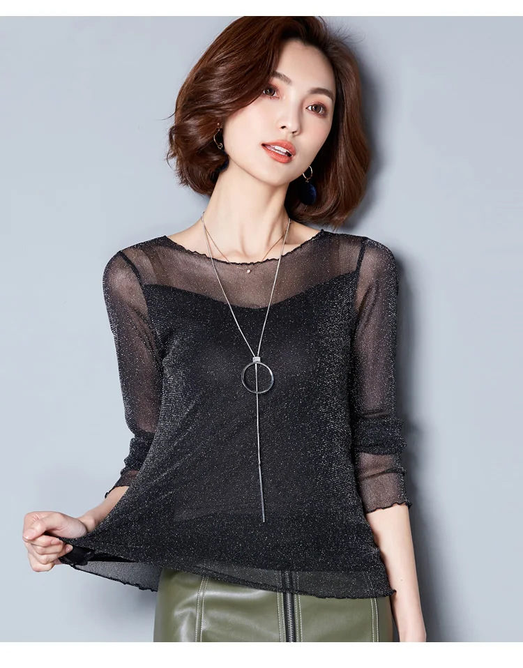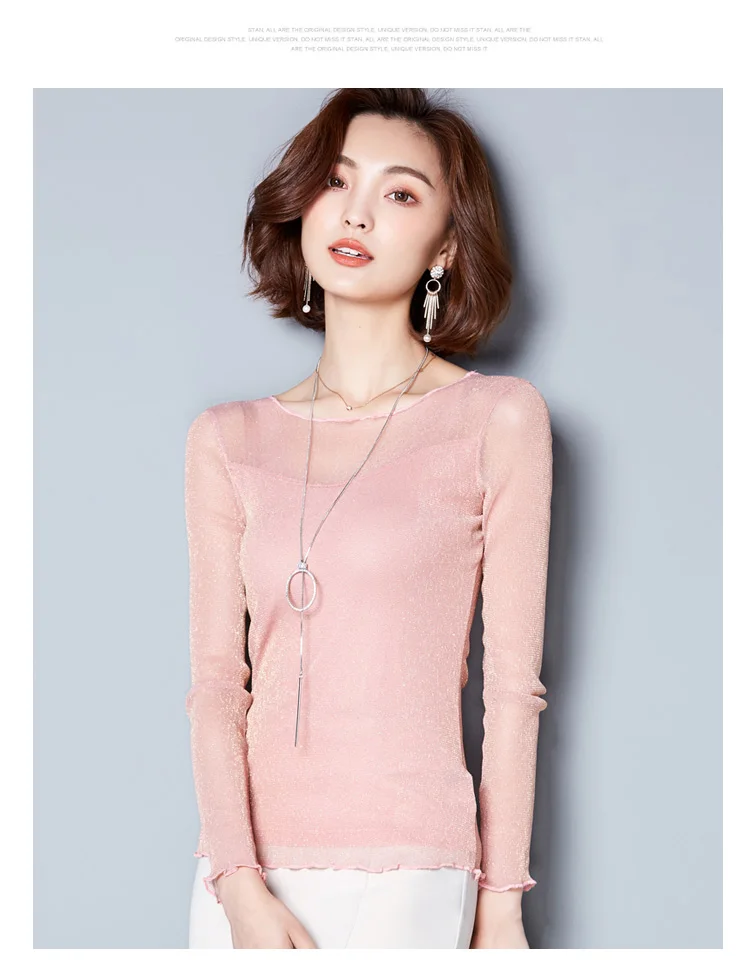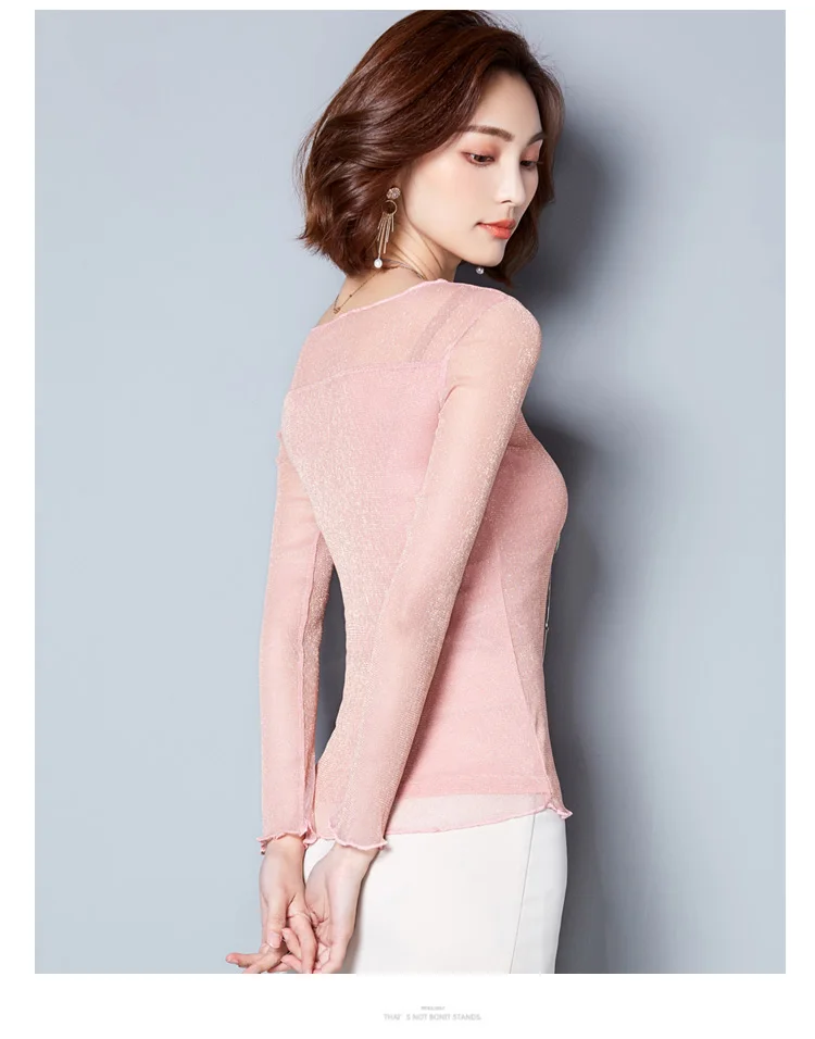 2025 Glitter Mesh Blouse Sexy Womens Shirts Long Sleeve Tops Korean Black Pink O-Neck Elegant Slim Blouse Camisas Femininas