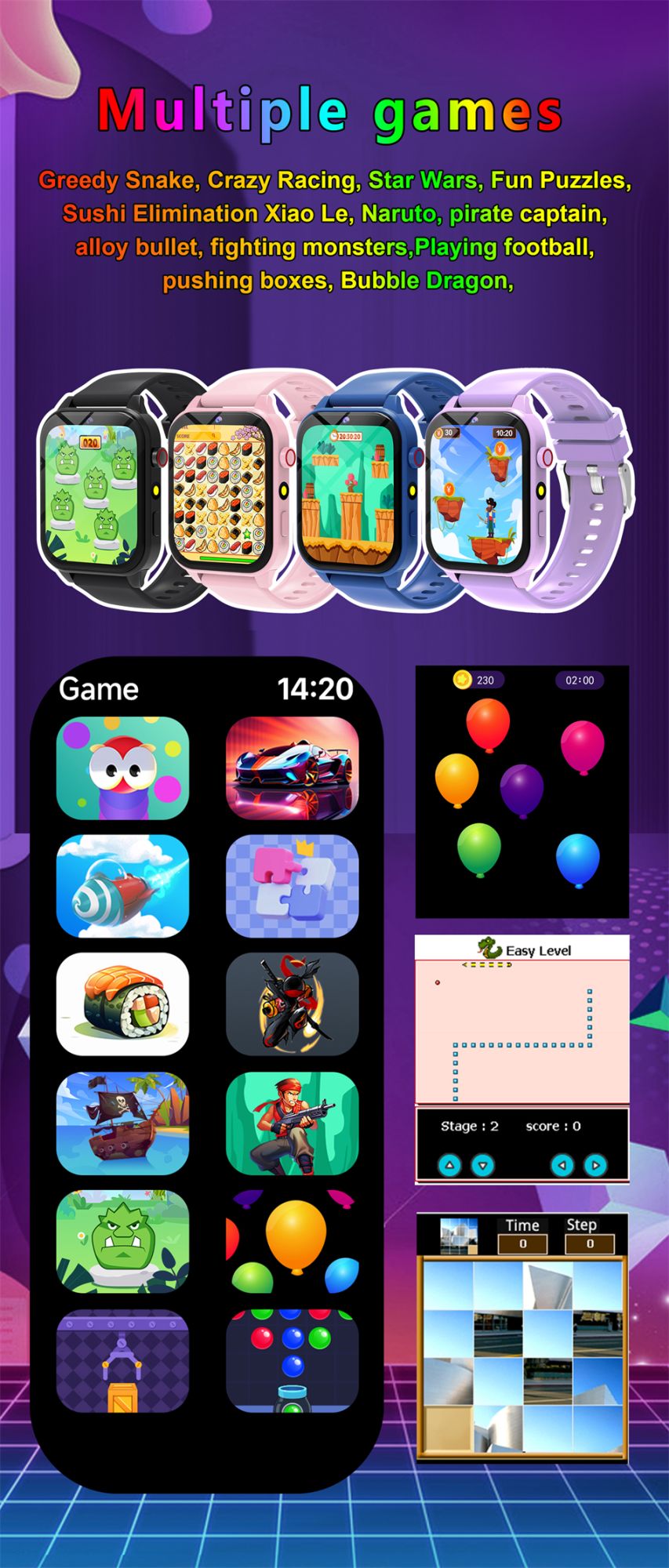 Sleep monitoring, alarm reminder, photography, photo album, games, calendar, pedometer, countdown, calculator, stopwatch, flashlight, pedometer, with front camera, 18 games (Snake, Crazy Racing, Star Wars, Fun Puzzle, Sushi Puzzle, Naruto, Pirate Captain, Metal Bullet, Monster Fight, Ball Fight, Box Push, Bubble Dragon, etc.)