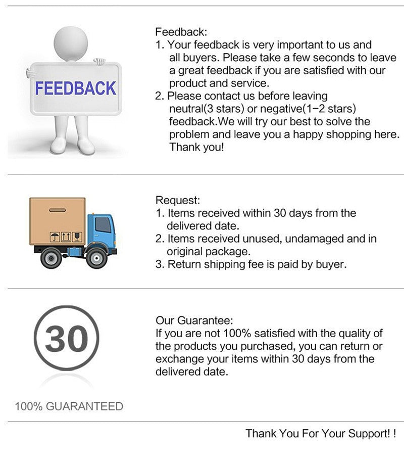 2. If you are not satisfied our porducts, pls contact us before you leave negative feedback. We guarantee we will make every attempt to resolve the issue. Thank you.
