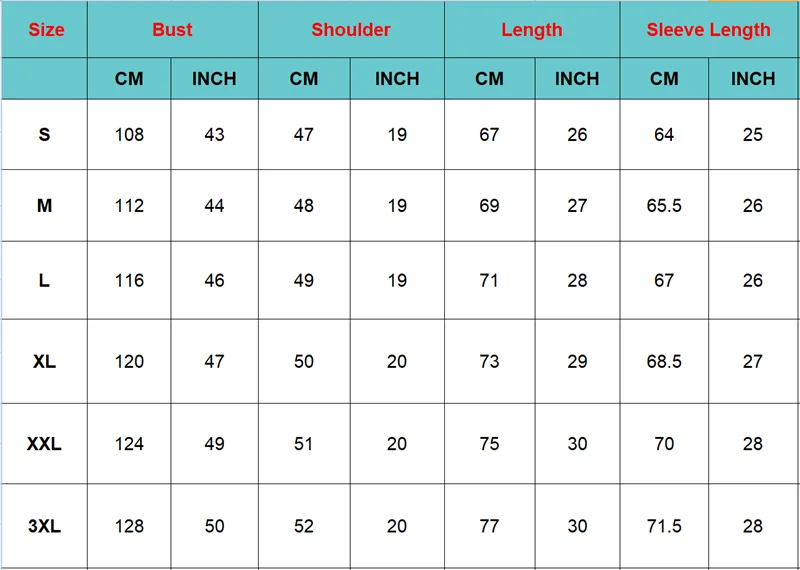 (There are 1-3cm margin of error, If you are not sure the size, Please send the information of your Height, Weight and Chest to me, I will help you choose the correct size. )