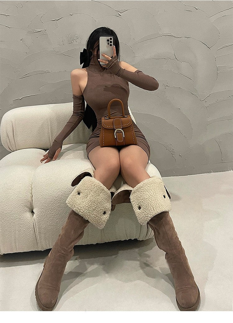 2025 New Women's Mini Dress Sleeveless Pleated Skinny Dress High Neck Lace Up Au