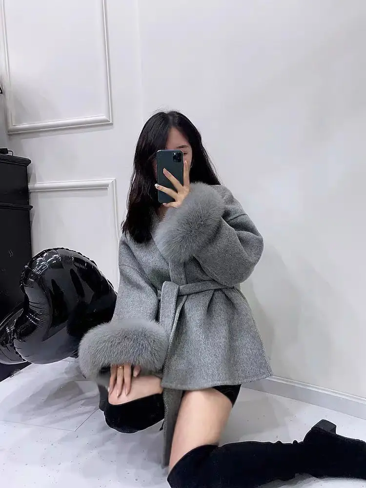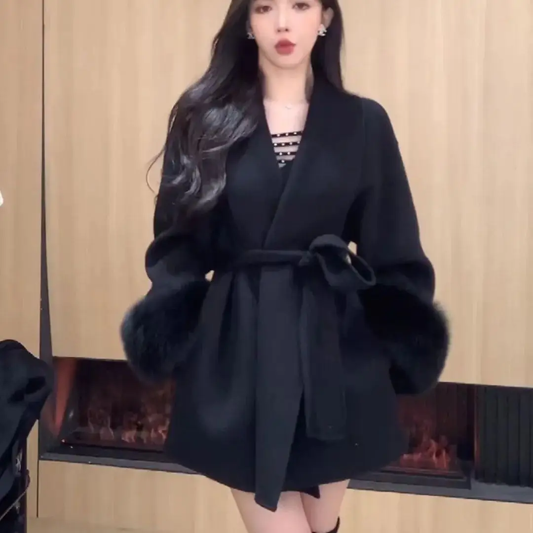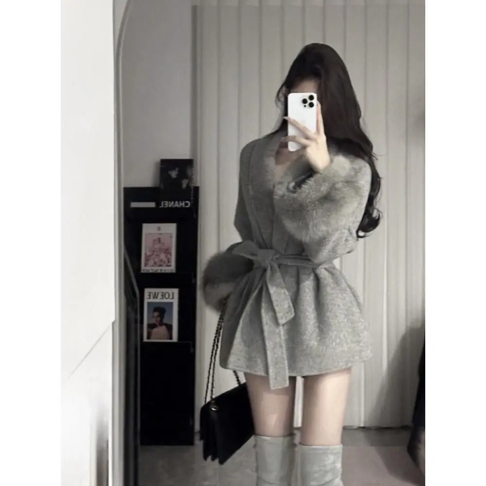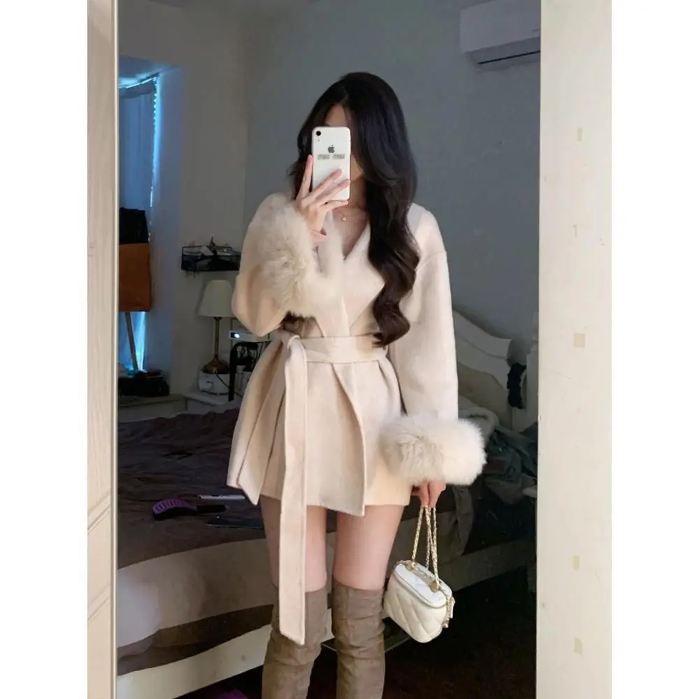 2025 Retro Elegant Lace Up Woolen Casual Overcoat Women Harajuku Loose Warm Plush Long-sleeved Autumn Fashion New Street Jacket