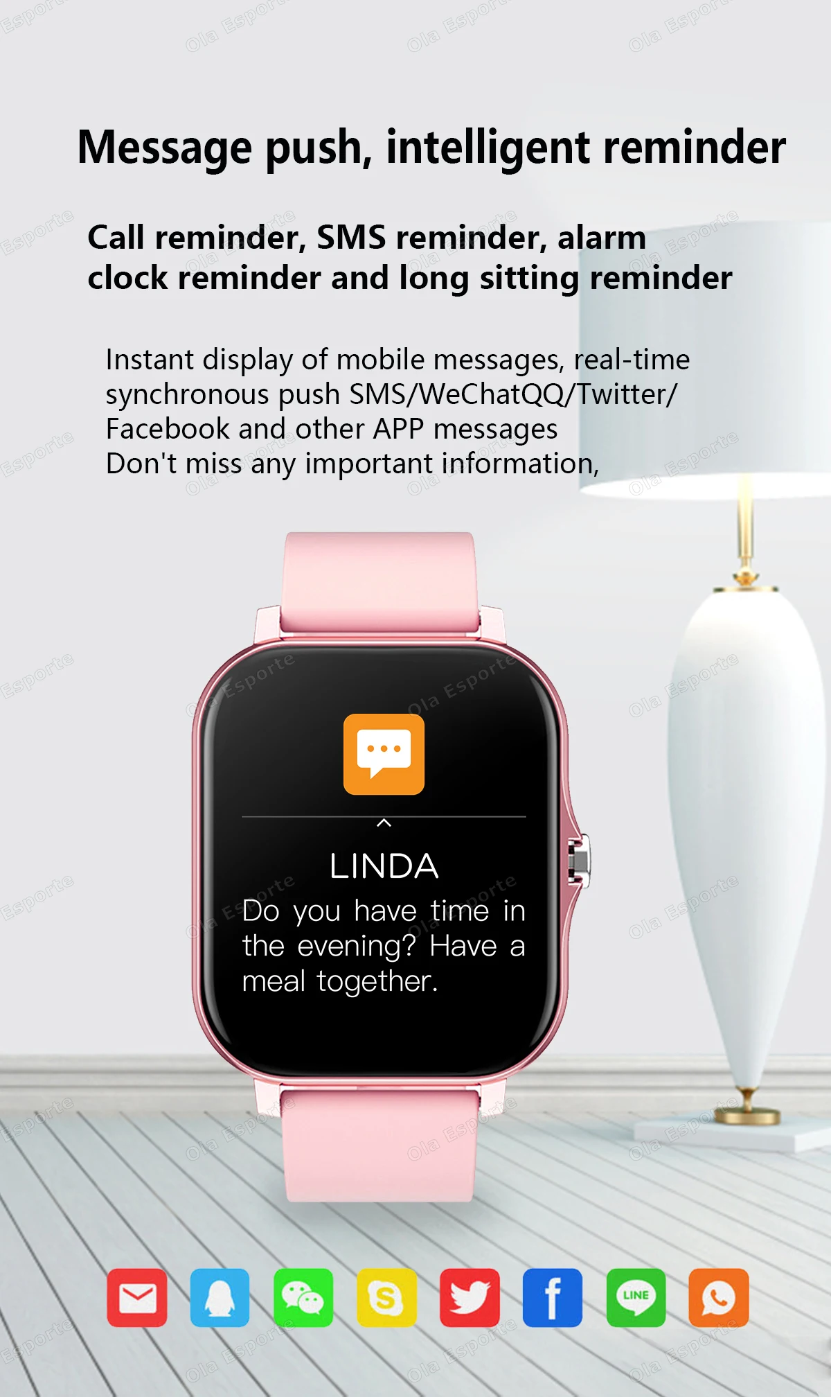9.Other functions: pedometer,sedentary reminder, Calendar,motion tracker,alarm clock,weather push, stopwatch, timer, stopwatch,calculator, World clock, camera remote control, find your phone.
