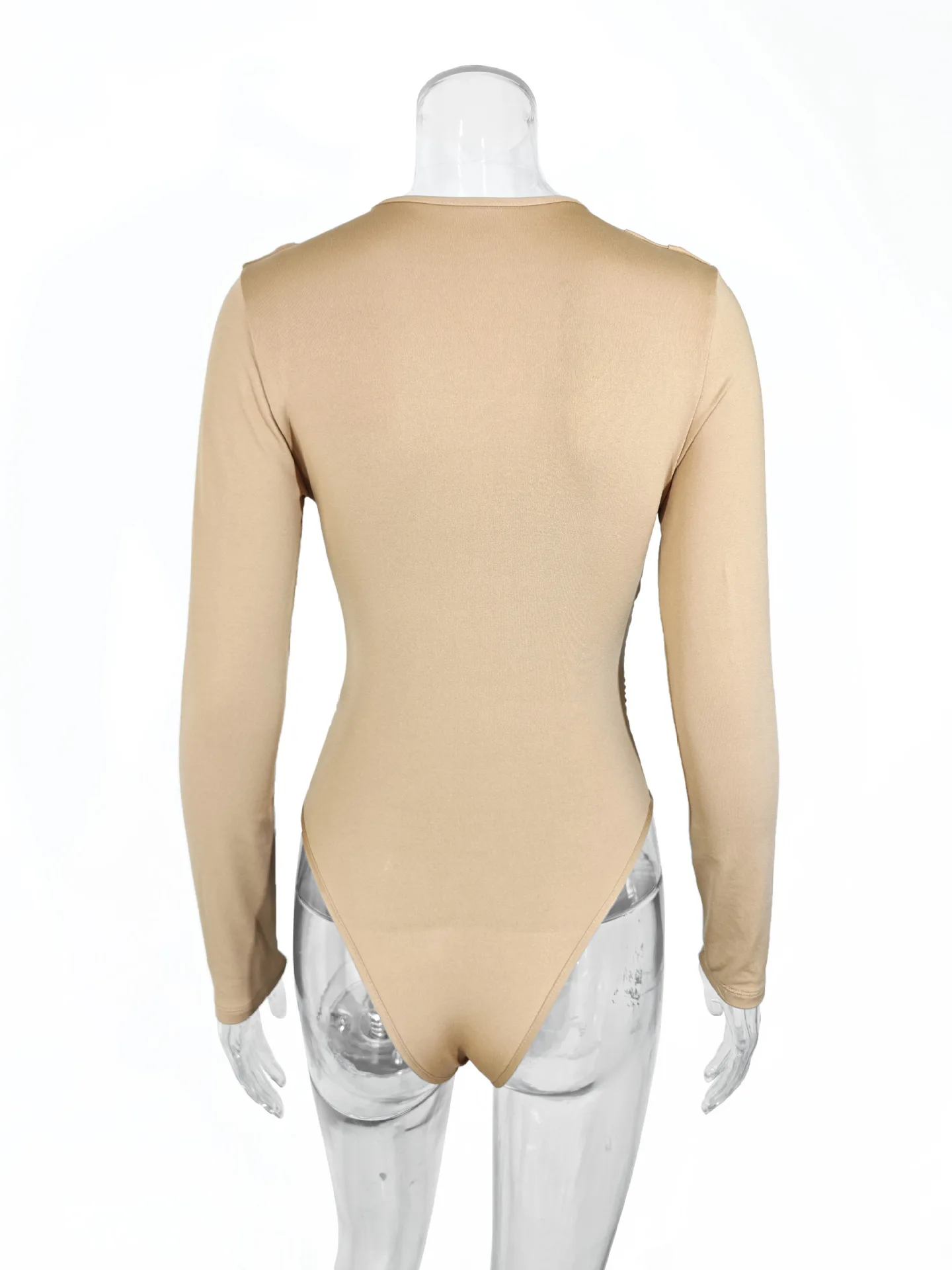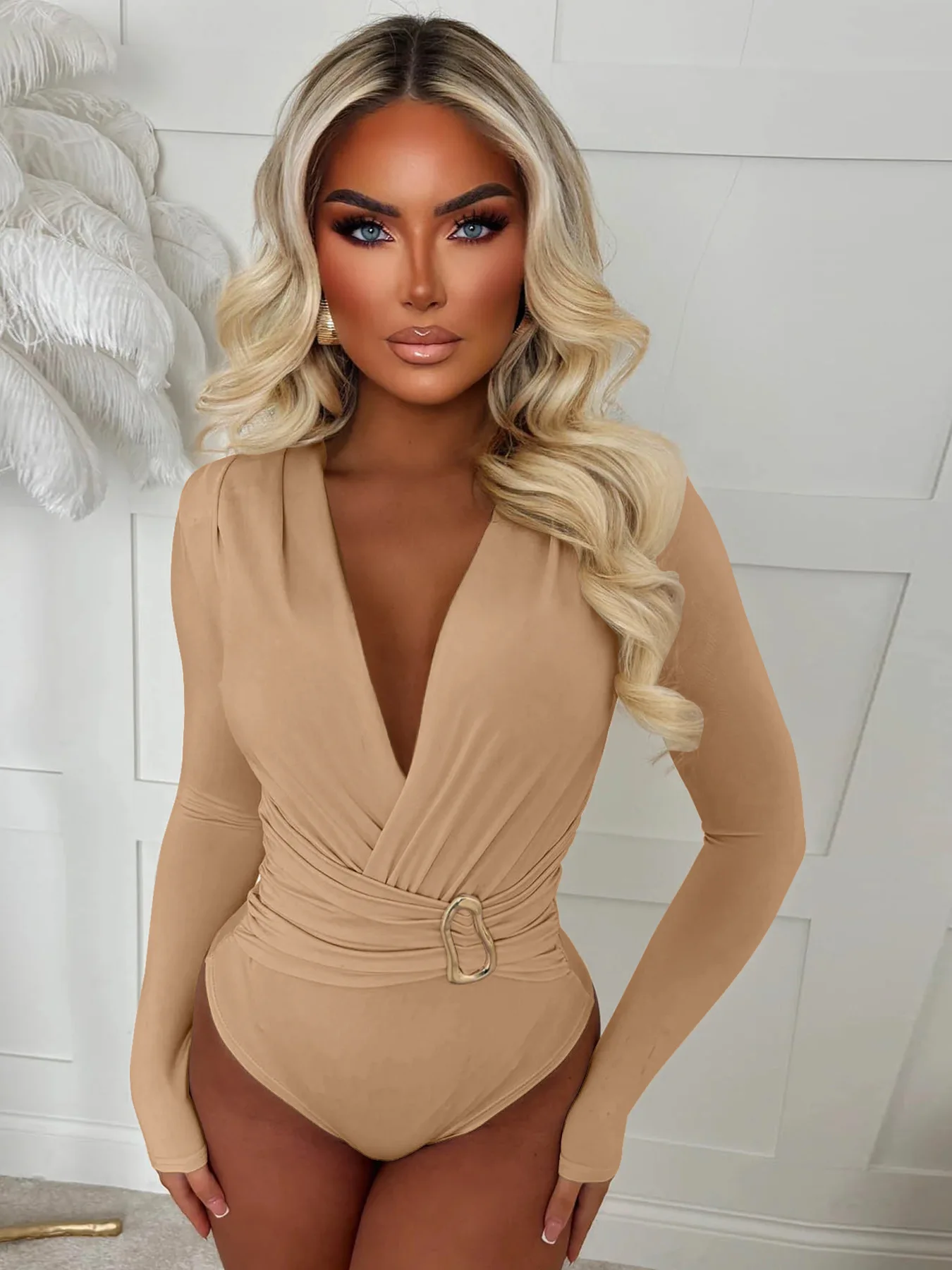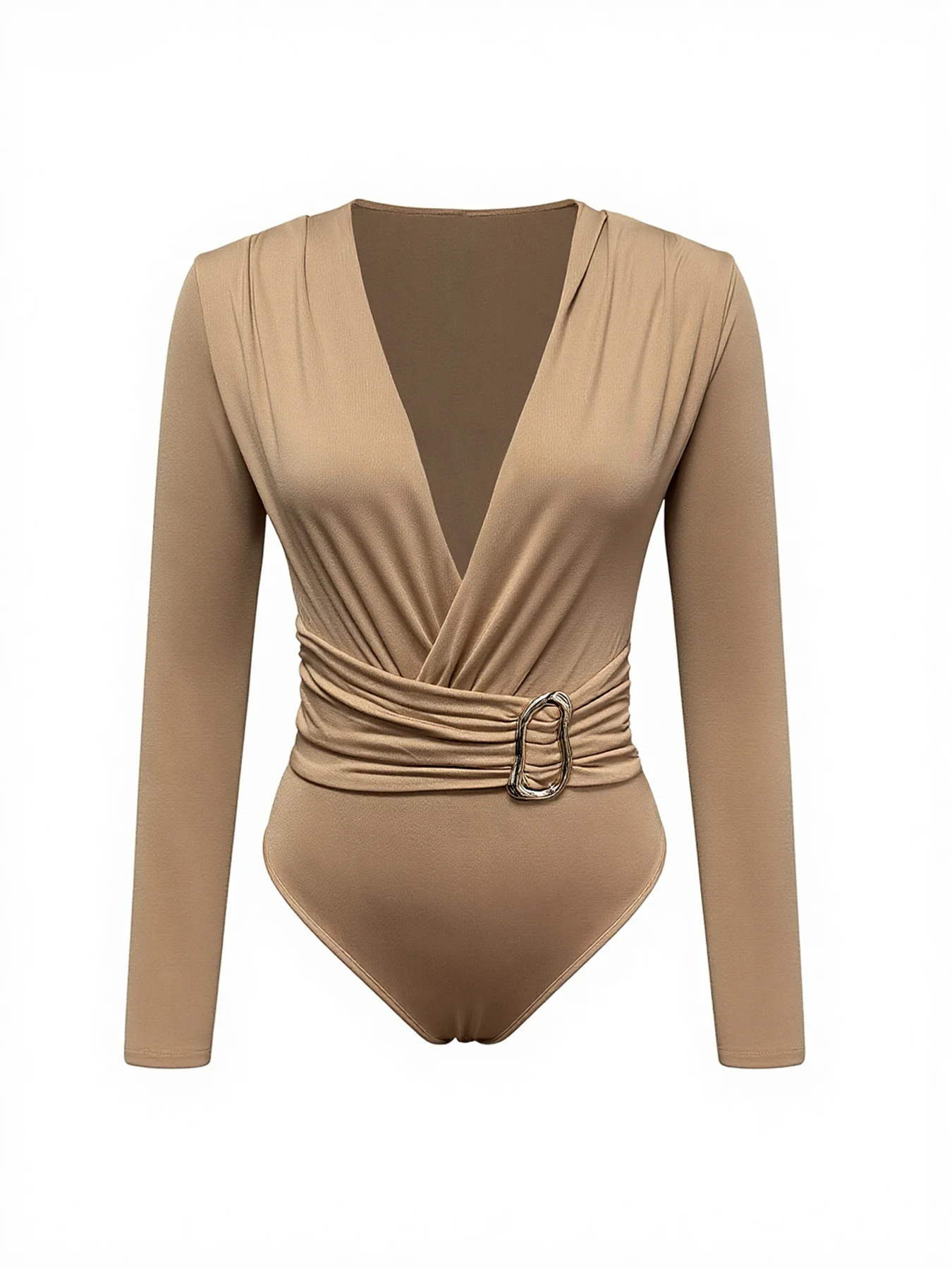 2025 Spring Autumn Deep V Neck Long Sleeve Bodysuits Women Fashion Solid Slim Fit Pleated T-Shirt Casual Female Jummsuits Tops