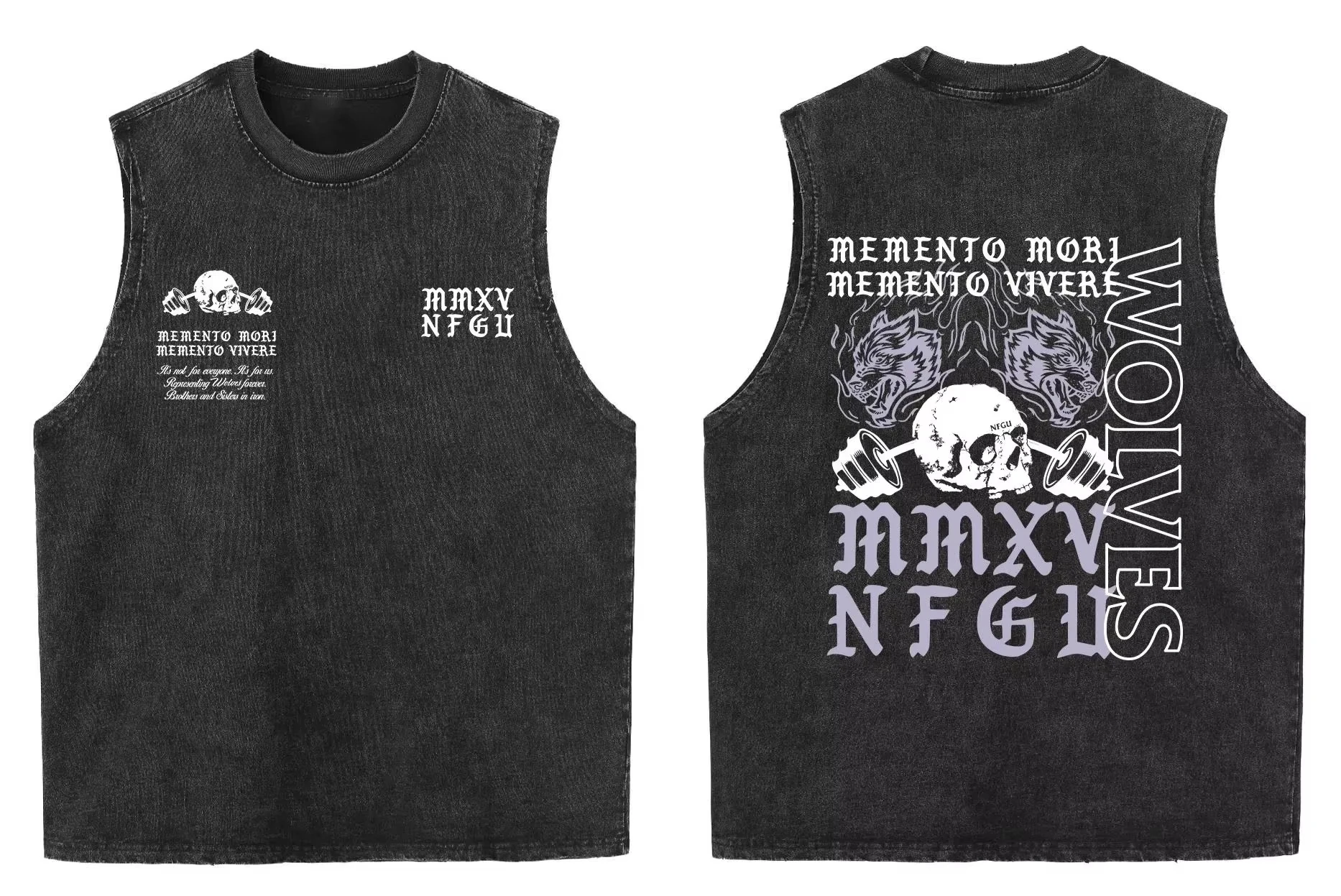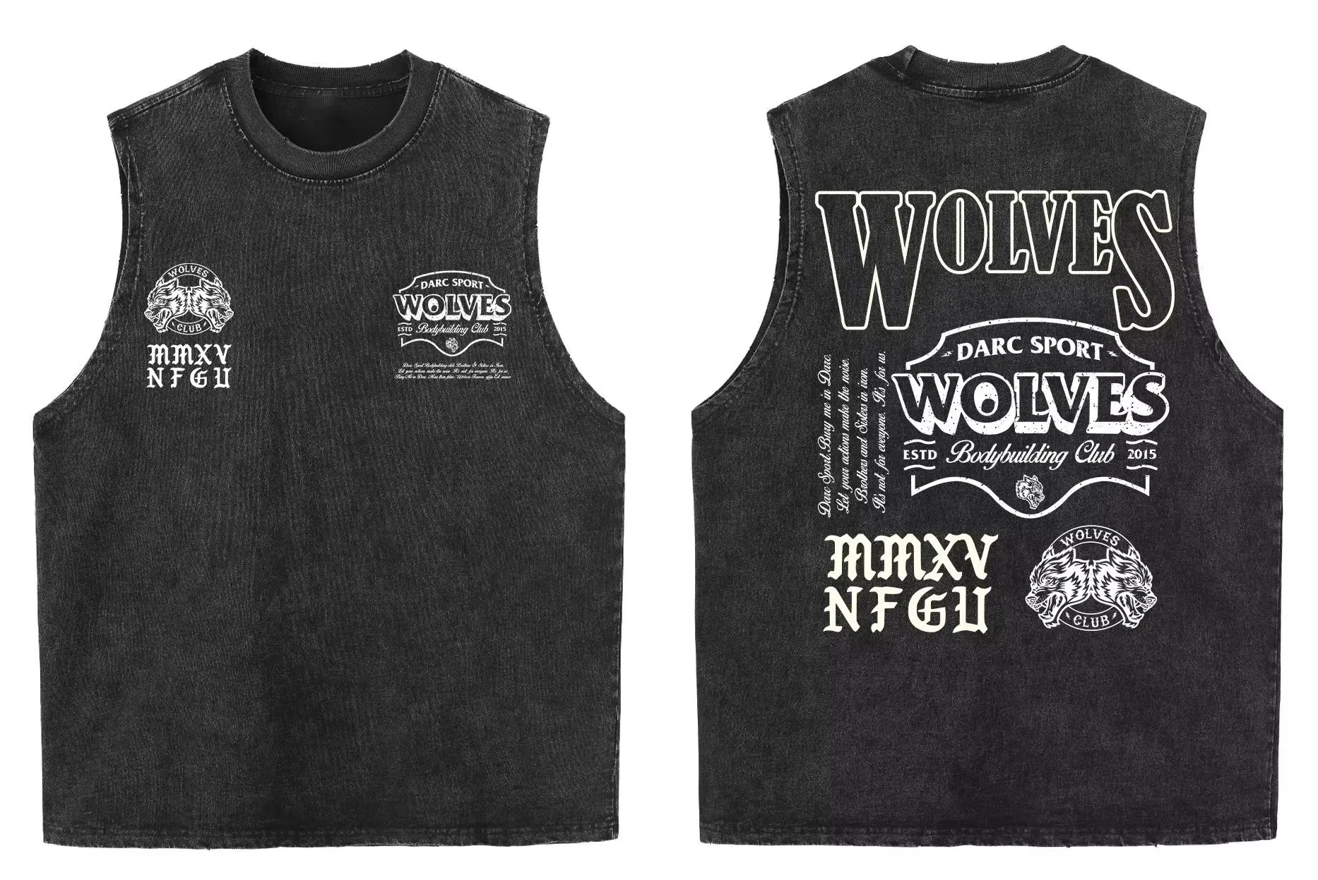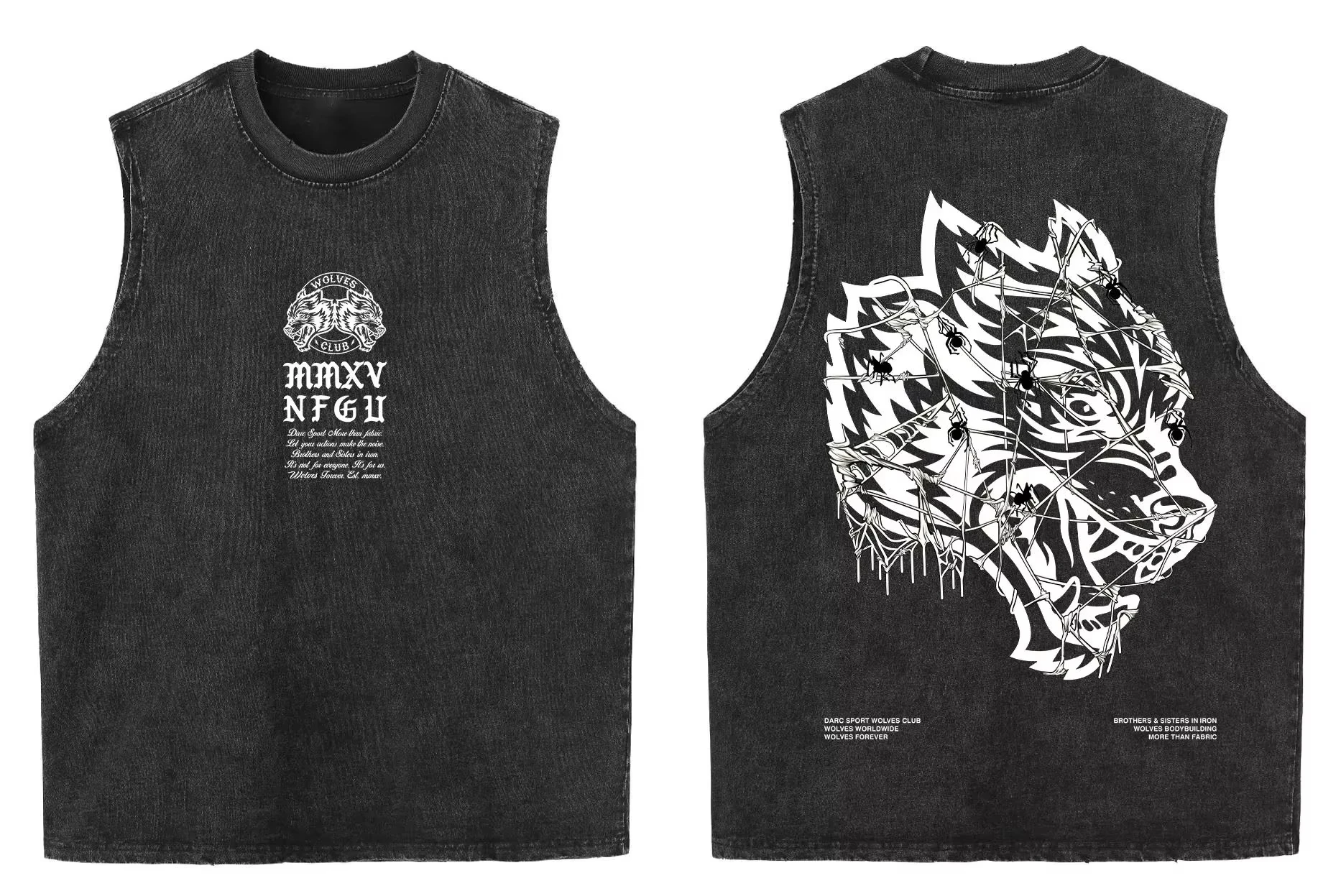2025 summer American vintage Washed men's T shirt Wolf Head Print Tank Top Gym Fitness Sleeveless T shirt Exercise Vest Women